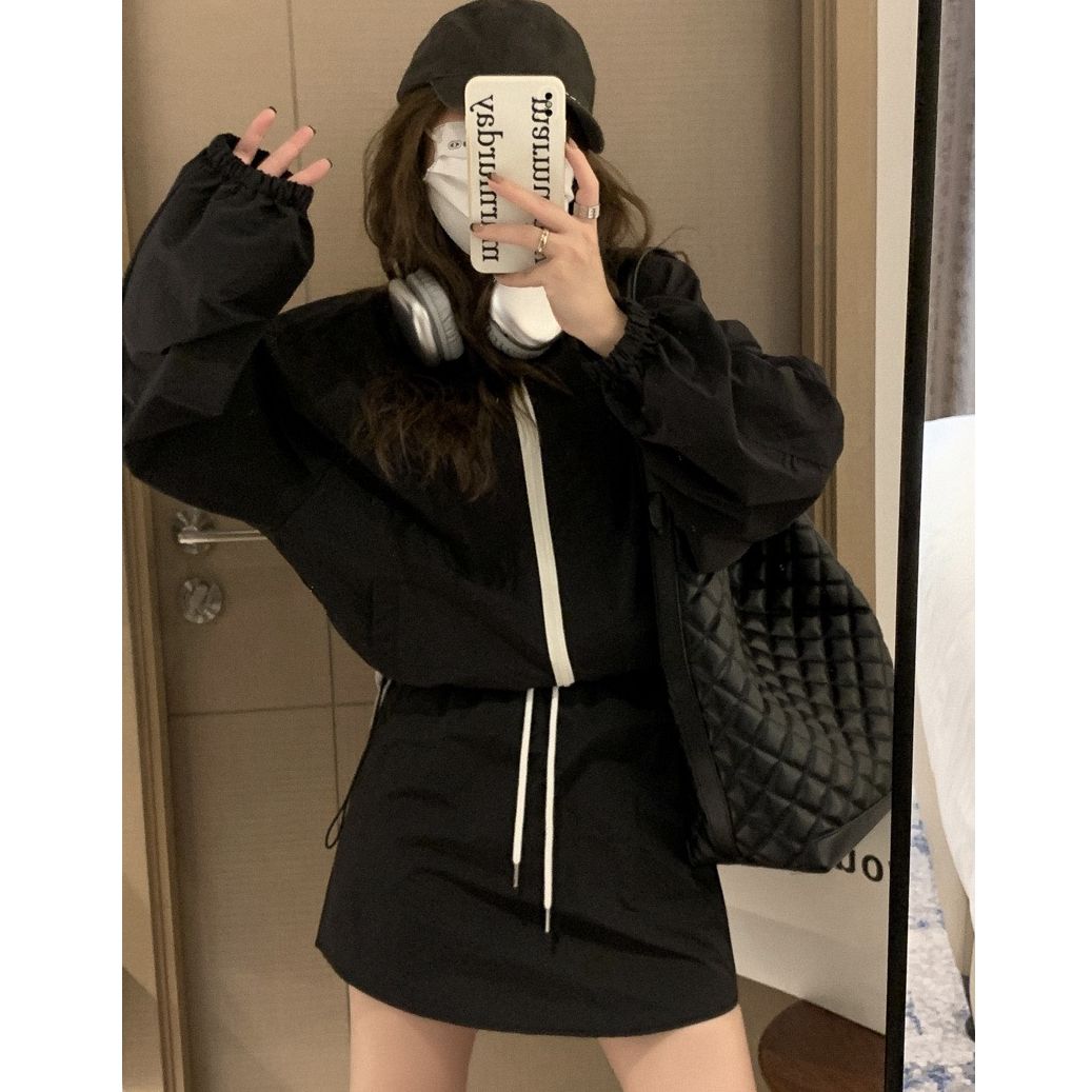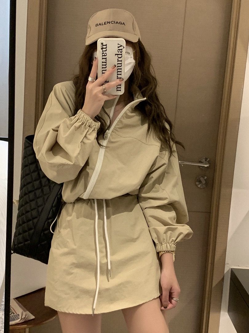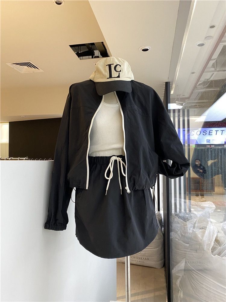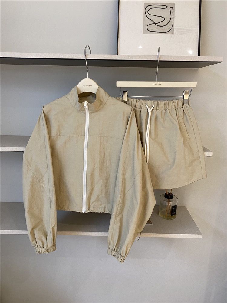 2026 봄 여름 새로운 캐주얼 자외선 차단 얇은 스타일 세트 루즈핏 작은 쇼트 스타일 긴팔 스탠드 칼라 재킷 펌프 로프 미니 스커트 여성