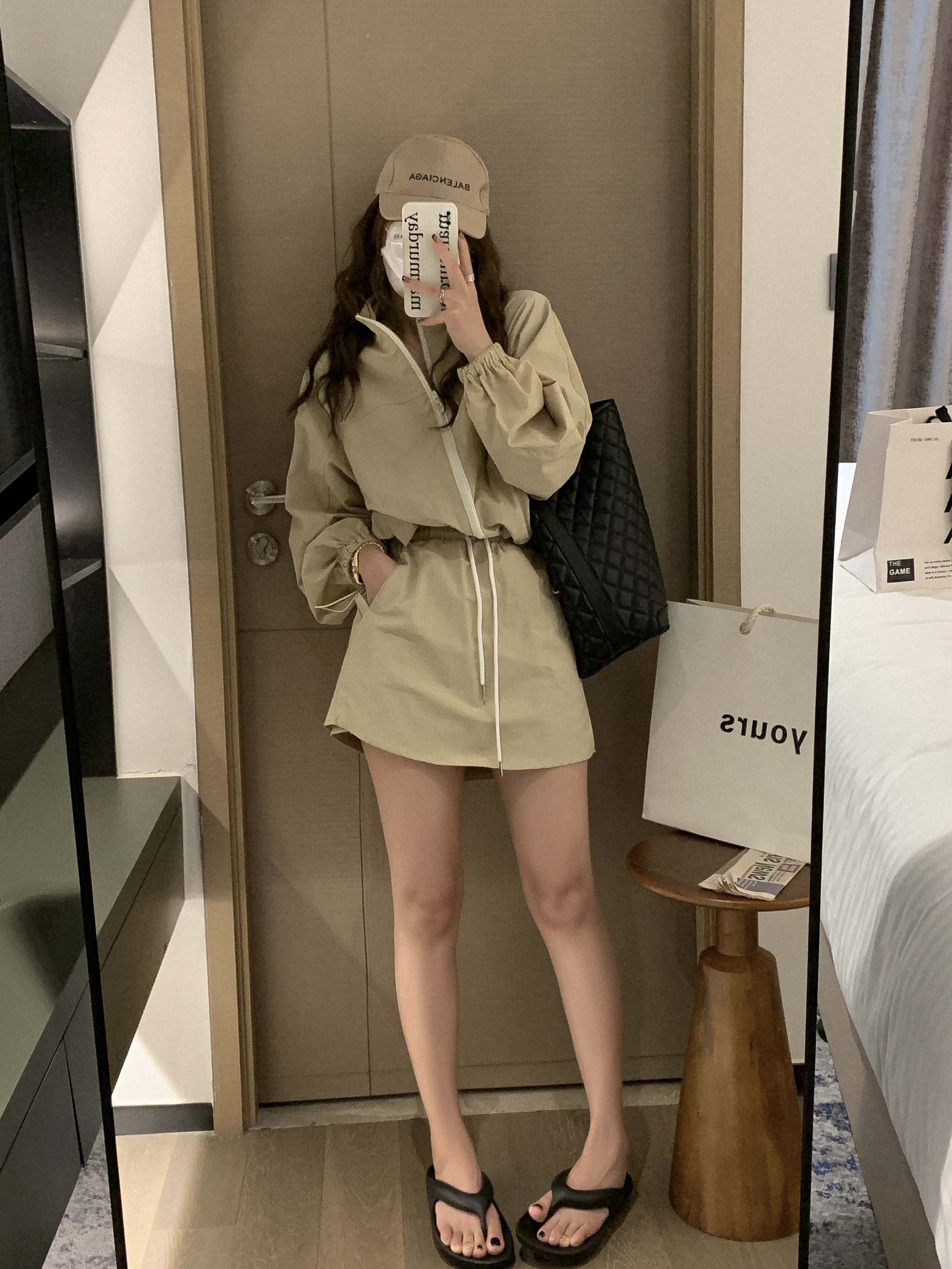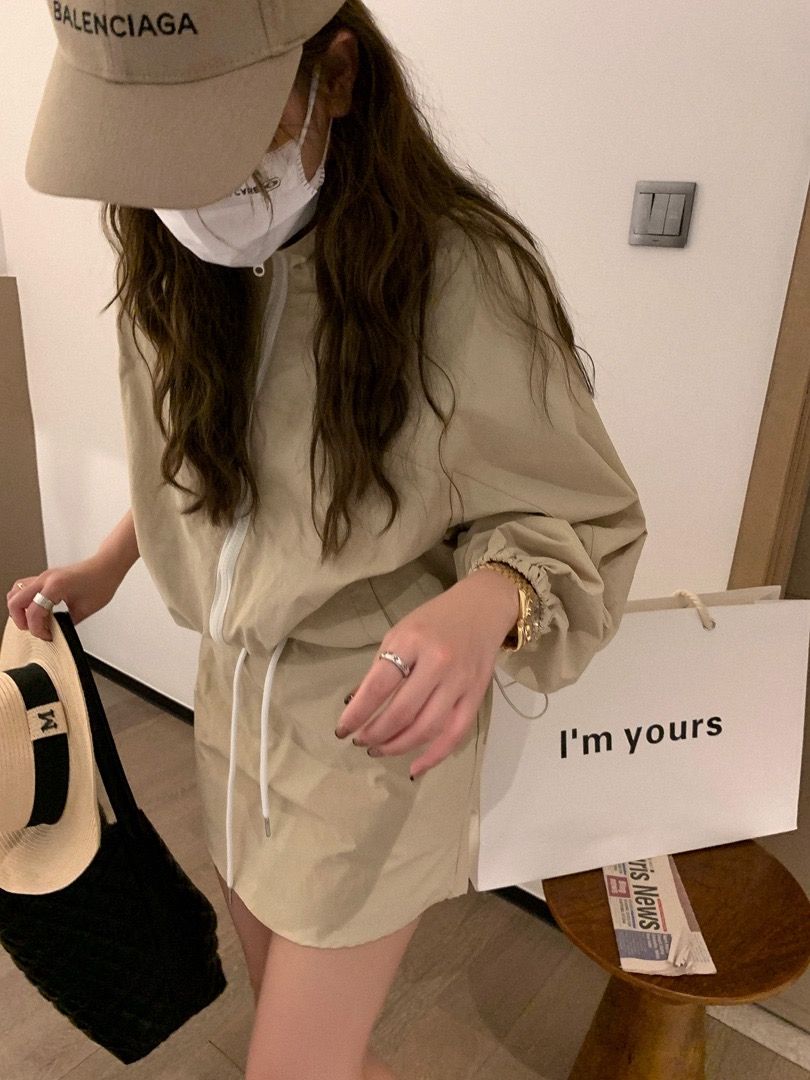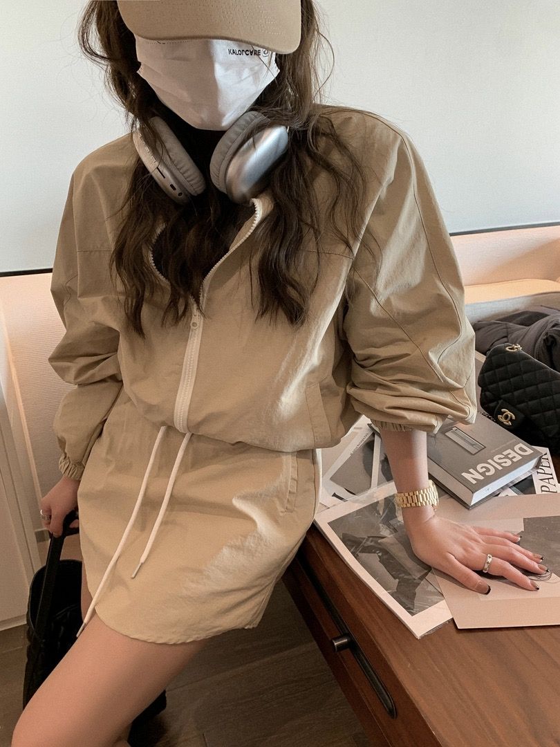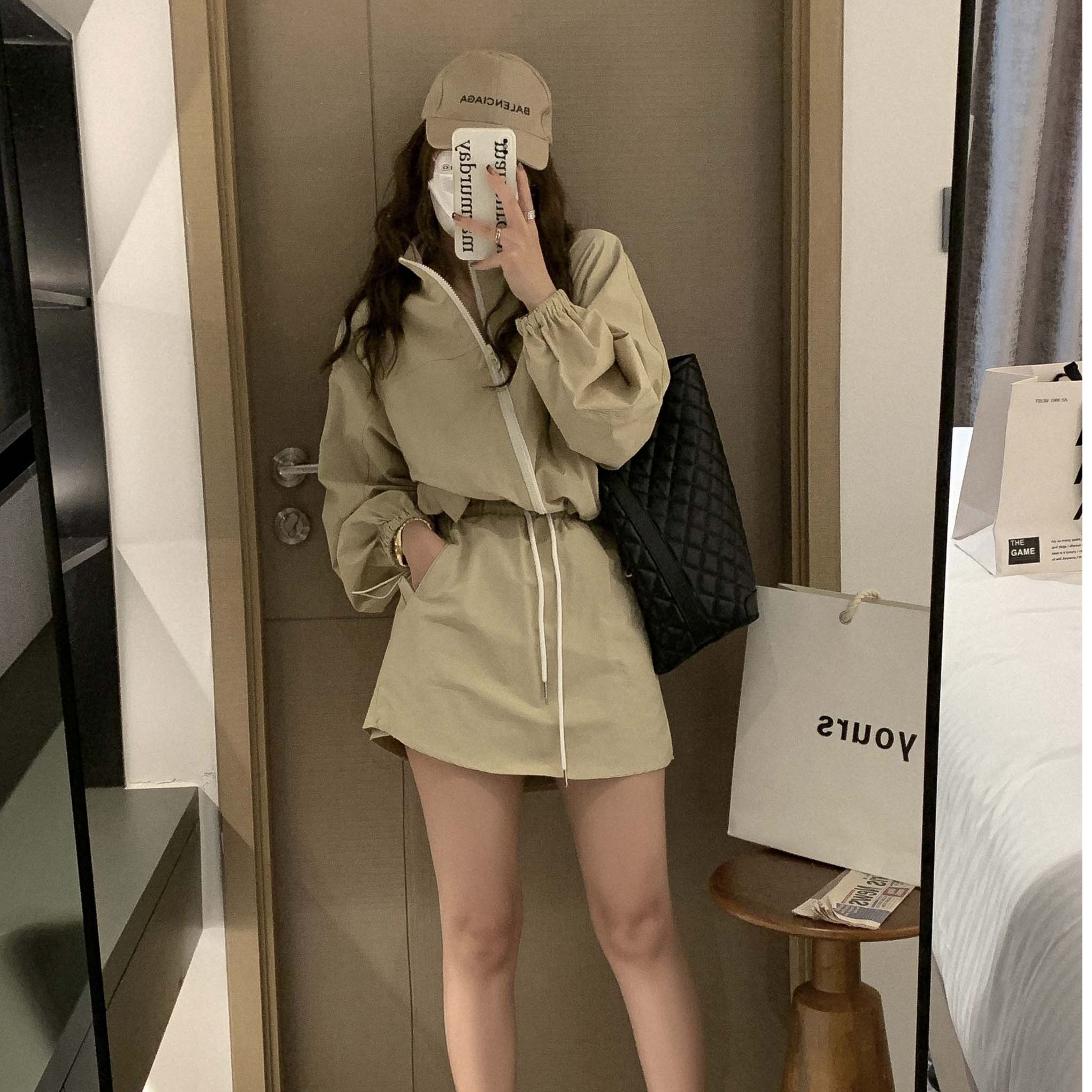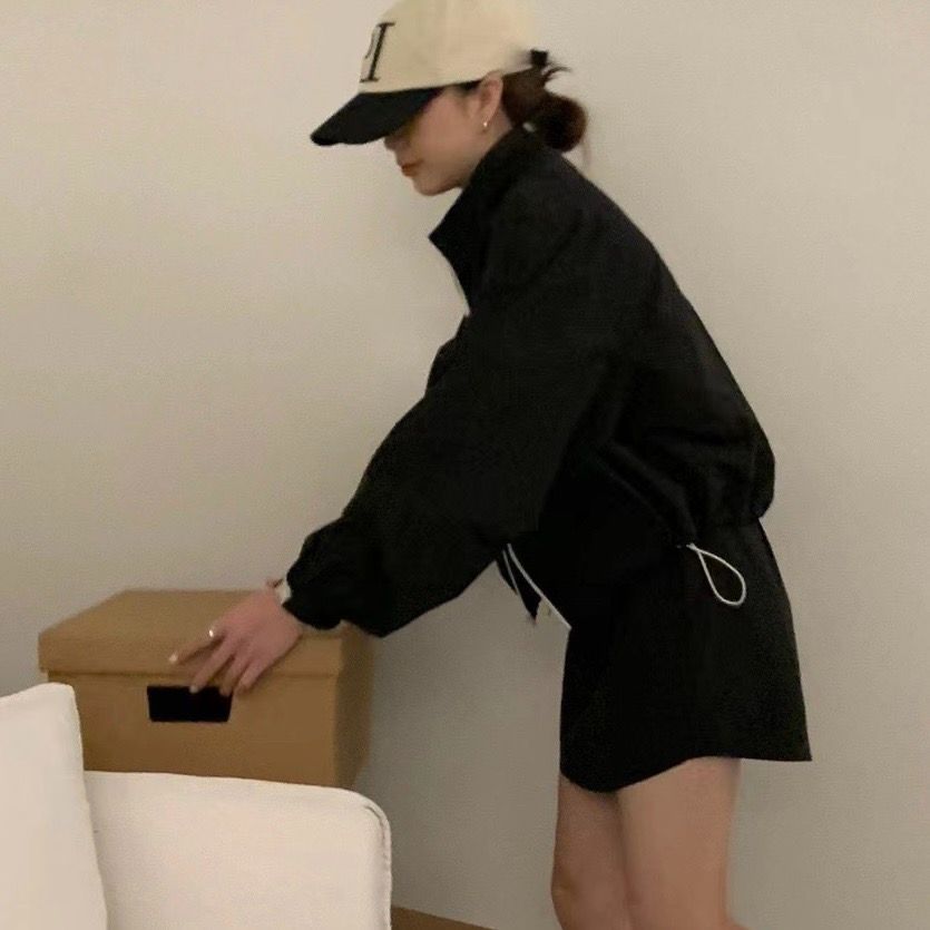한국 chic 여름 미니멀리즘 품격 펌프 로프 후드 지퍼 자외선 차단 재킷 레이스업 하이웨이스트 운동 반바지 여성
