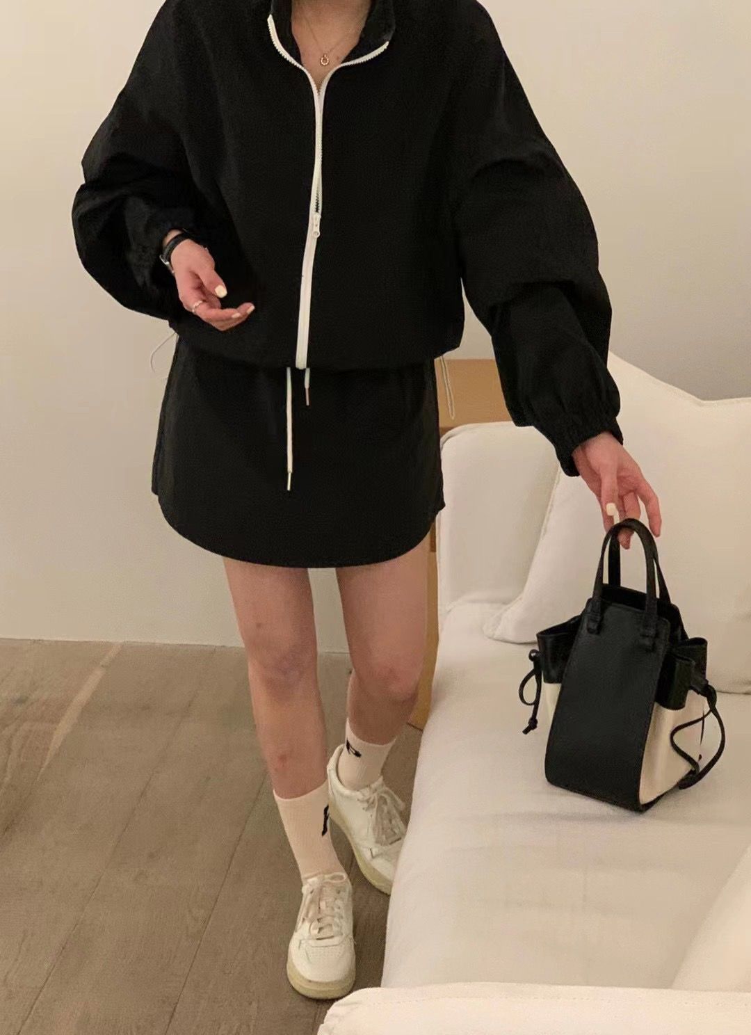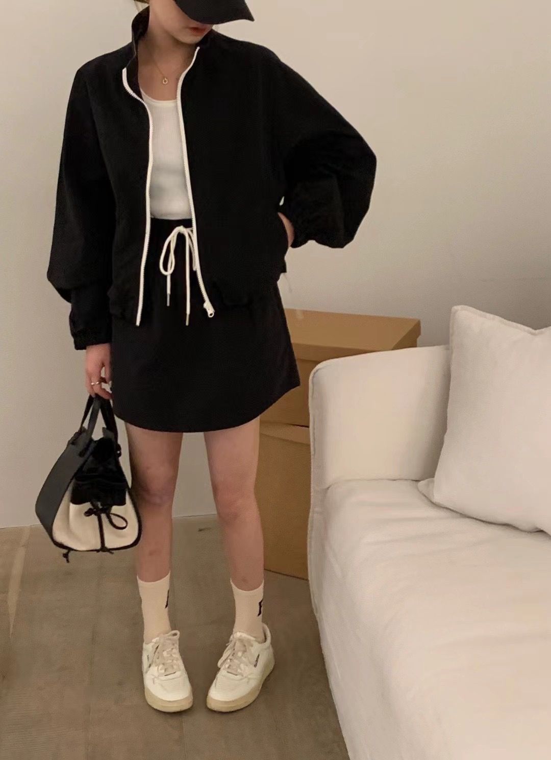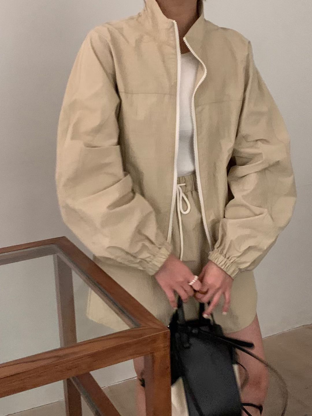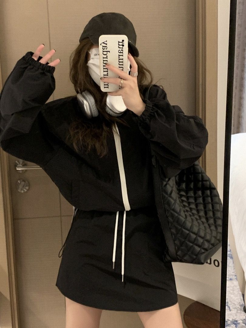 한국 chic 여름 미니멀리즘 품격 펌프 로프 후드 지퍼 자외선 차단 재킷 레이스업 하이웨이스트 운동 반바지 여성