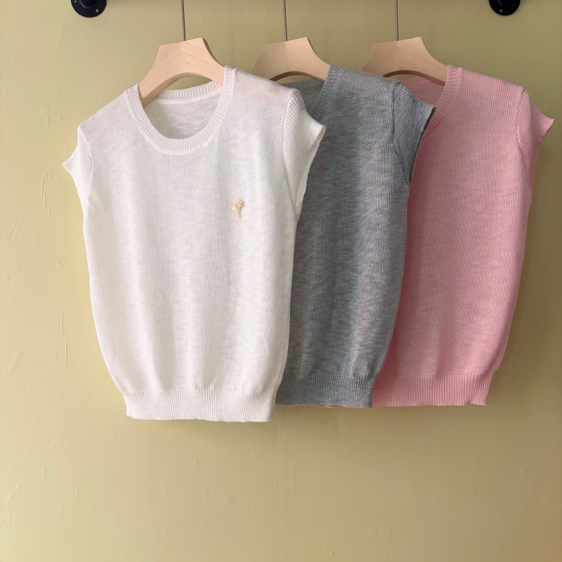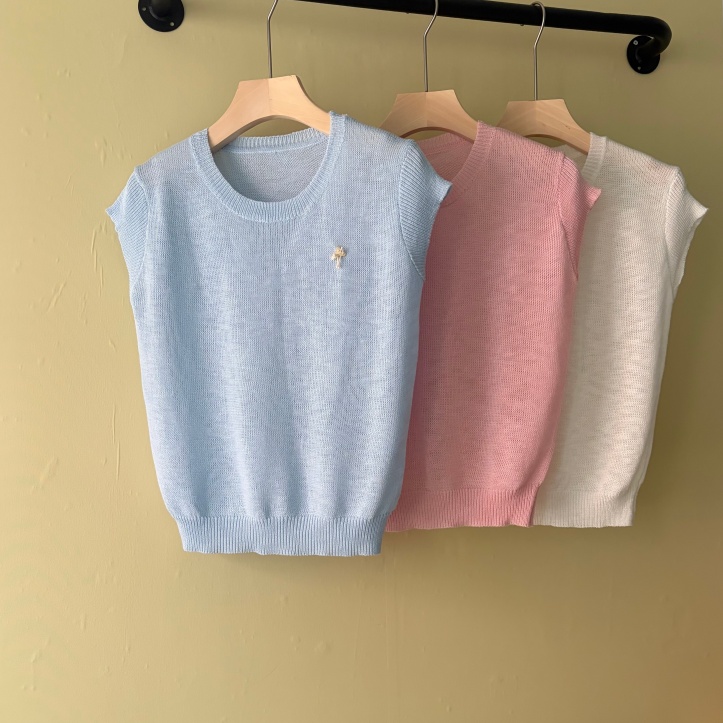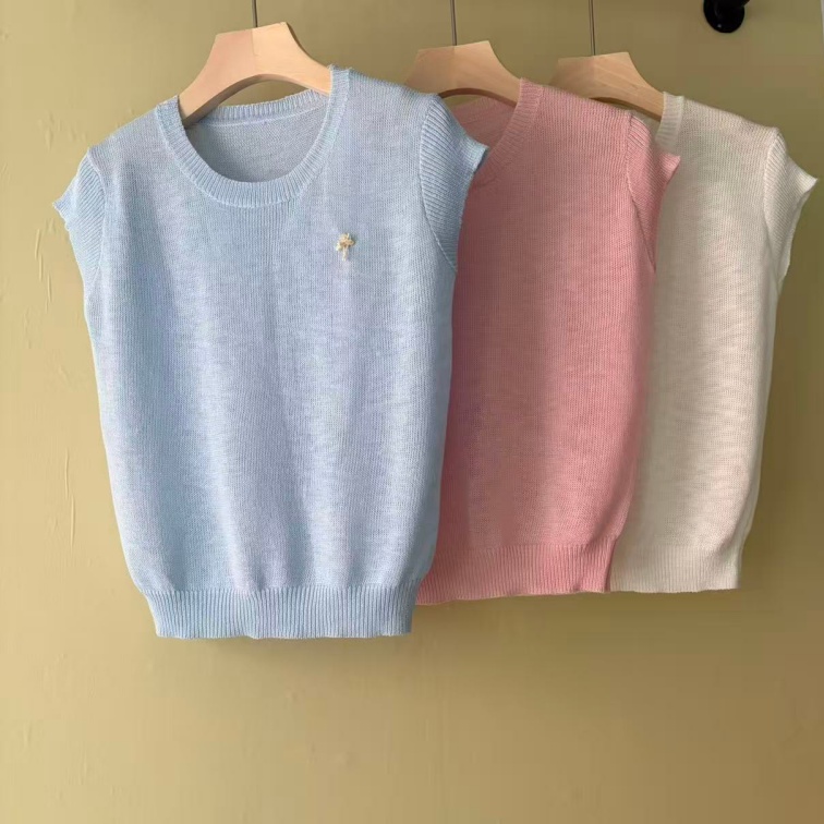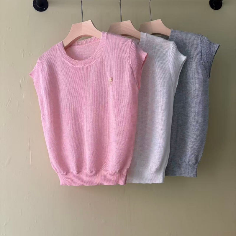 mz 작은 키 레이스 꽃 장식 항공기 소매 26 여름 신제품 아마 라운드 넥 여성 티셔츠 니트 스웨터