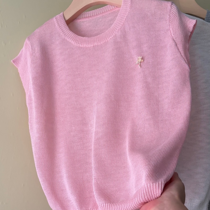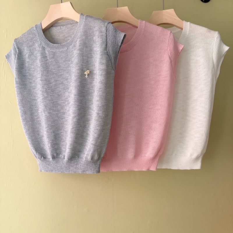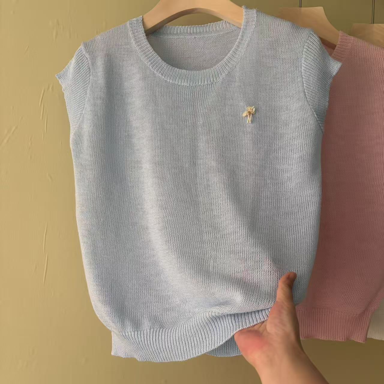 라운드 넥 2026 여름 신제품 반팔 자수 장식 티셔츠 니트 통기성 풀오버