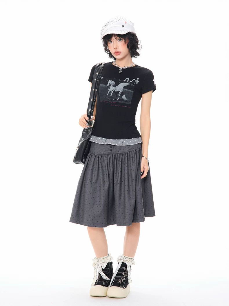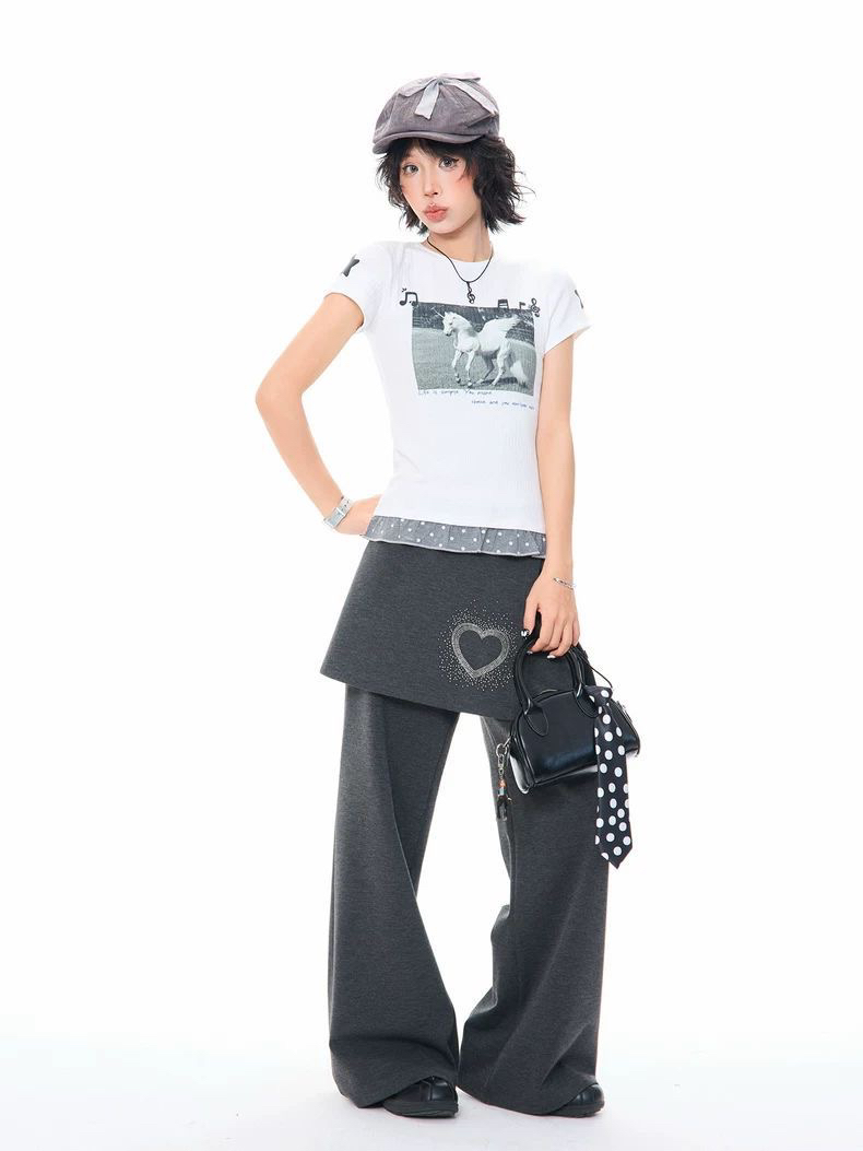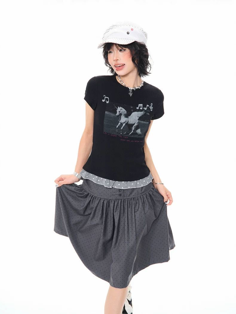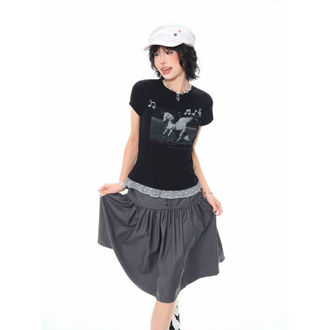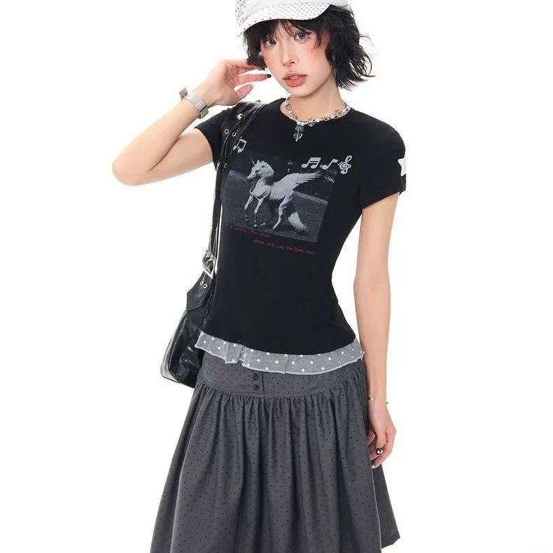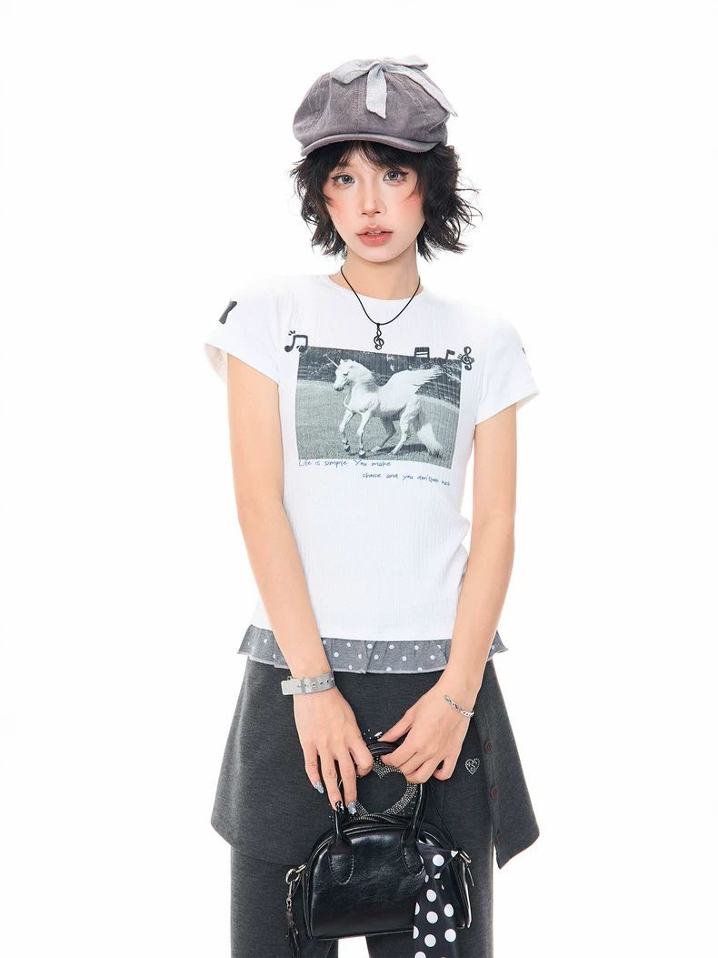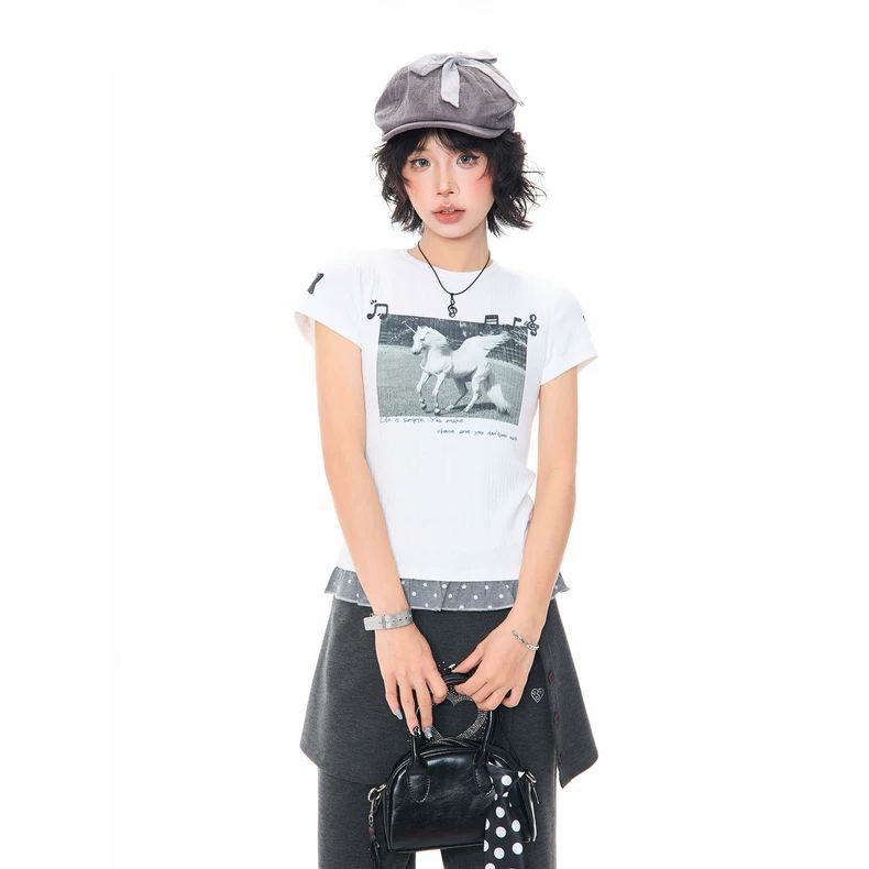 2026 한 부서 소녀 유니콘 참고 반팔 티셔츠 여성 여름 레이스 밑단 몸매 가꾸기 슬림해 보이는 쇼트 스타일 맨위