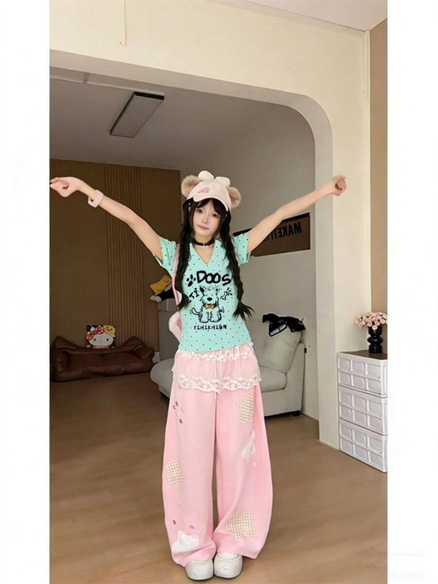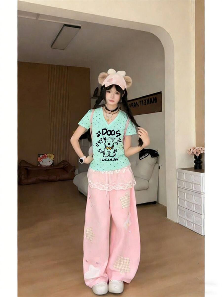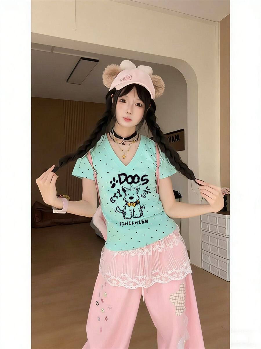 2026 한 부서 소녀 유니콘 참고 반팔 티셔츠 여성 여름 레이스 밑단 몸매 가꾸기 슬림해 보이는 쇼트 스타일 맨위