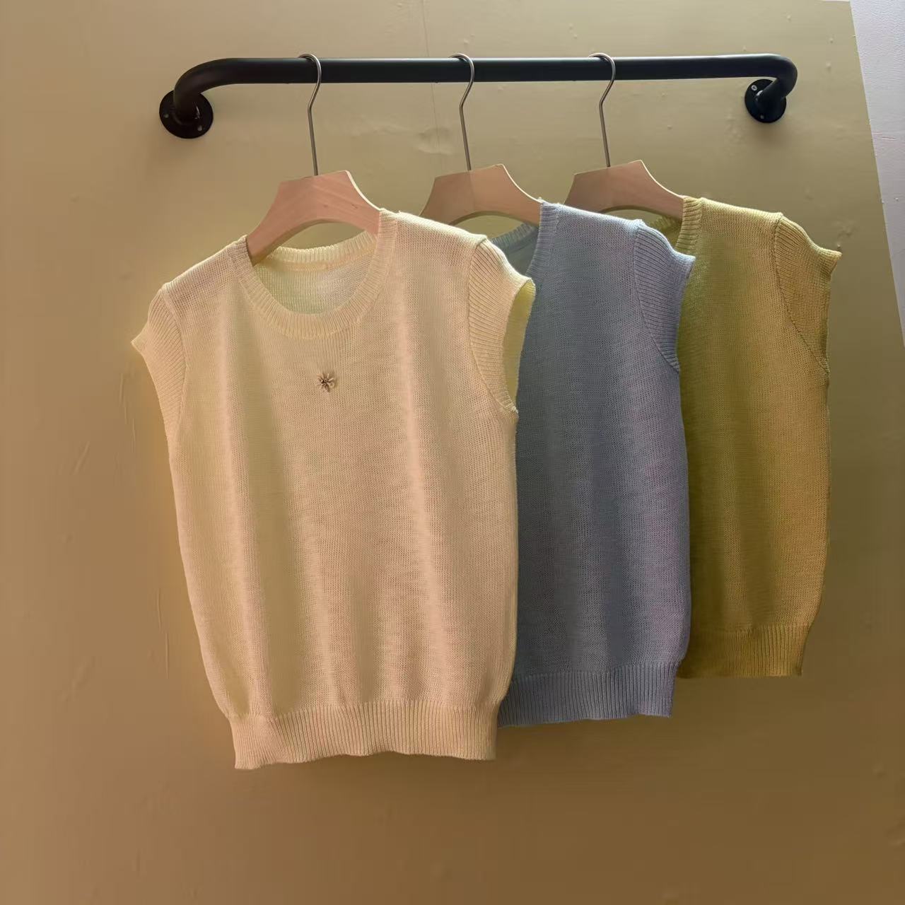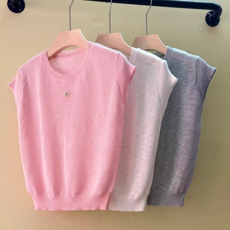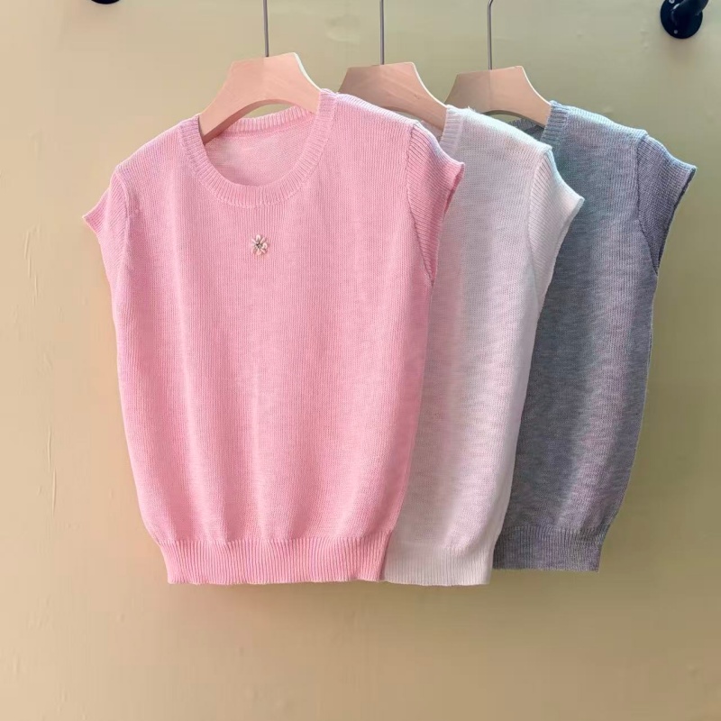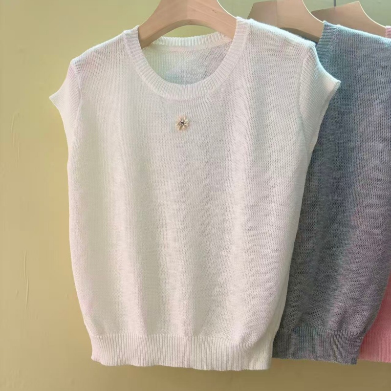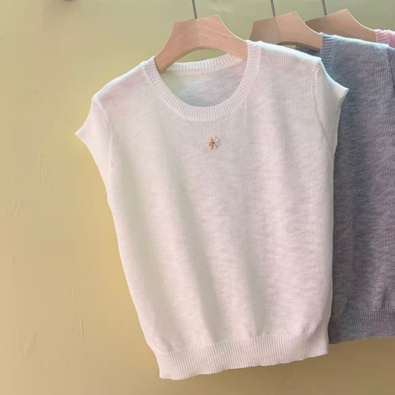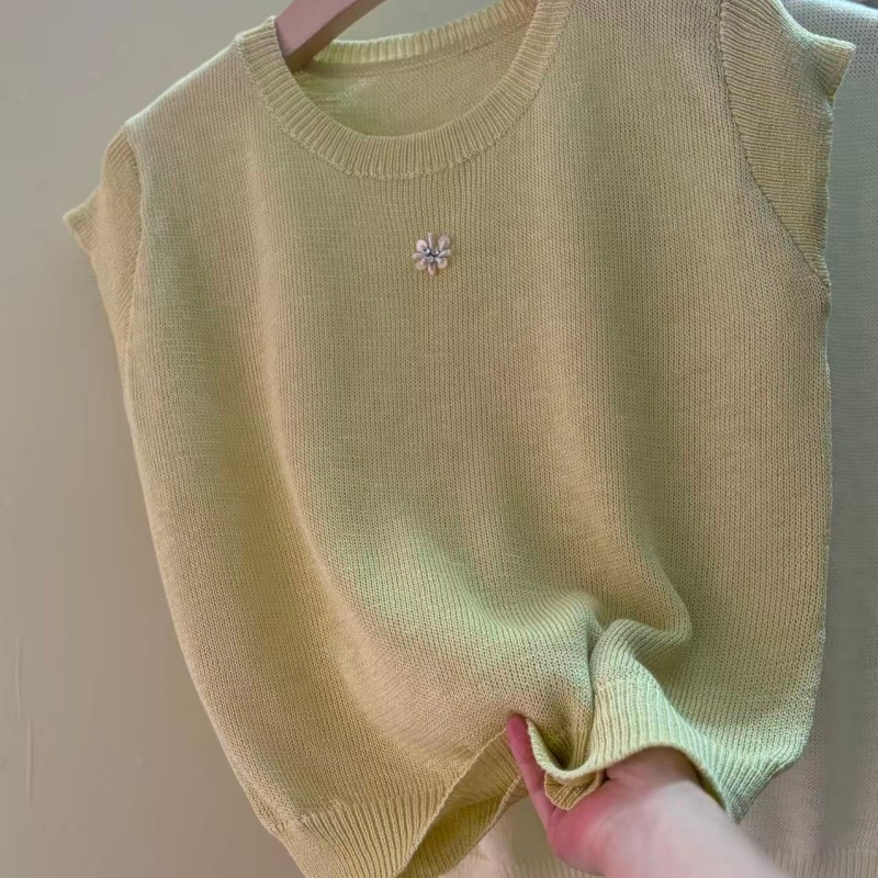 mz 작은 키 레이스 꽃 장식 항공기 소매 26 여름 신제품 아마 라운드 넥 여성 티셔츠 니트 스웨터