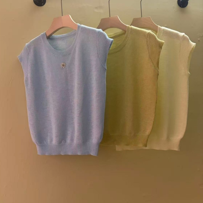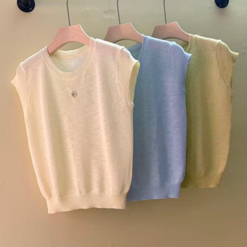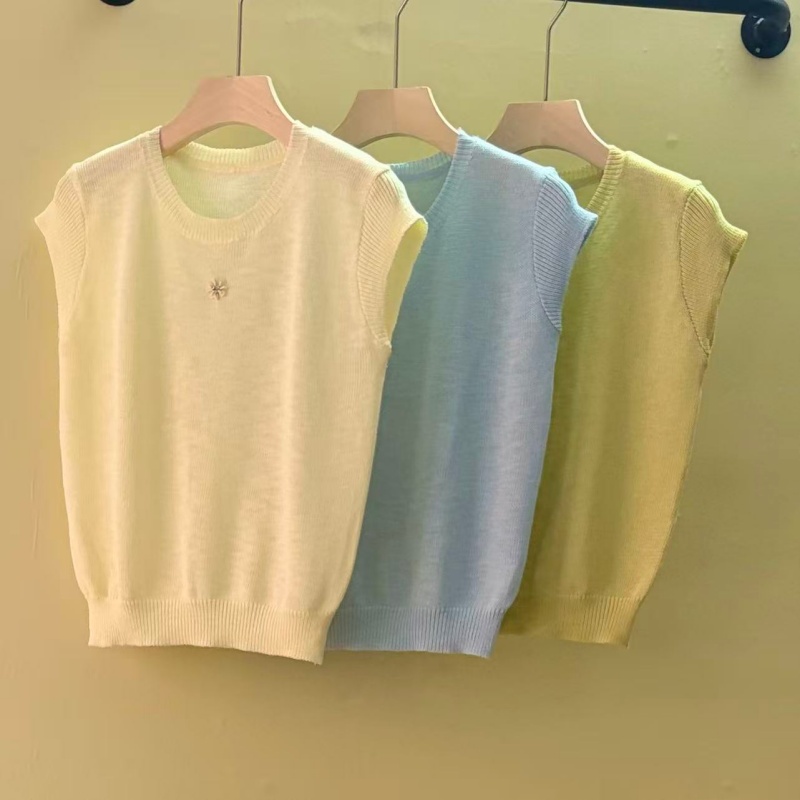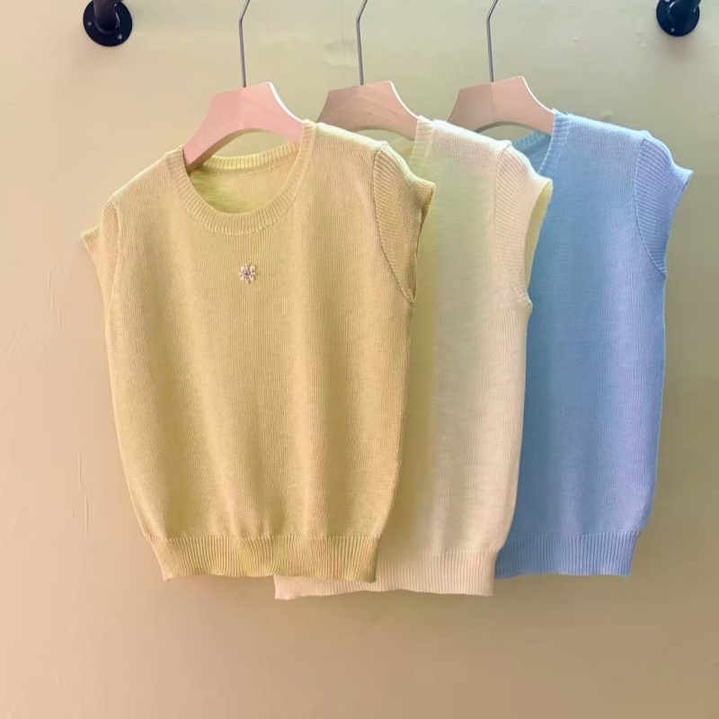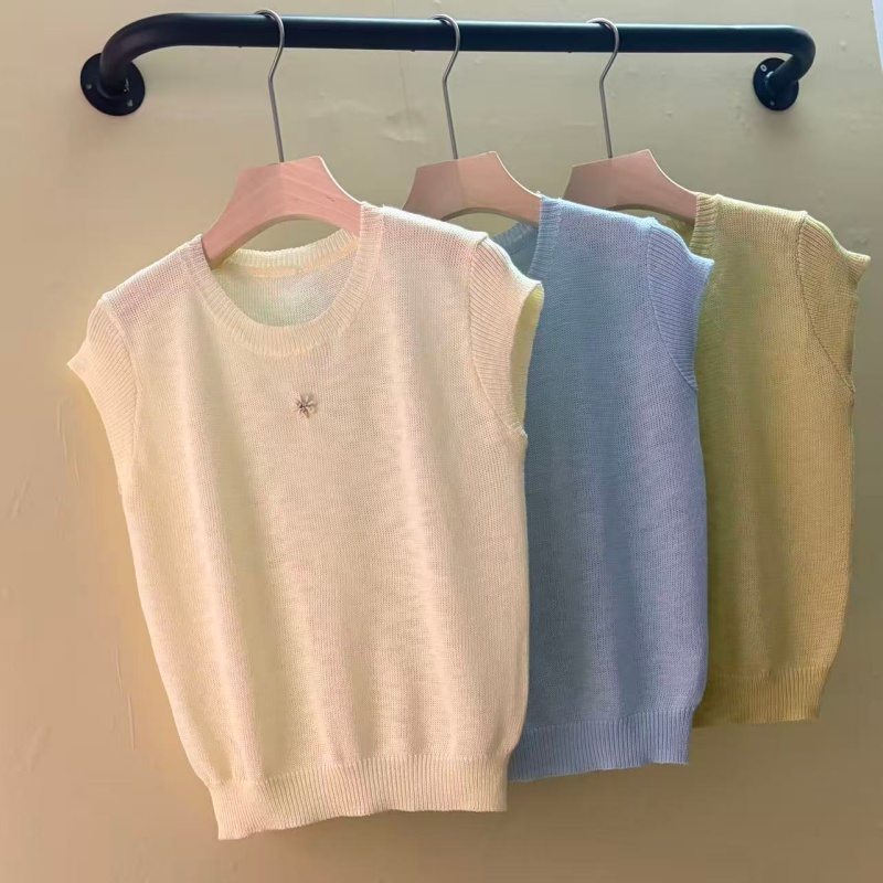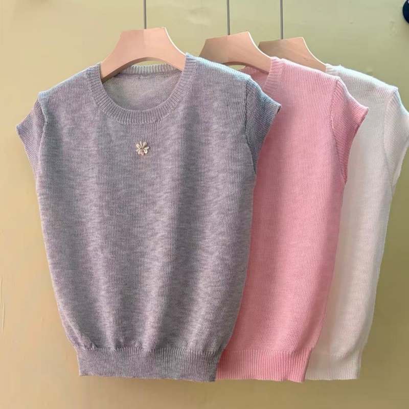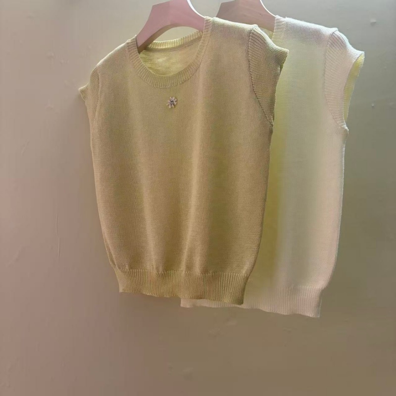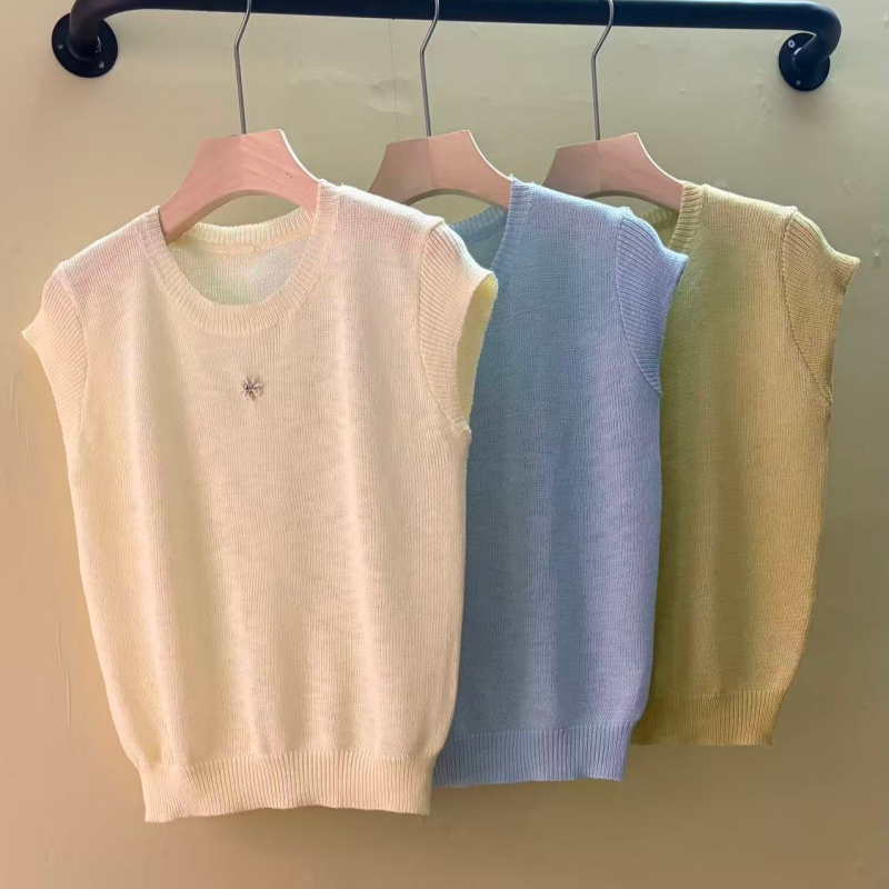 mz 작은 키 레이스 꽃 장식 항공기 소매 26 여름 신제품 아마 라운드 넥 여성 티셔츠 니트 스웨터