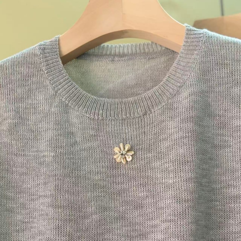 라운드 넥 2026 여름 신제품 반팔 자수 장식 티셔츠 니트 통기성 풀오버