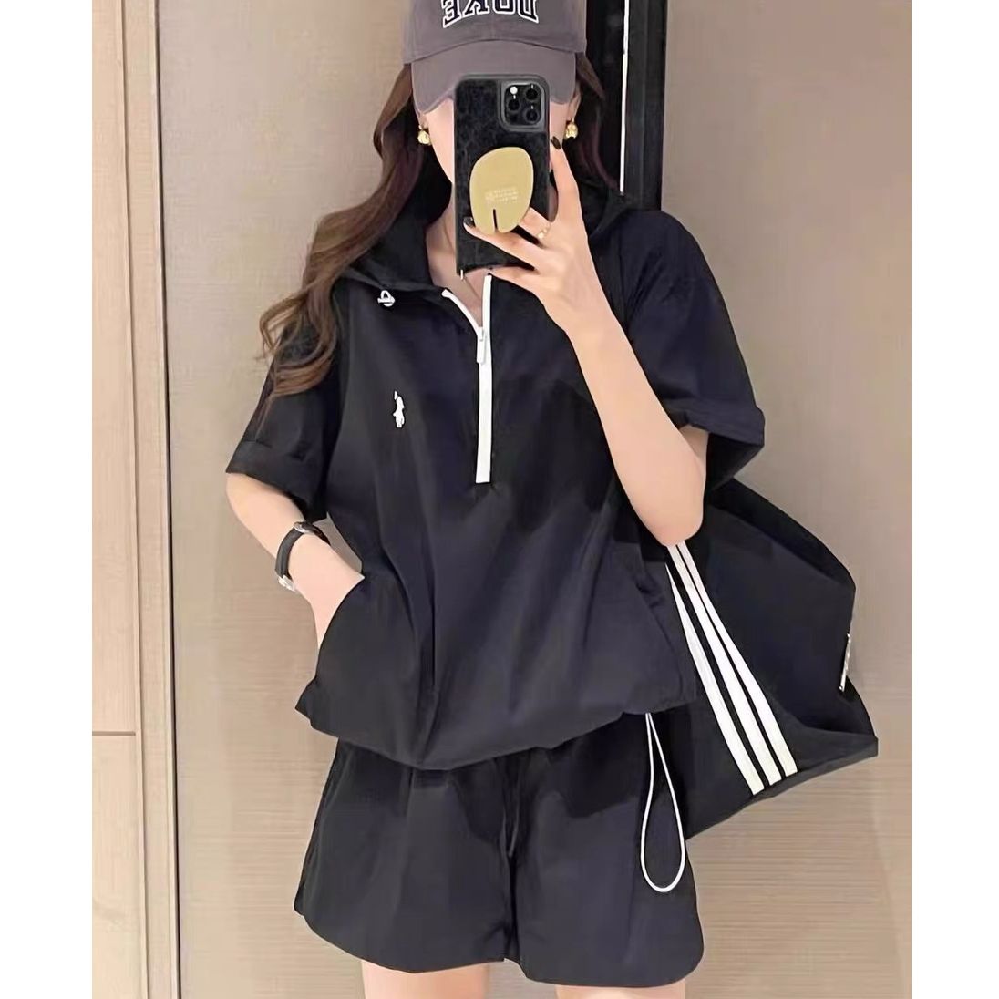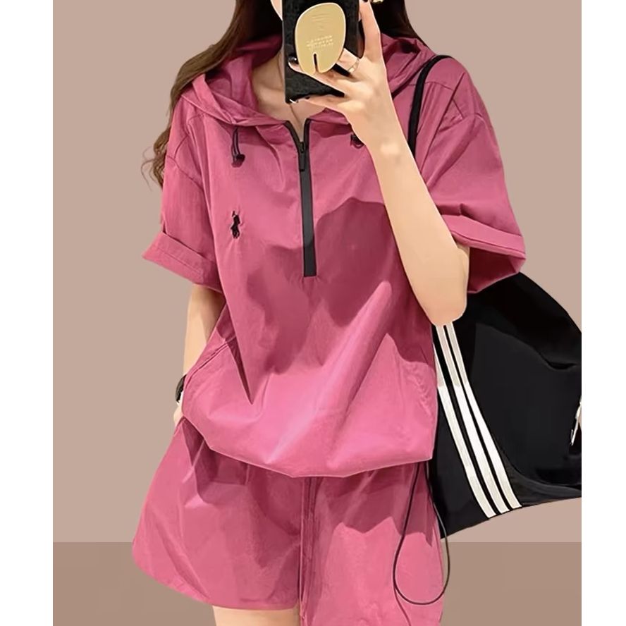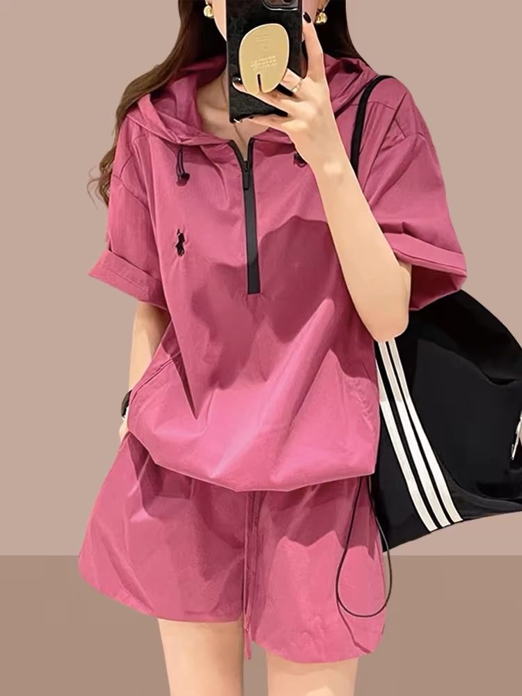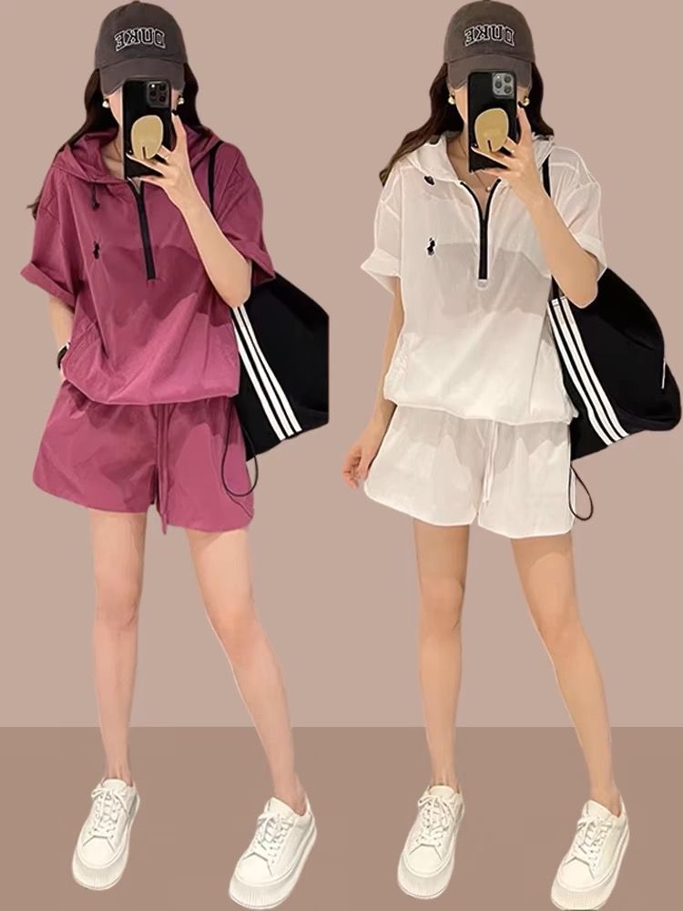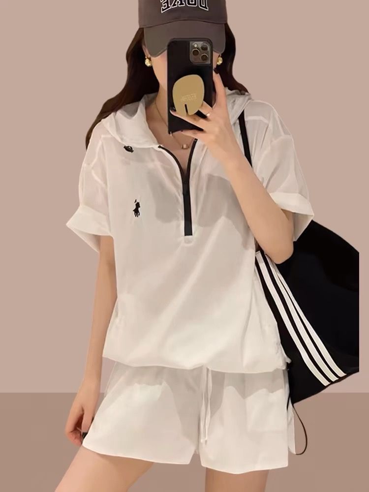 한국 chic 여름 미니멀리즘 품격 펌프 로프 후드 지퍼 자외선 차단 재킷 레이스업 하이웨이스트 운동 반바지 여성