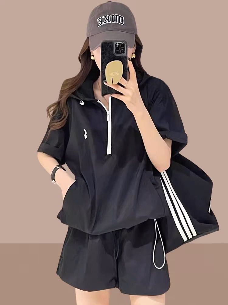 새로운 패션 후드 루즈핏 오픈 가디건 자외선 차단 의류 세트 여성 작은 키 여름 새로운 얇은 스타일 반바지 투피스 세트