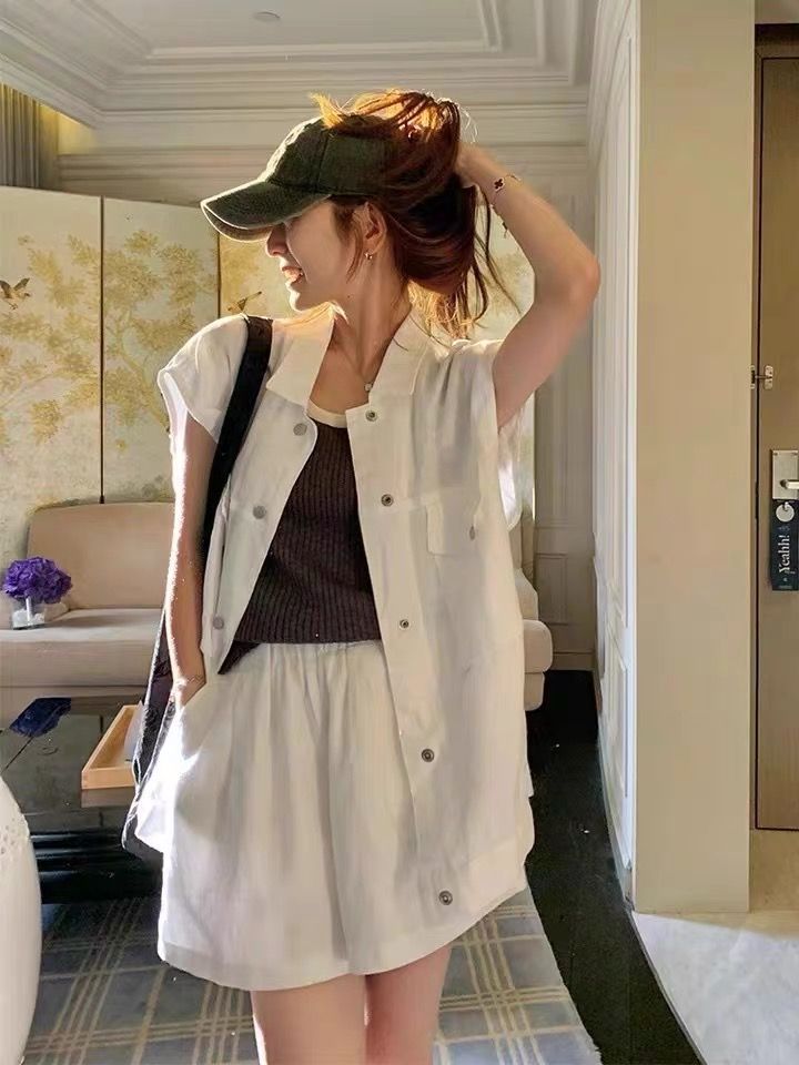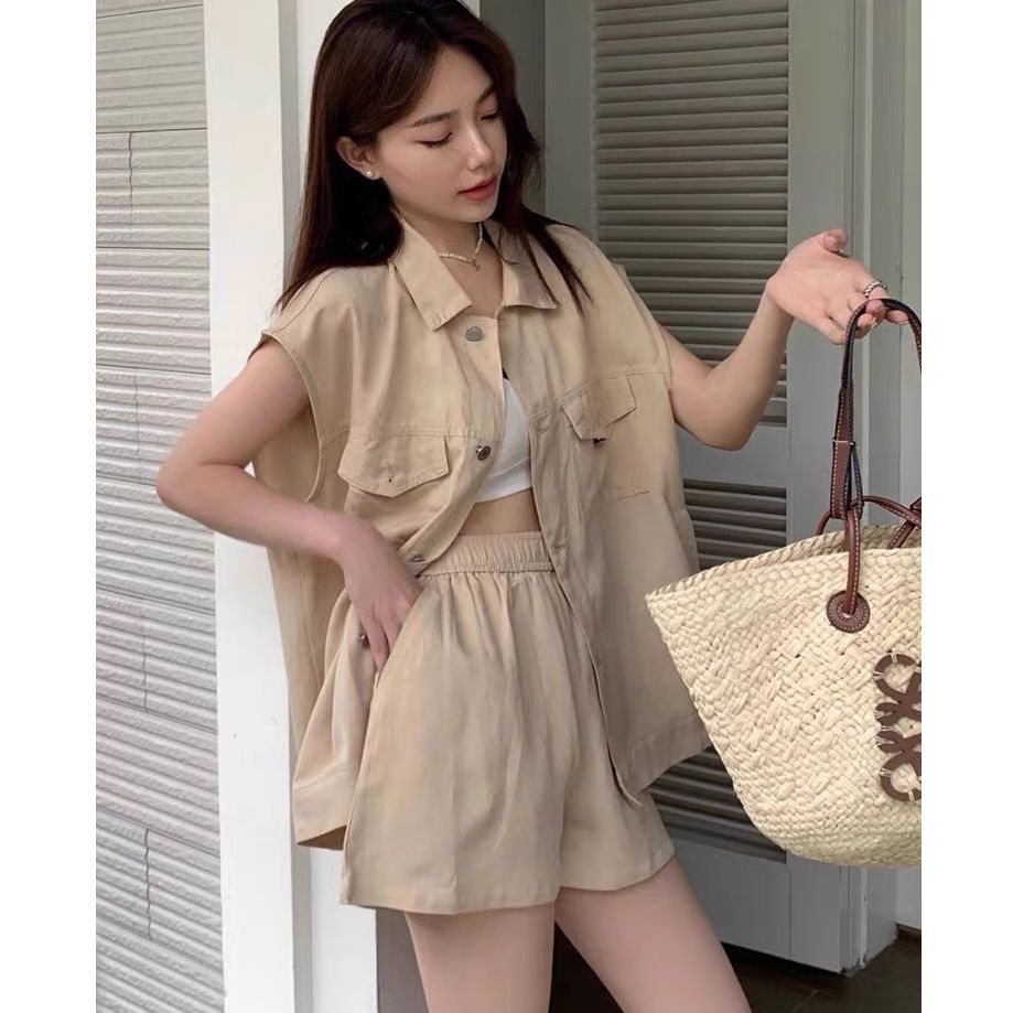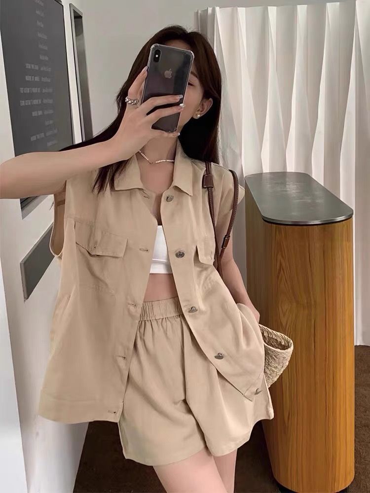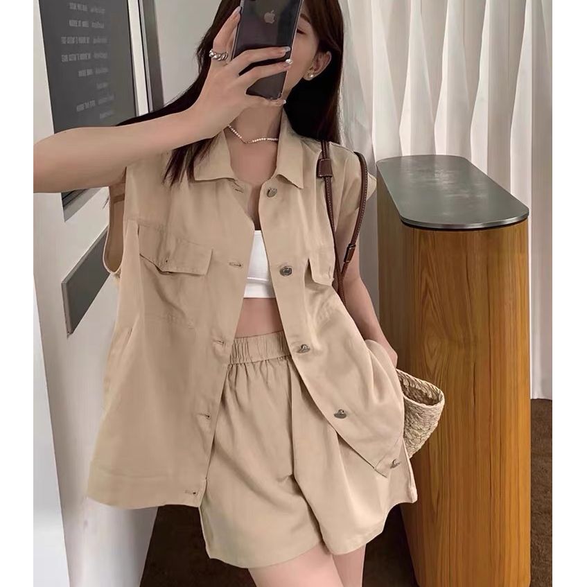한국 워크웨어 바람 민소매 조끼 오픈 가디건 맨위 여성 주머니 폴로 칼라 루즈핏 슬림해 보이는 다용도 넓은 다리가 짧다. 바지 세트