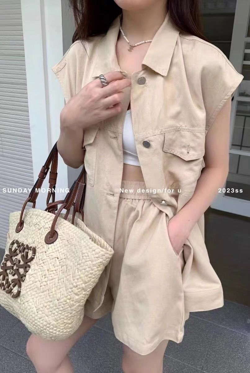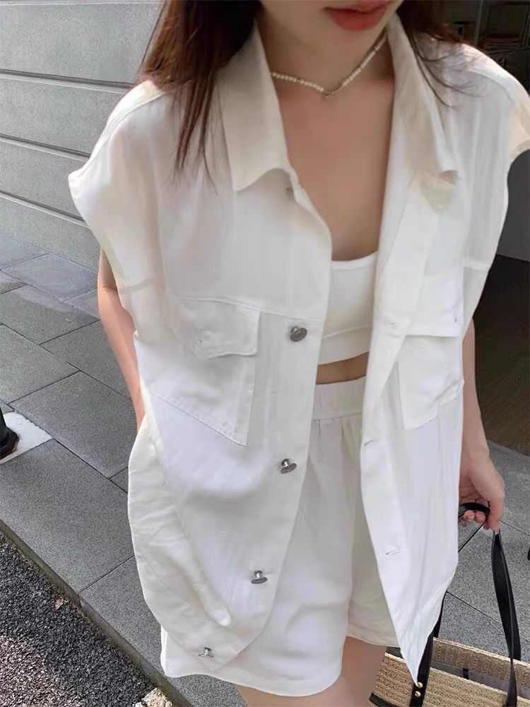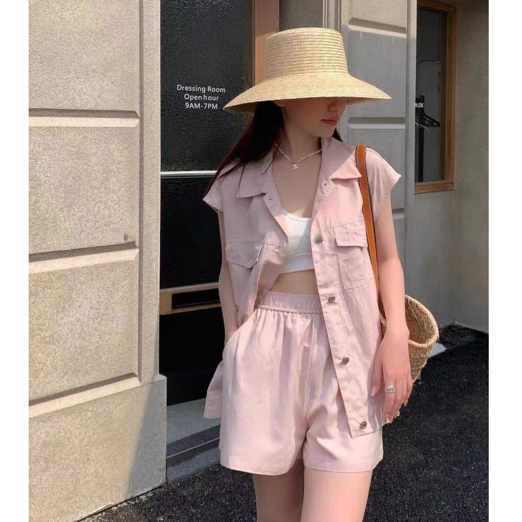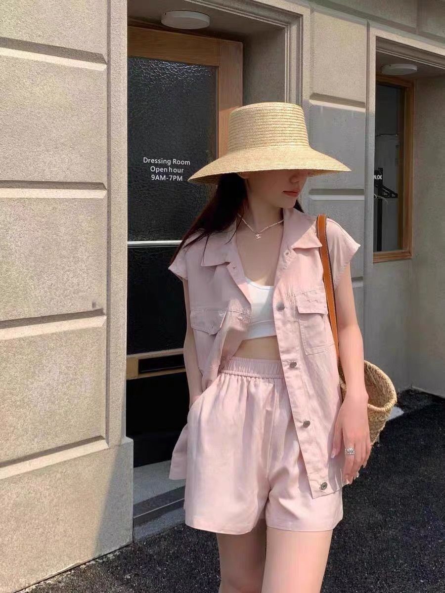 한국 워크웨어 바람 민소매 조끼 오픈 가디건 맨위 여성 주머니 폴로 칼라 루즈핏 슬림해 보이는 다용도 넓은 다리가 짧다. 바지 세트