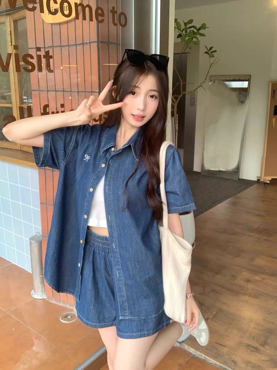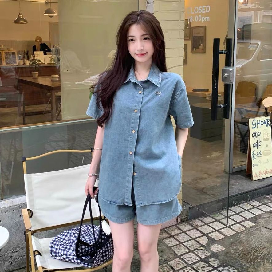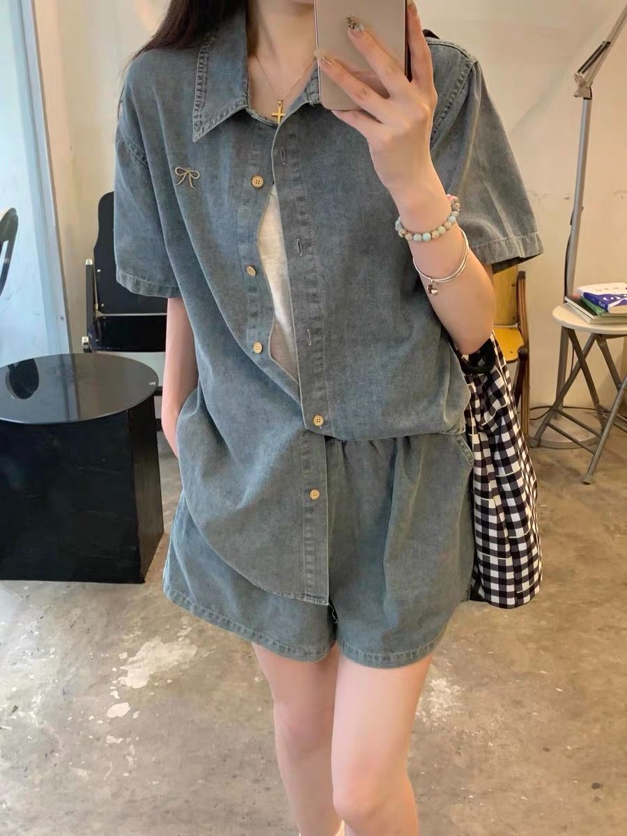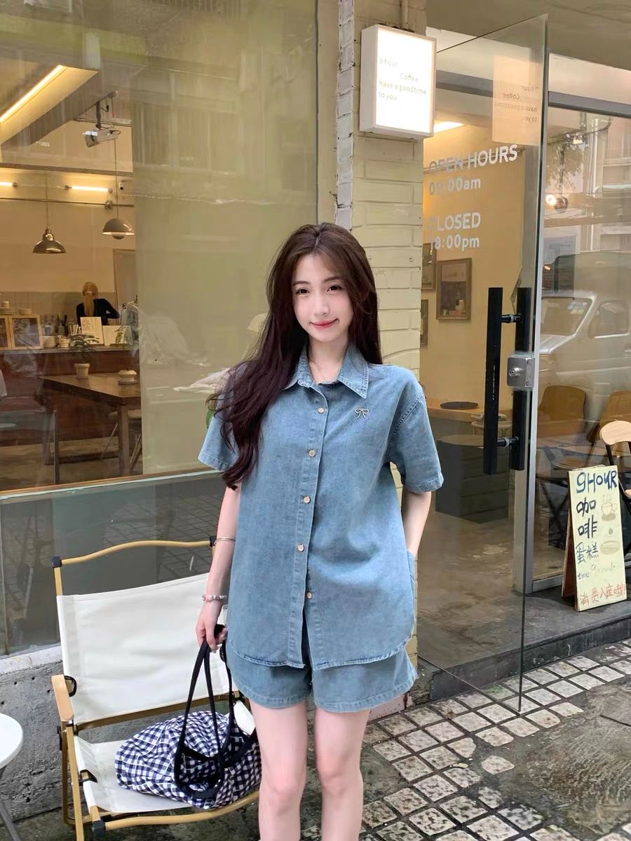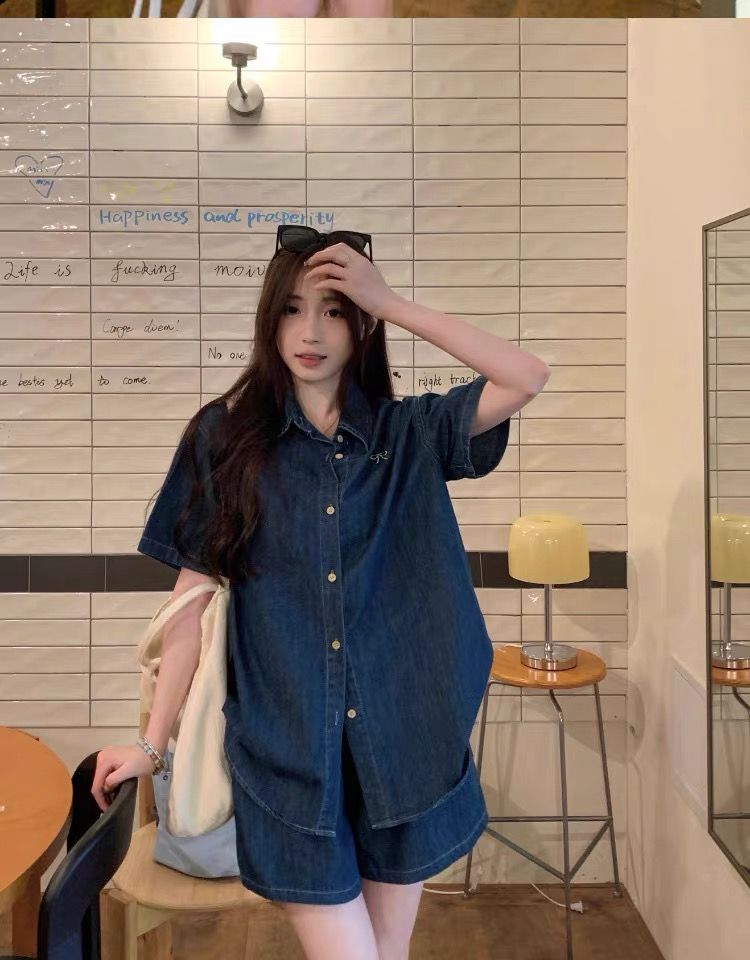 26 빅 사이즈 자수 모방 데님 세트 여름 오픈 가디건 맨위 지방 mm 넓은 다리가 짧다. 바지 마이크로 지방 착용 가져 가라. 전체 집합