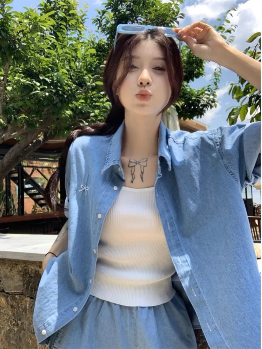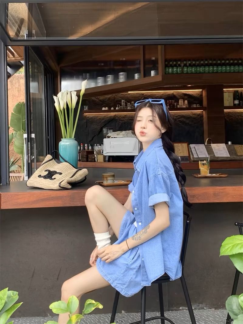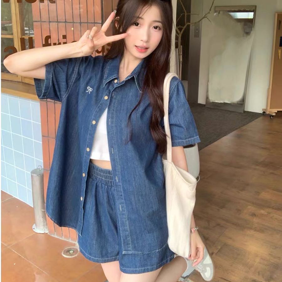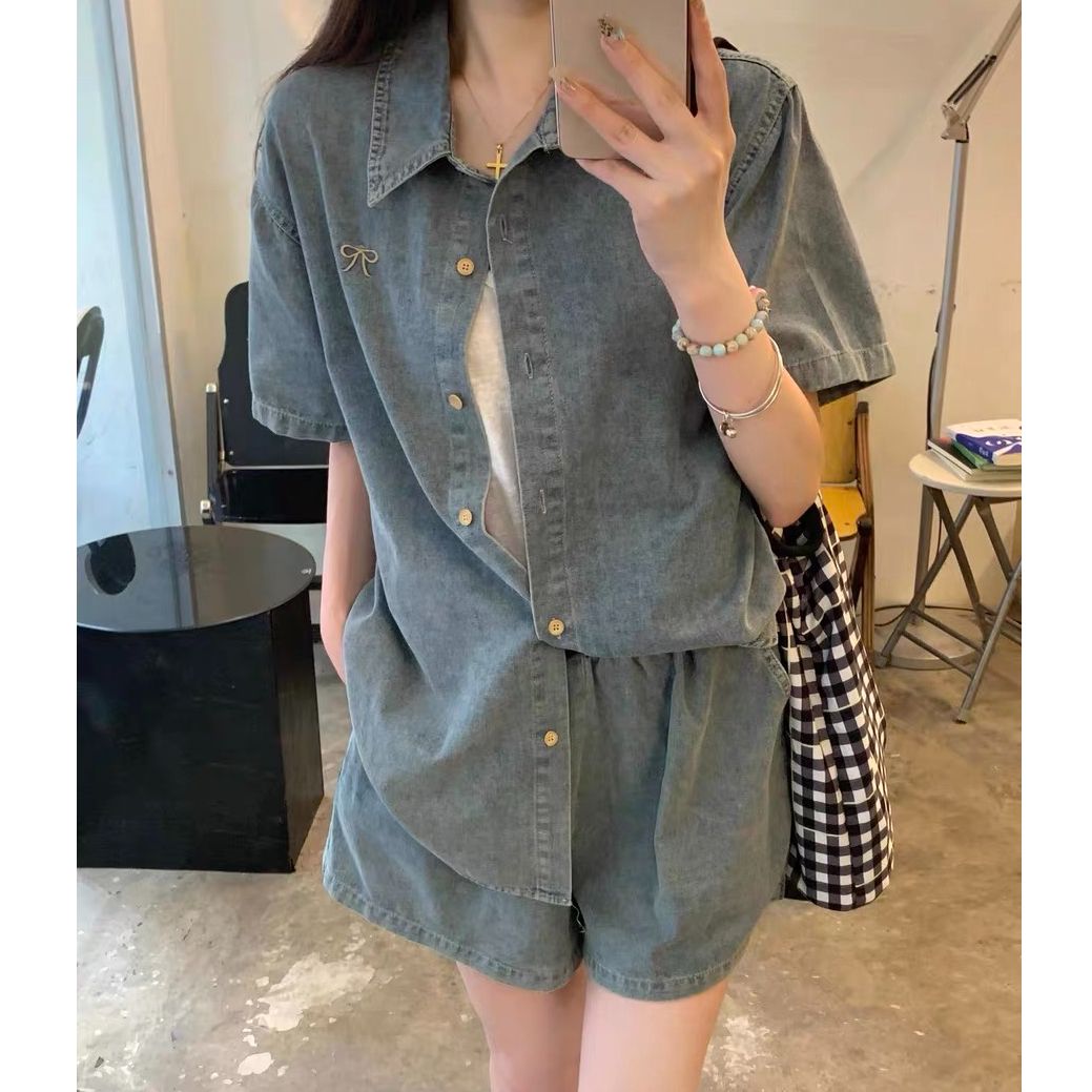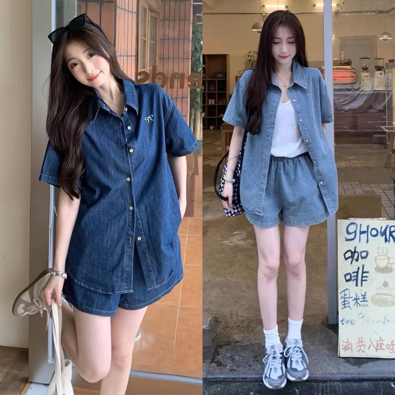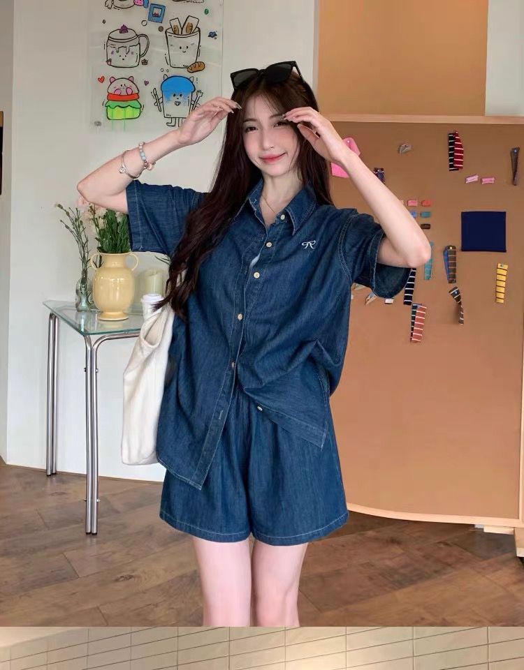 26 빅 사이즈 자수 모방 데님 세트 여름 오픈 가디건 맨위 지방 mm 넓은 다리가 짧다. 바지 마이크로 지방 착용 가져 가라. 전체 집합
