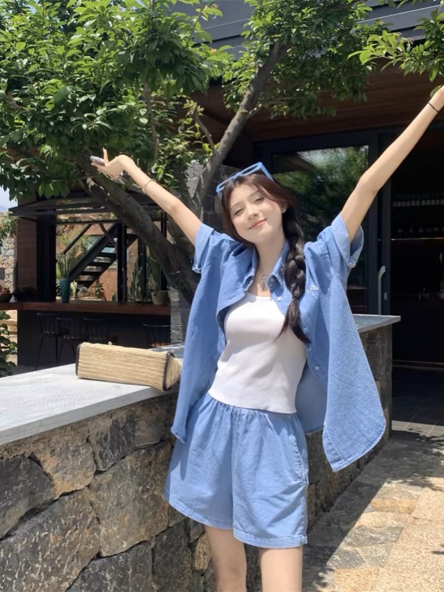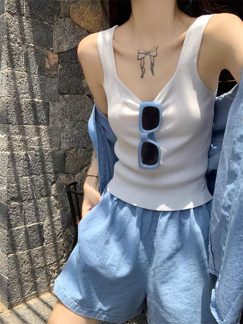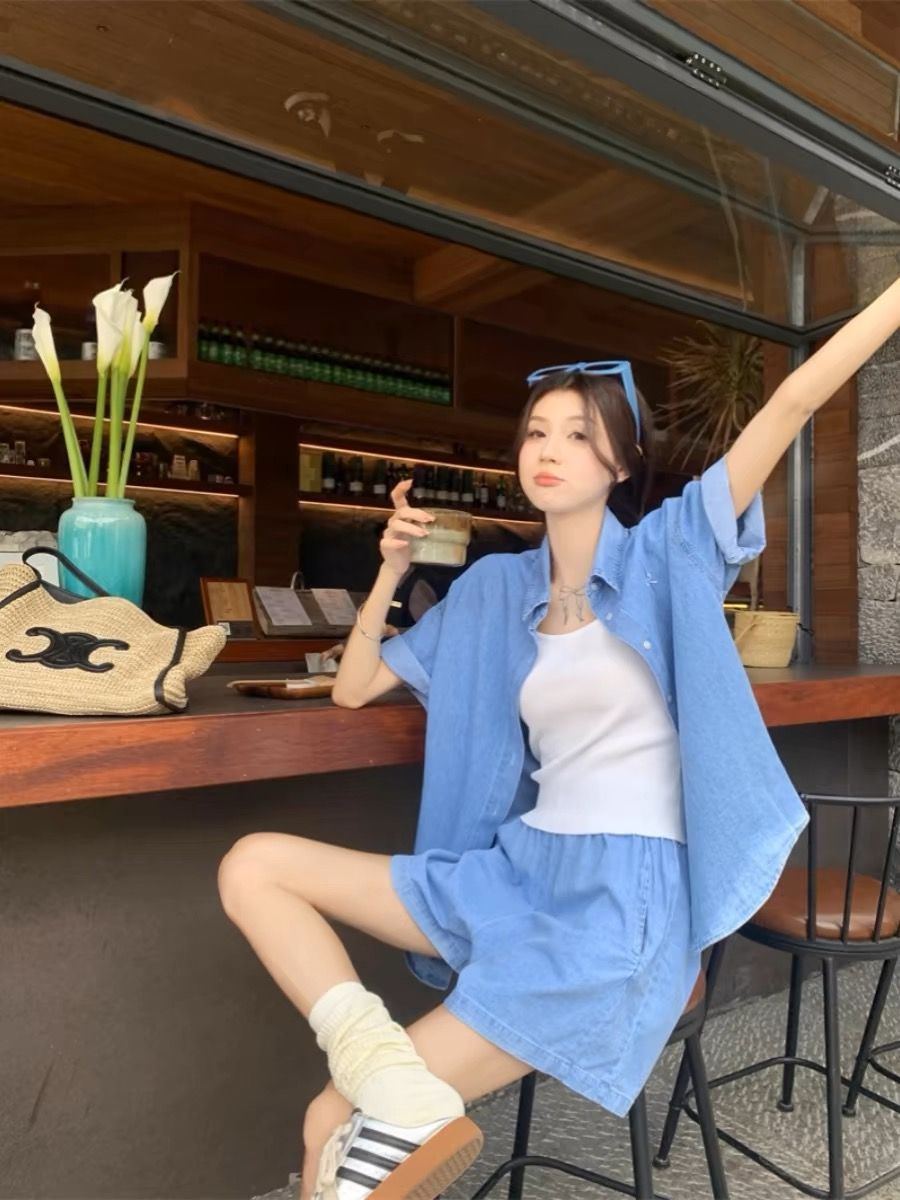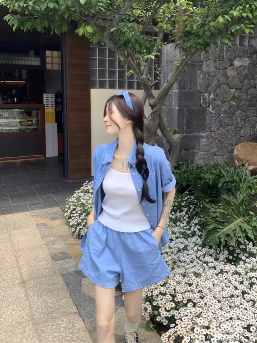한국 chic 여름 새로운 연령 감소 모방 데님 캐미솔 캐주얼 다용도 허리밴드 스트레이트 팬츠 세트