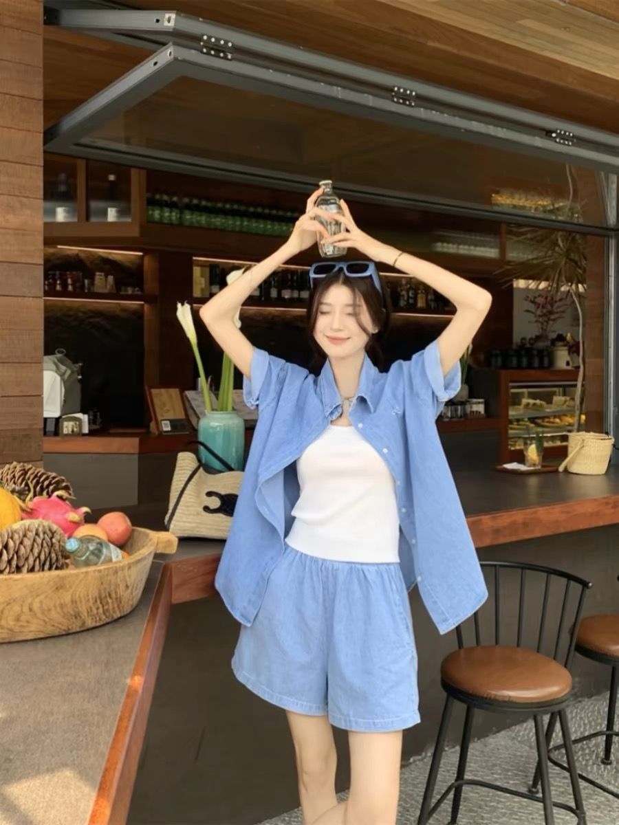 한국 스타일 여성 의류 2026 여름 섹션 아메리칸 운동복 세트 캐주얼 반팔 재킷 하이웨이스트 반바지 두 조각 여성 세트