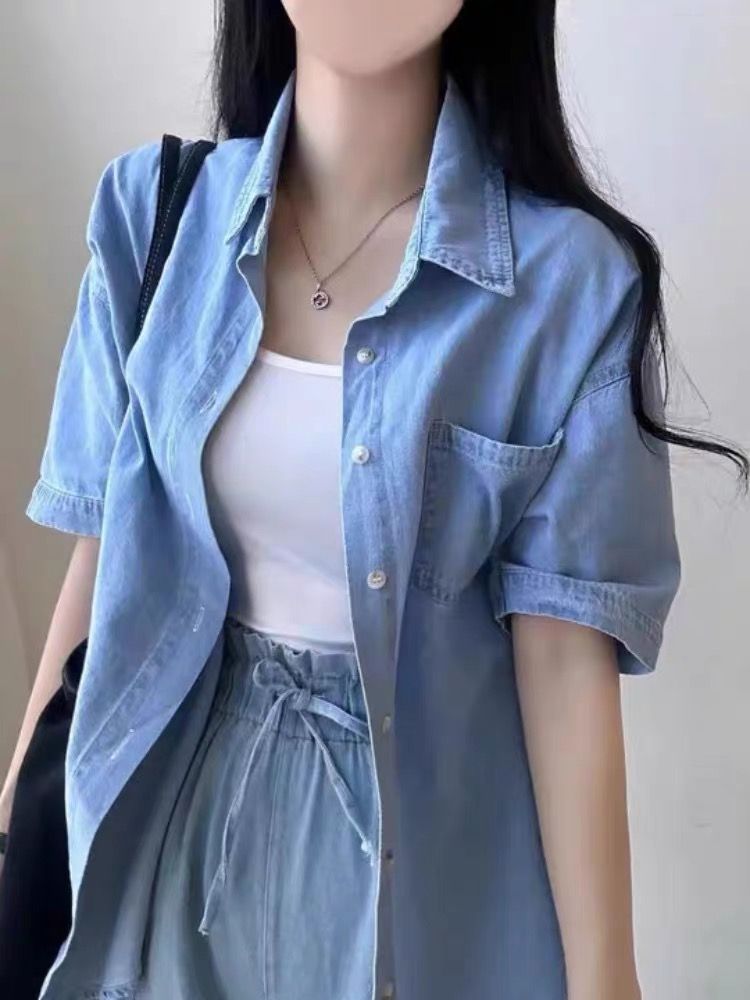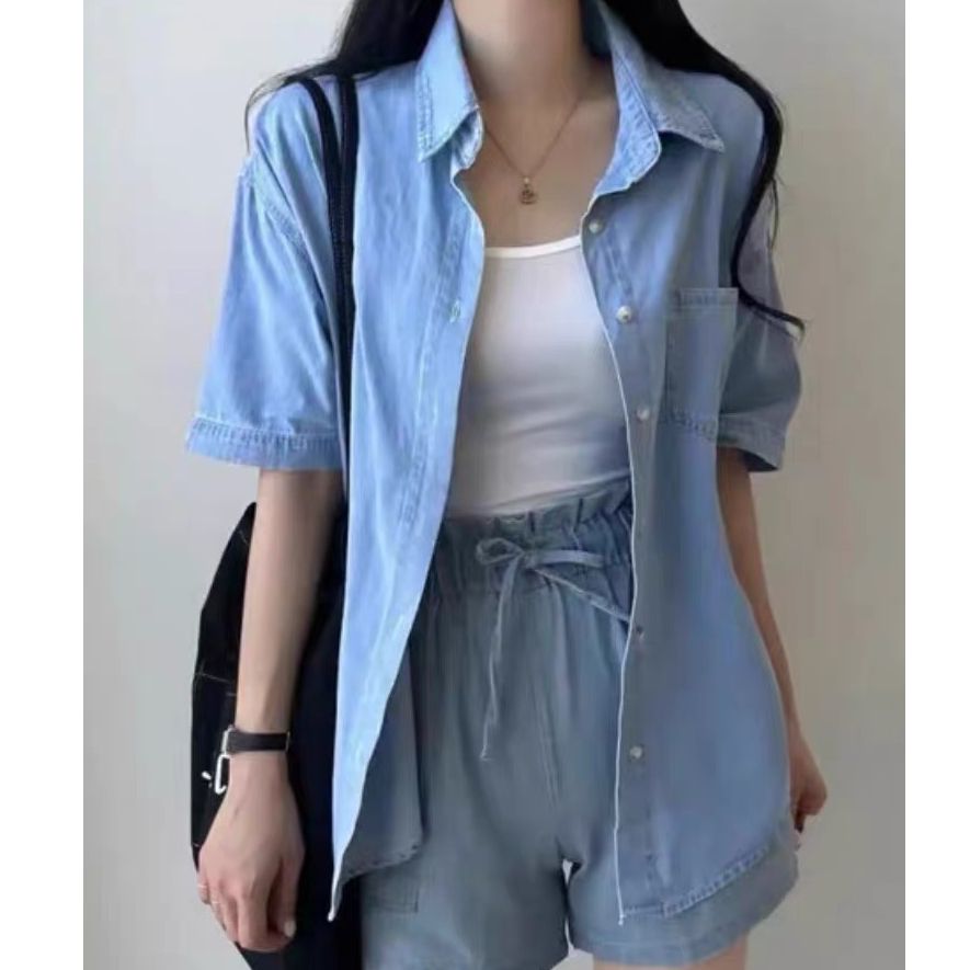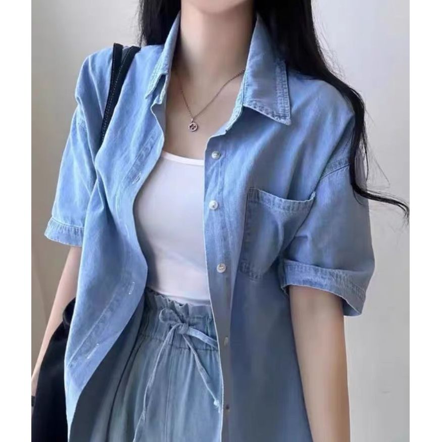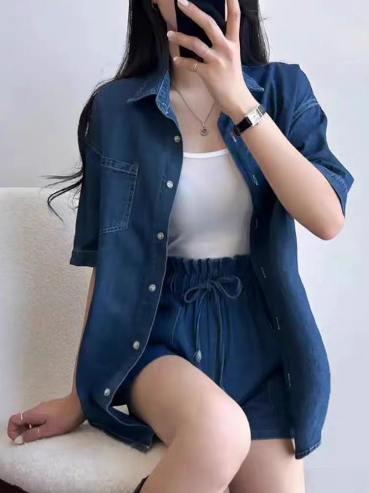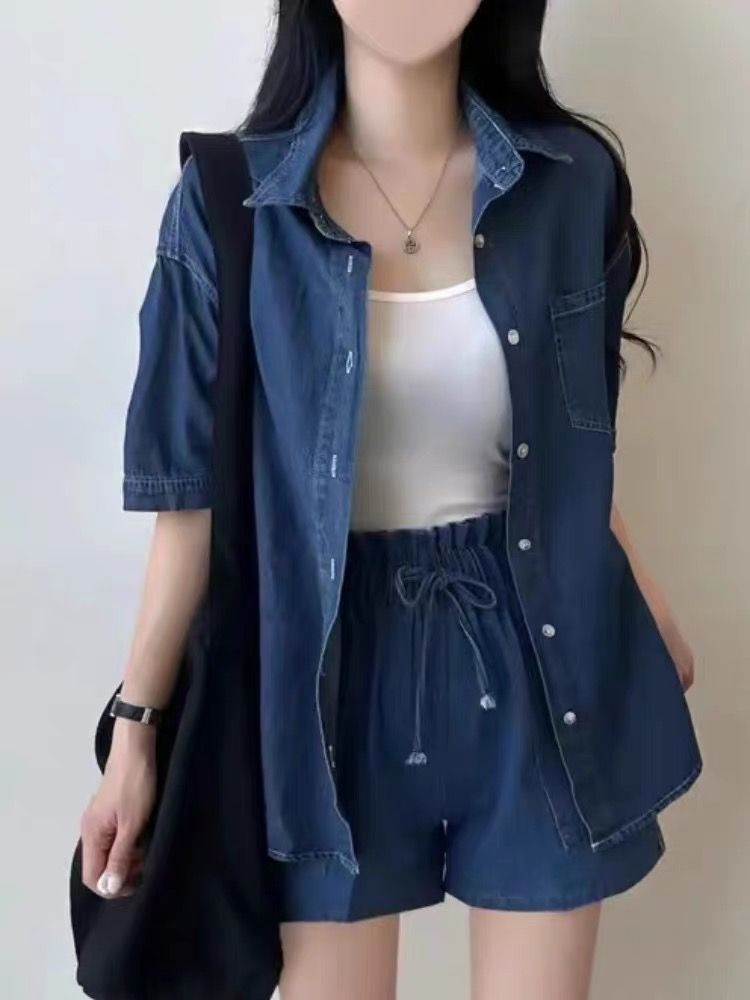 빅 사이즈 패션 세트 여성 여름 반팔 모방 데님 얇은 스타일 재킷 캐미솔 지방 mm 캐주얼 바지 세트