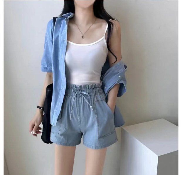 한국 chic 여름 새로운 연령 감소 모방 데님 캐미솔 캐주얼 다용도 허리밴드 스트레이트 팬츠 세트