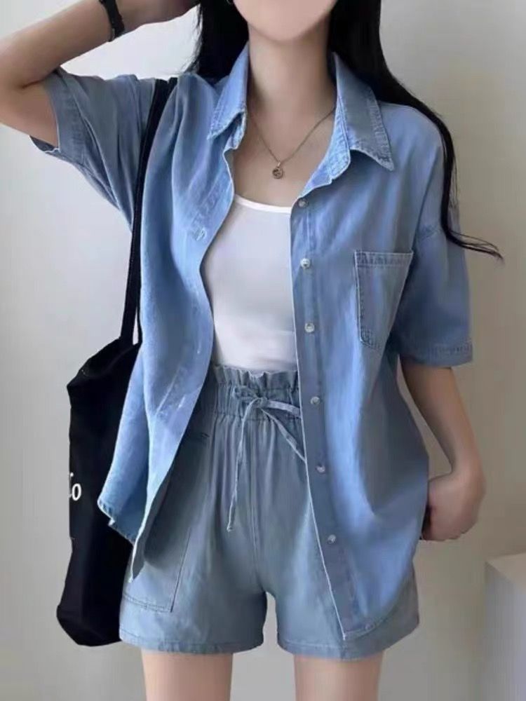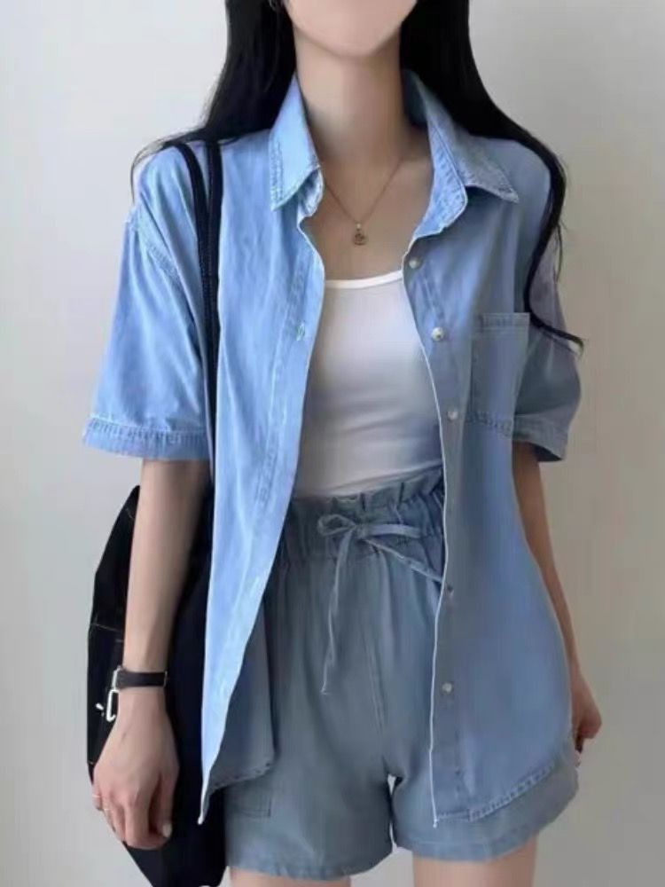 2026 일본식 레트로 없음 칼라 반팔 맨위 캐주얼 와이드 레그 팬츠 패션 빛 요리 한 바람 외국 가스 투피스 슈트 여성 여름