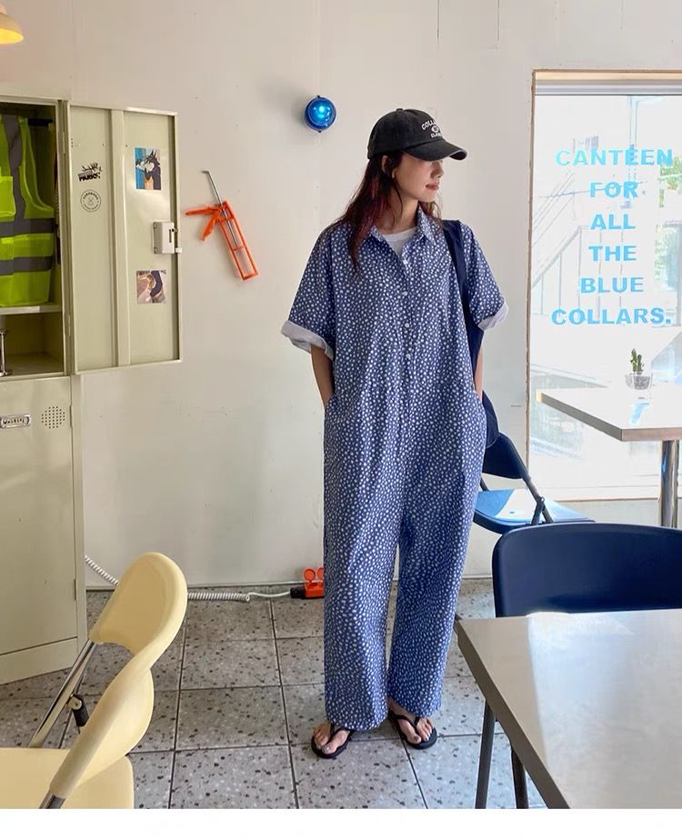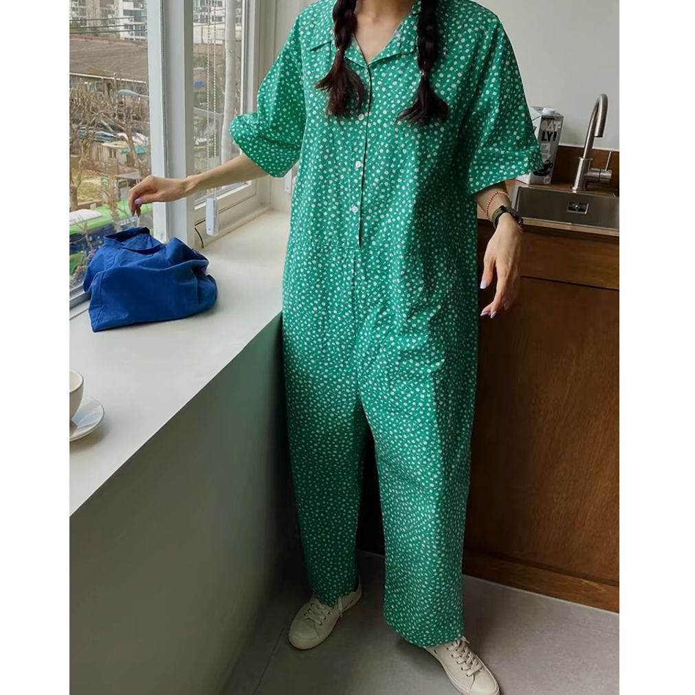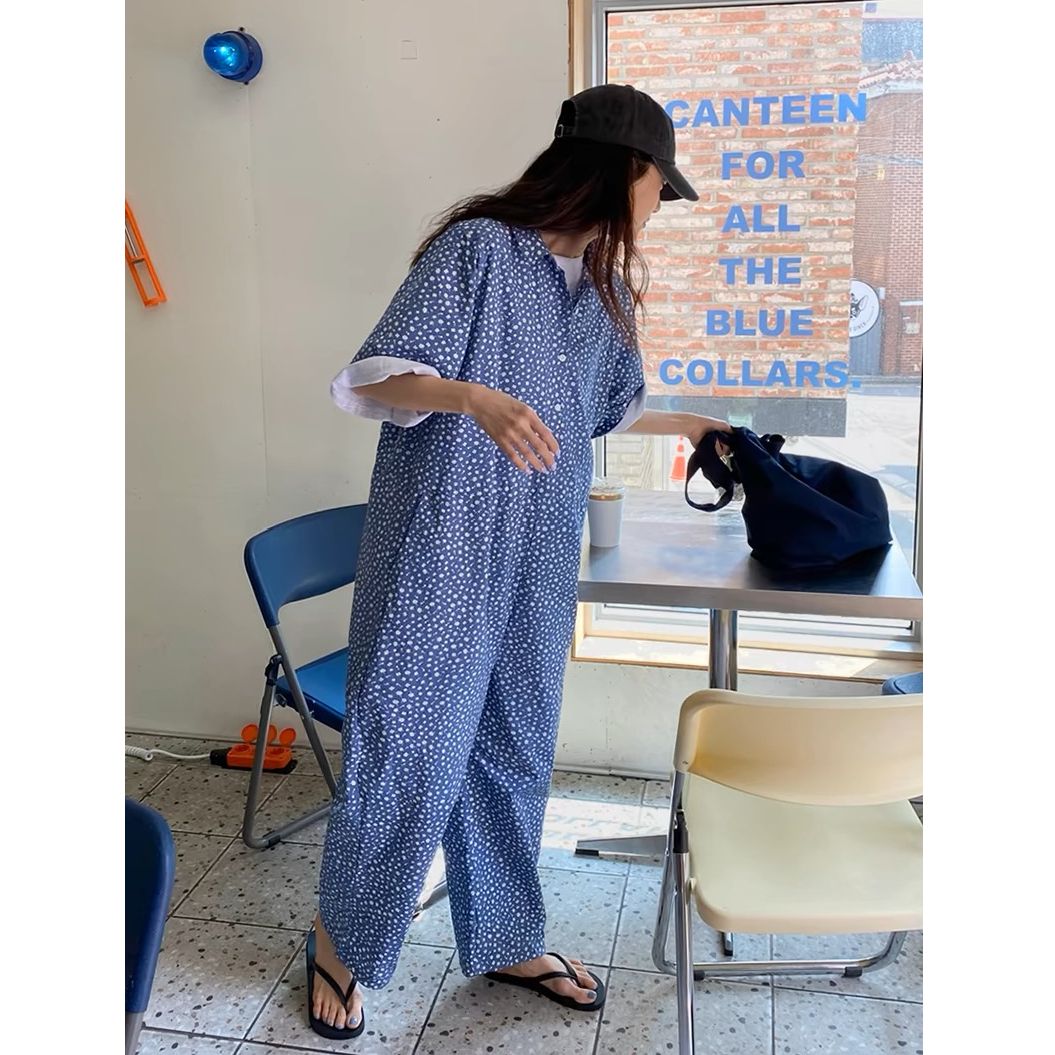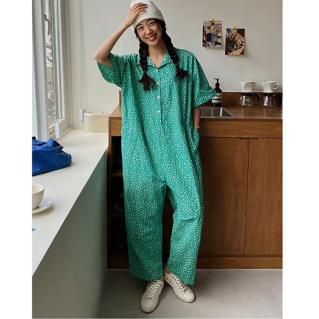 점프 슈트 여름 2026 한국 럭키 풀 프린트 편안함 새로운 반팔 루즈핏 넓은 다리 점프 슈트 롱 바지