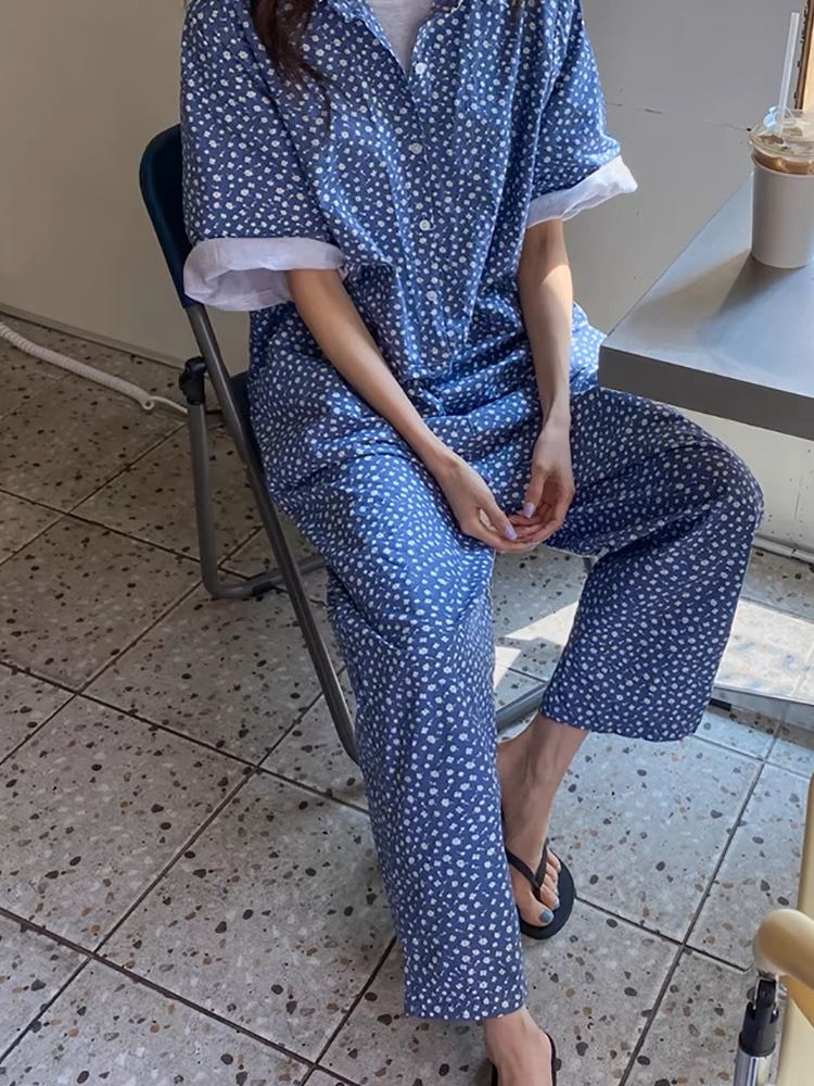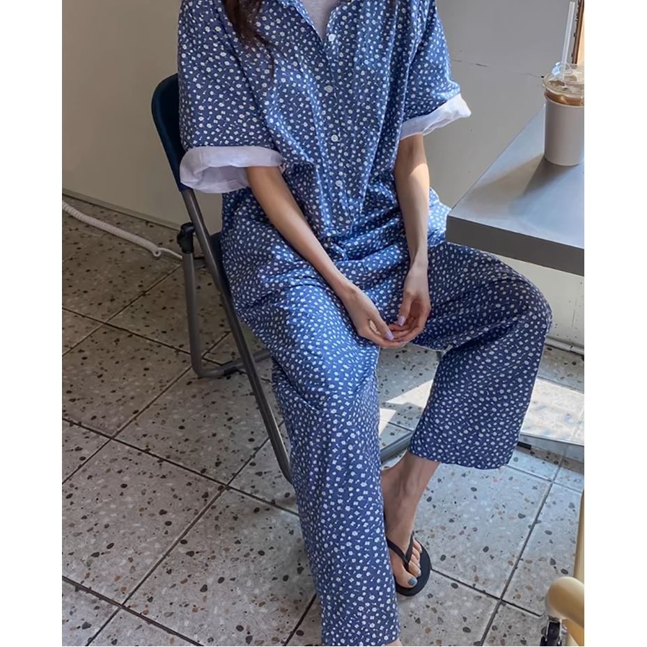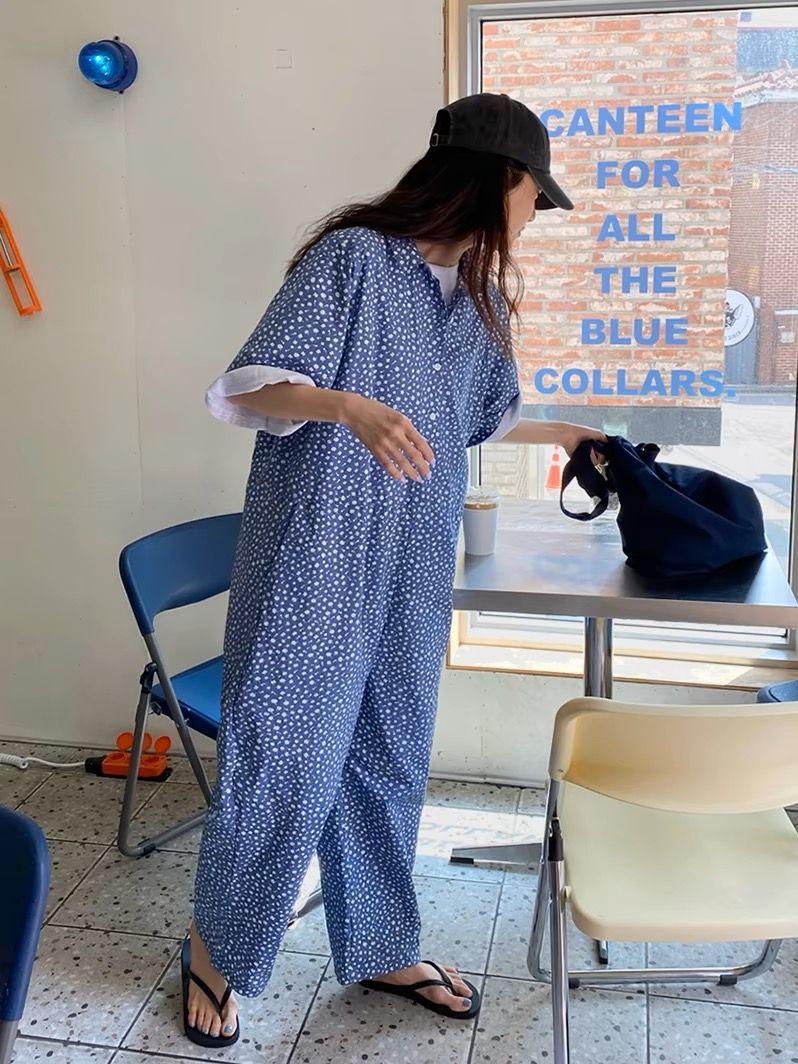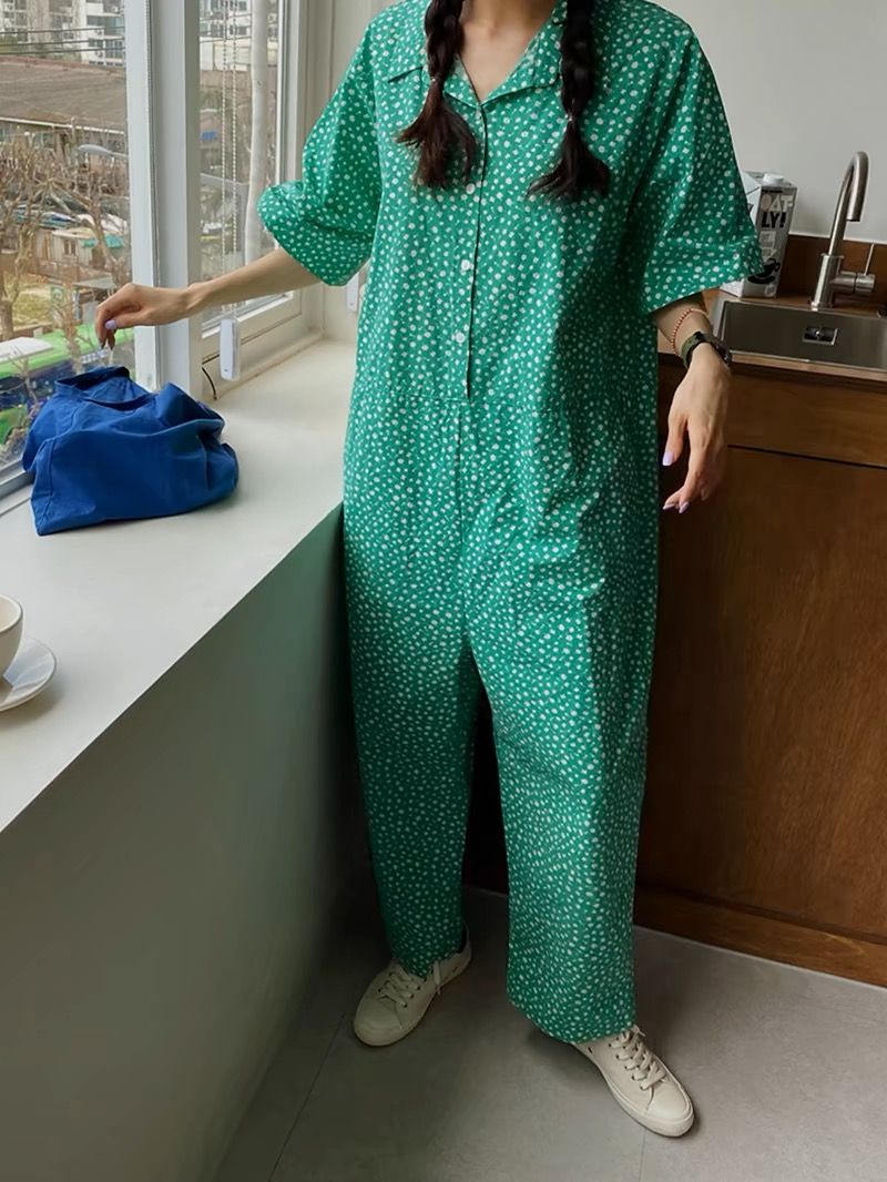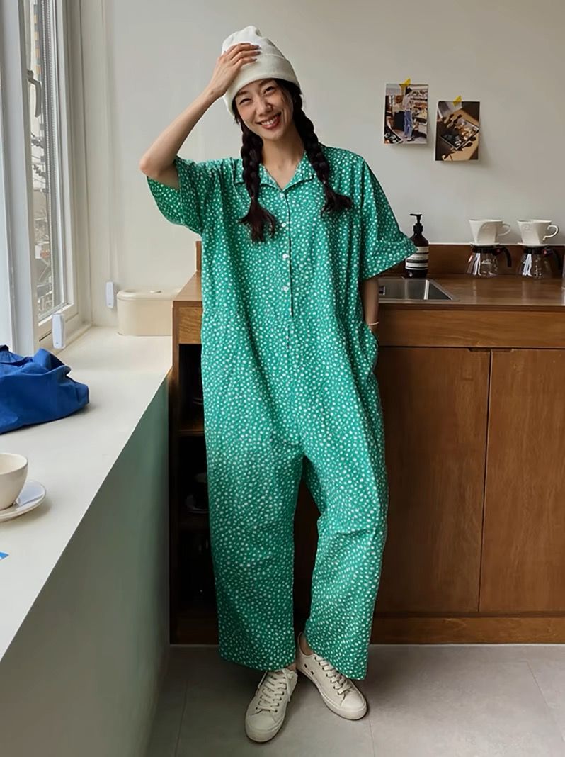 점프 슈트 여름 2026 한국 럭키 풀 프린트 편안함 새로운 반팔 루즈핏 넓은 다리 점프 슈트 롱 바지