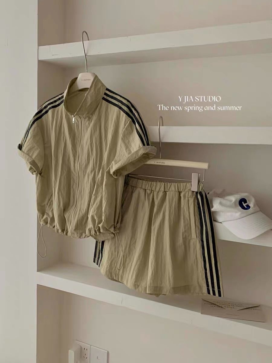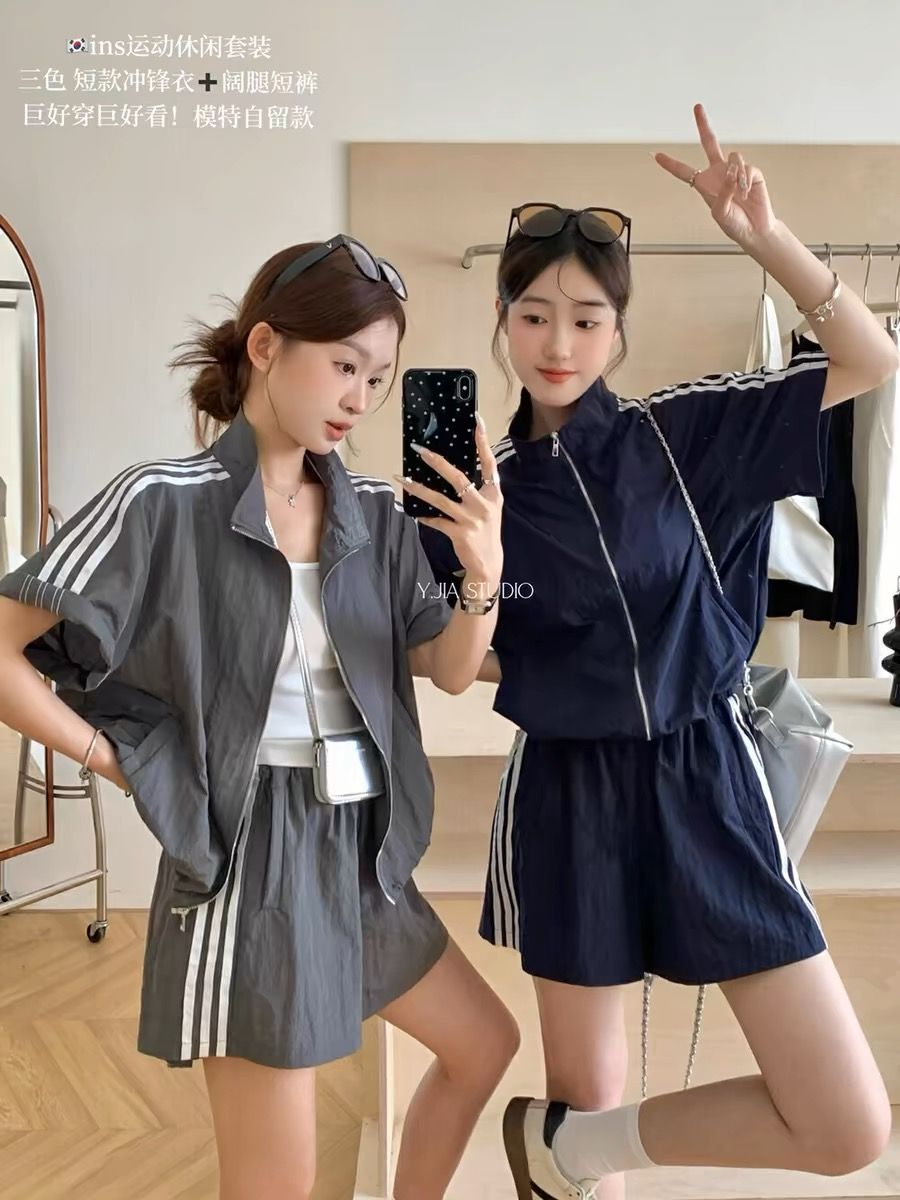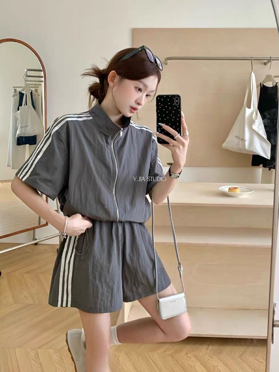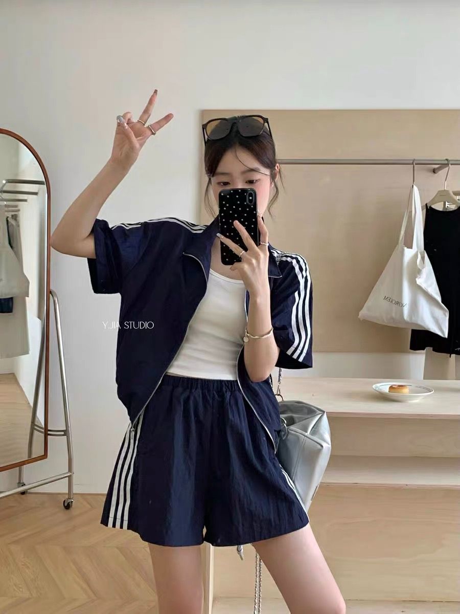 한국 스타일 여성 의류 2026 여름 섹션 아메리칸 운동복 세트 캐주얼 반팔 재킷 하이웨이스트 반바지 두 조각 여성 세트