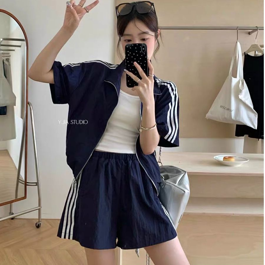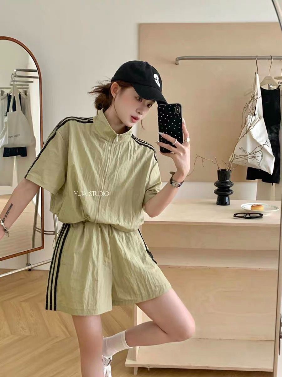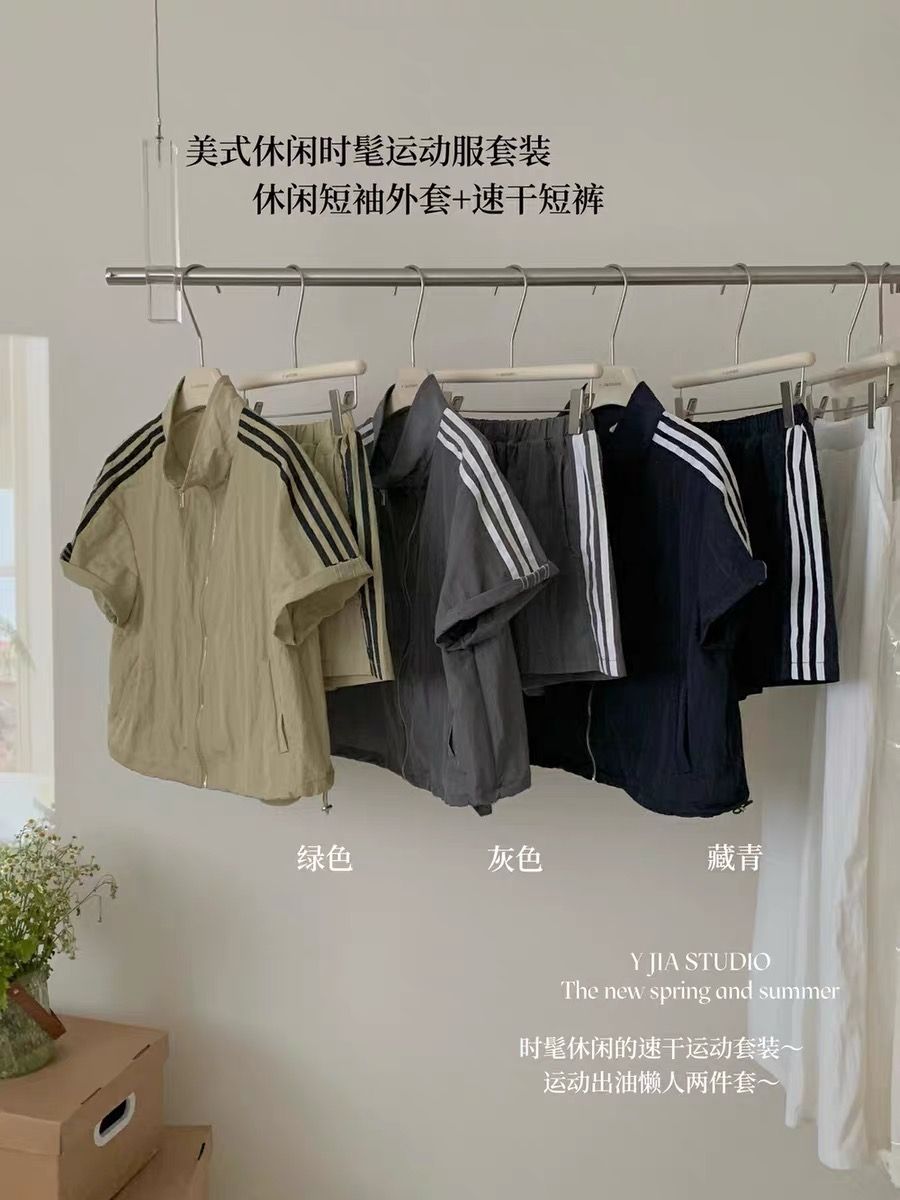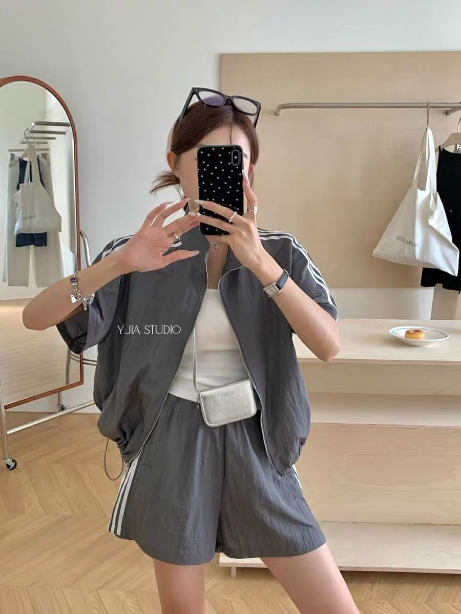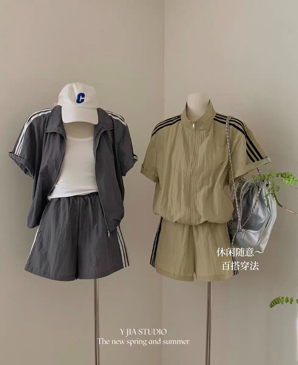 한국 스타일 여성 의류 2026 여름 섹션 아메리칸 운동복 세트 캐주얼 반팔 재킷 하이웨이스트 반바지 두 조각 여성 세트