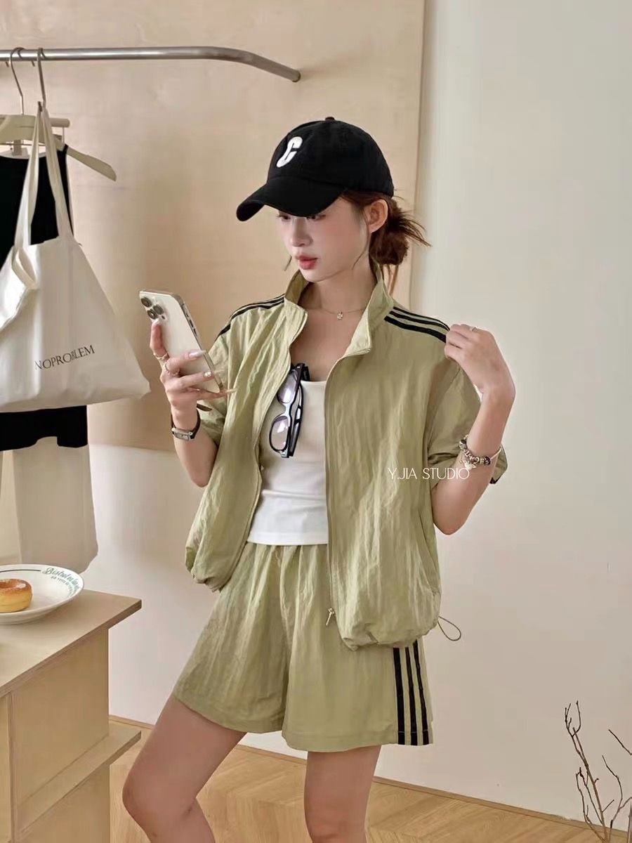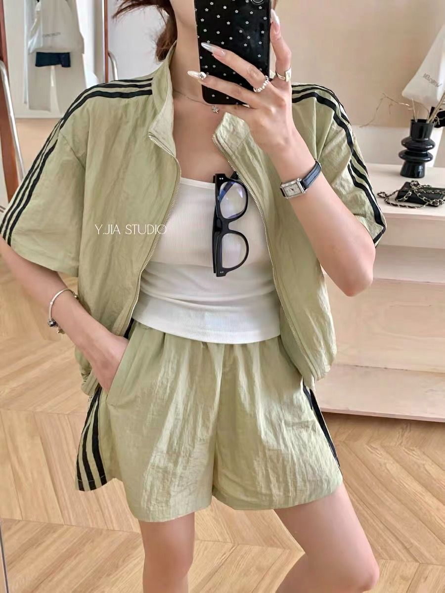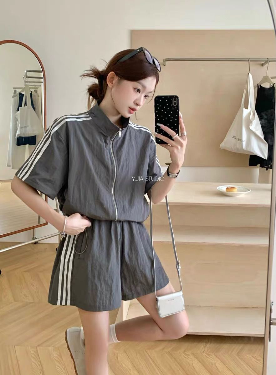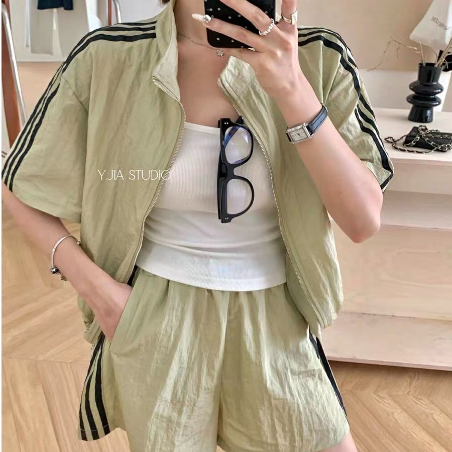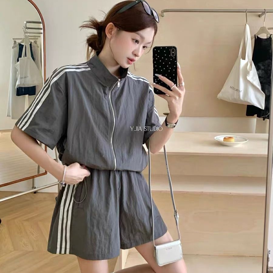 한국 스타일 여성 의류 2026 여름 섹션 아메리칸 운동복 세트 캐주얼 반팔 재킷 하이웨이스트 반바지 두 조각 여성 세트