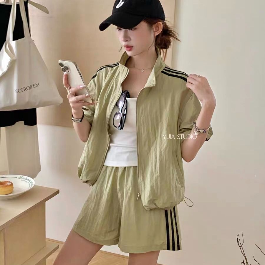 2026 봄 여름 새로운 캐주얼 자외선 차단 얇은 스타일 세트 루즈핏 작은 쇼트 스타일 긴팔 스탠드 칼라 재킷 펌프 로프 미니 스커트 여성