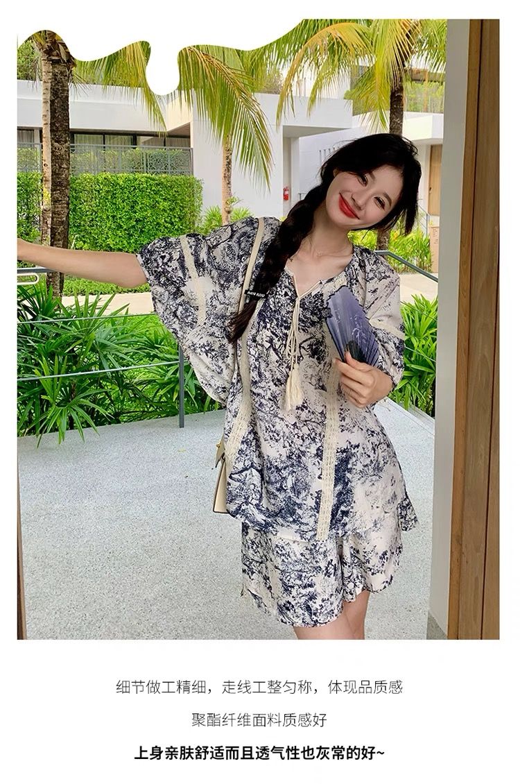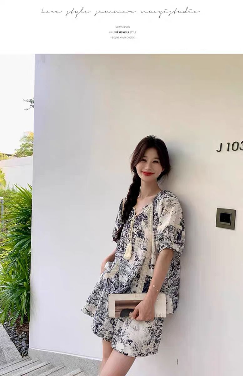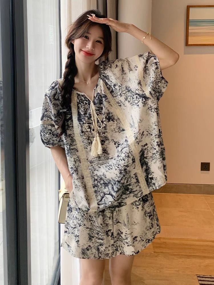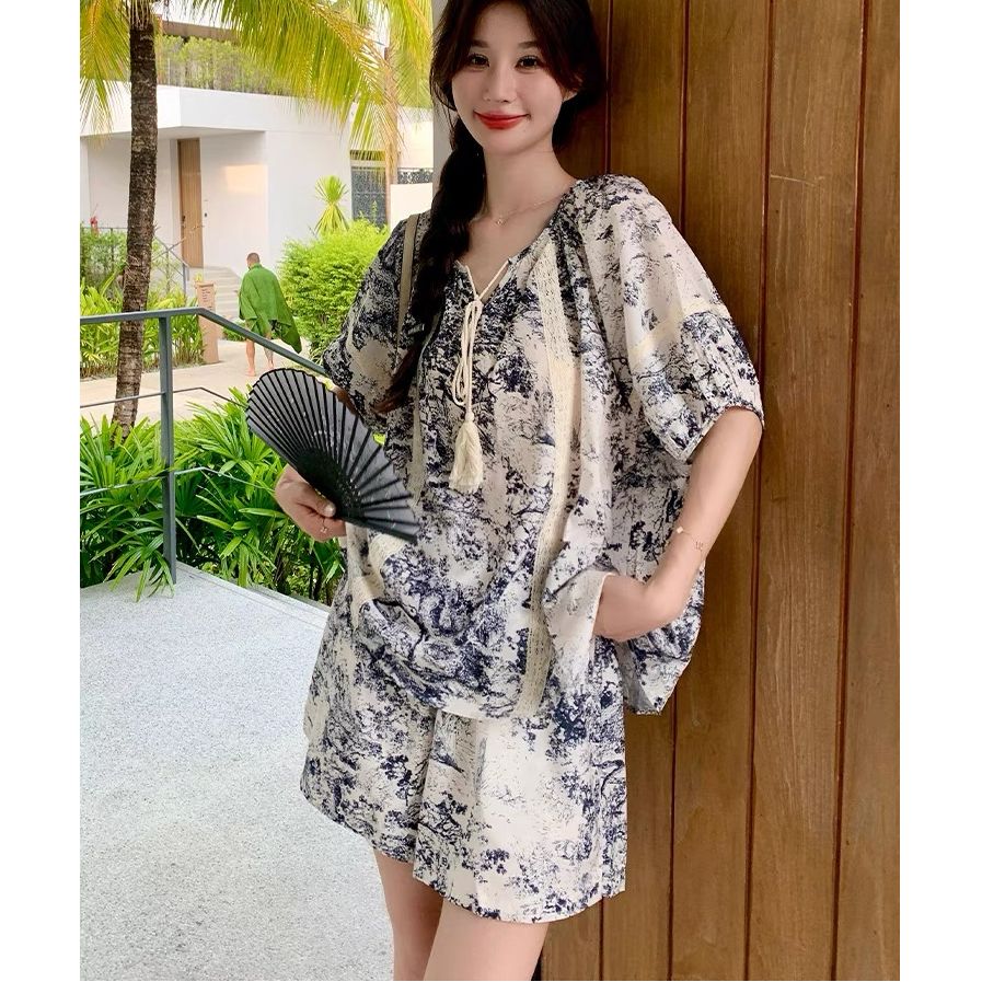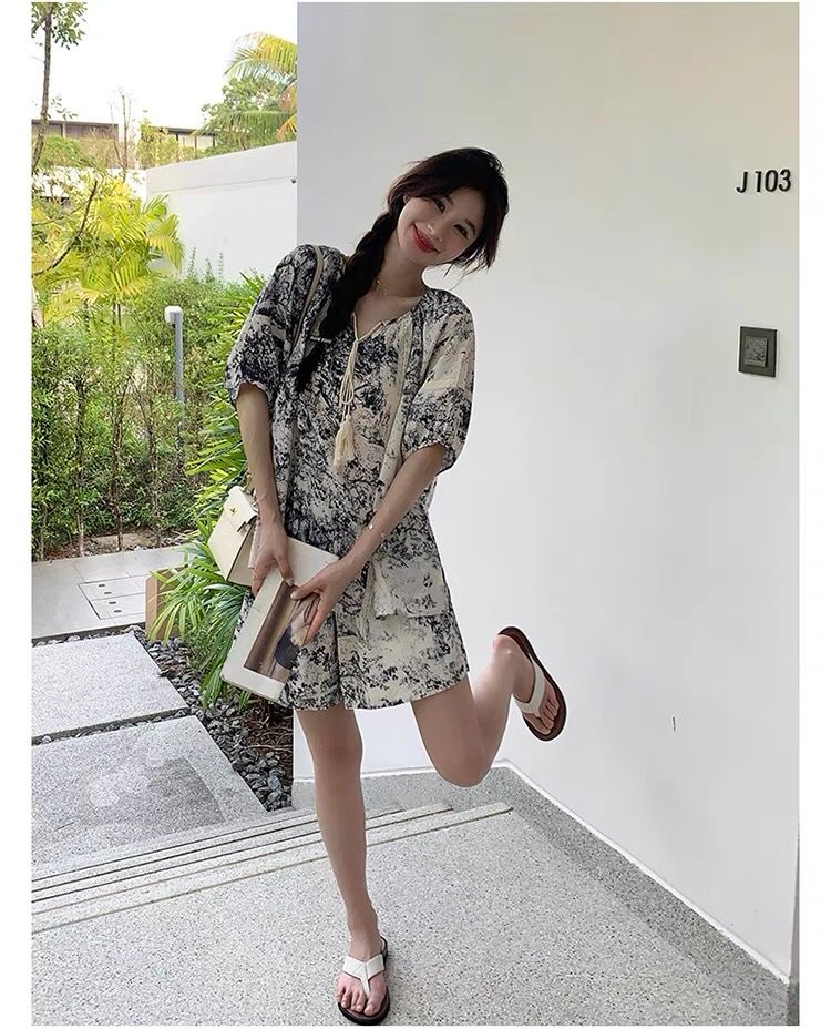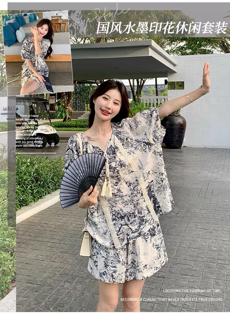 국풍 세트 여성 반바지 2026 여름 새로운 잉크 페인팅 여행 휴가 루즈핏 반팔 맨위 투피스 세트