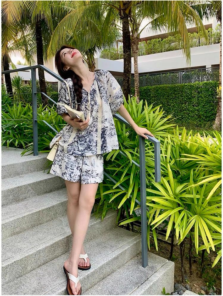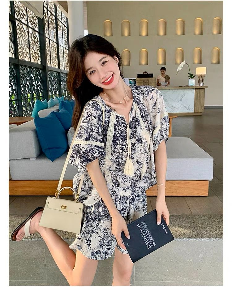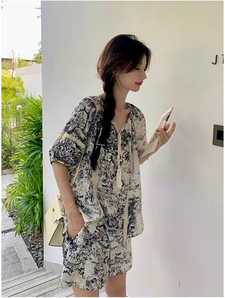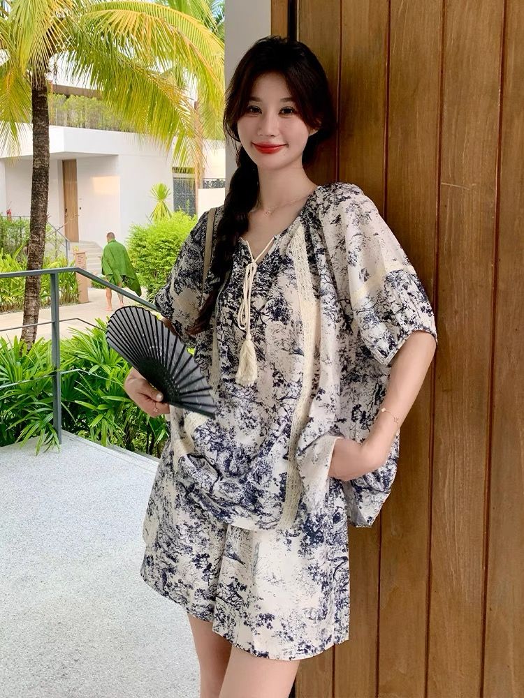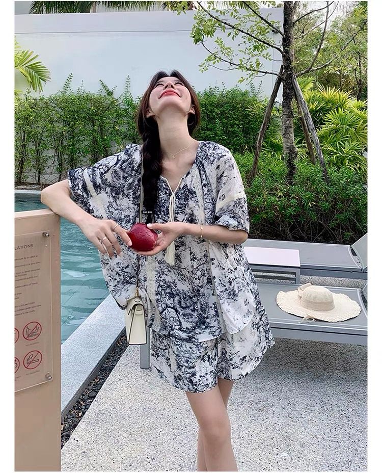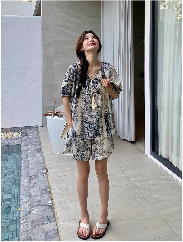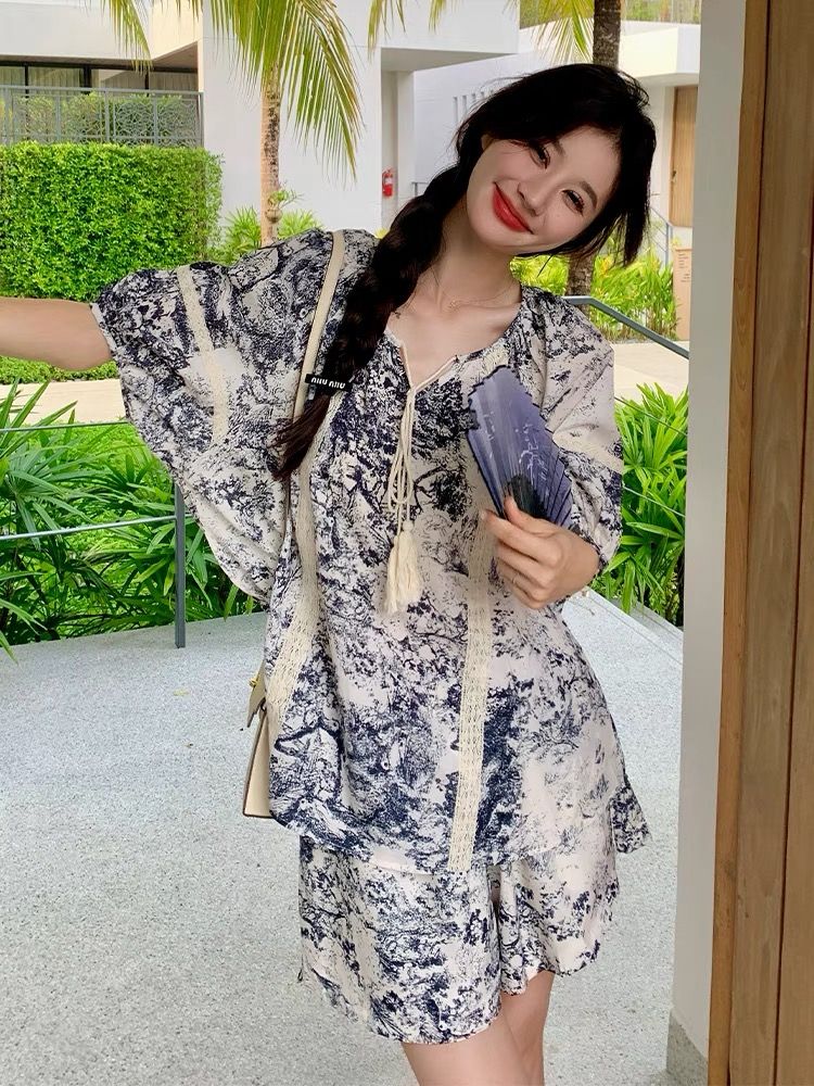 국풍 세트 여성 반바지 2026 여름 새로운 잉크 페인팅 여행 휴가 루즈핏 반팔 맨위 투피스 세트