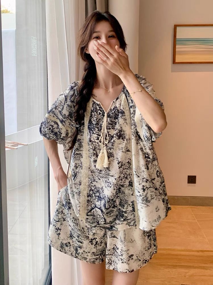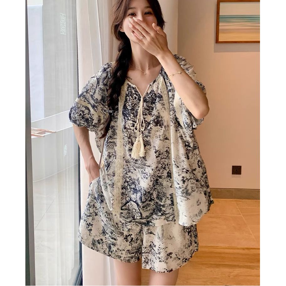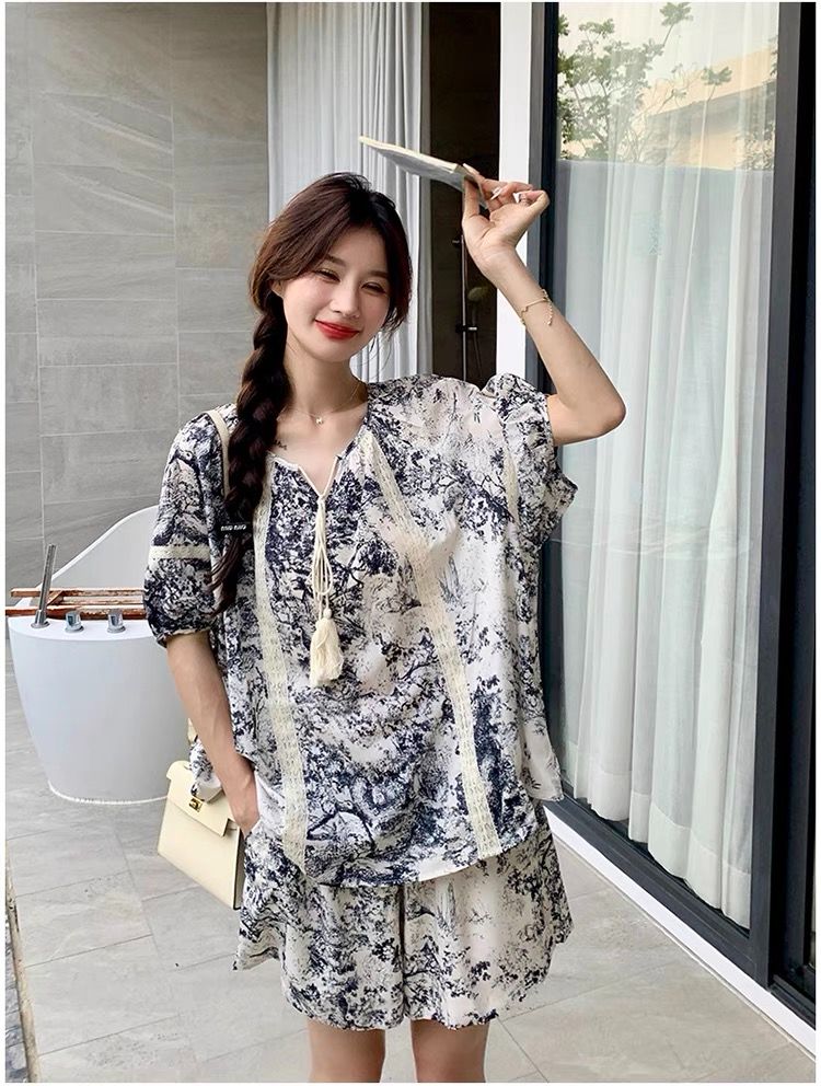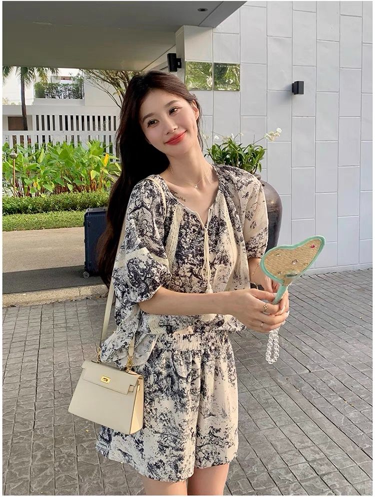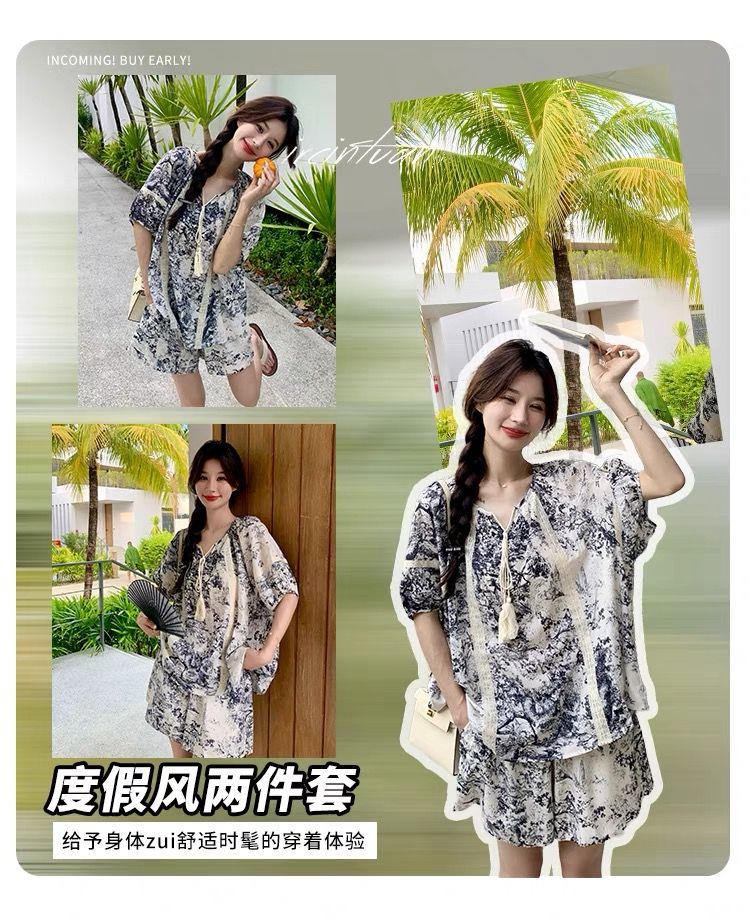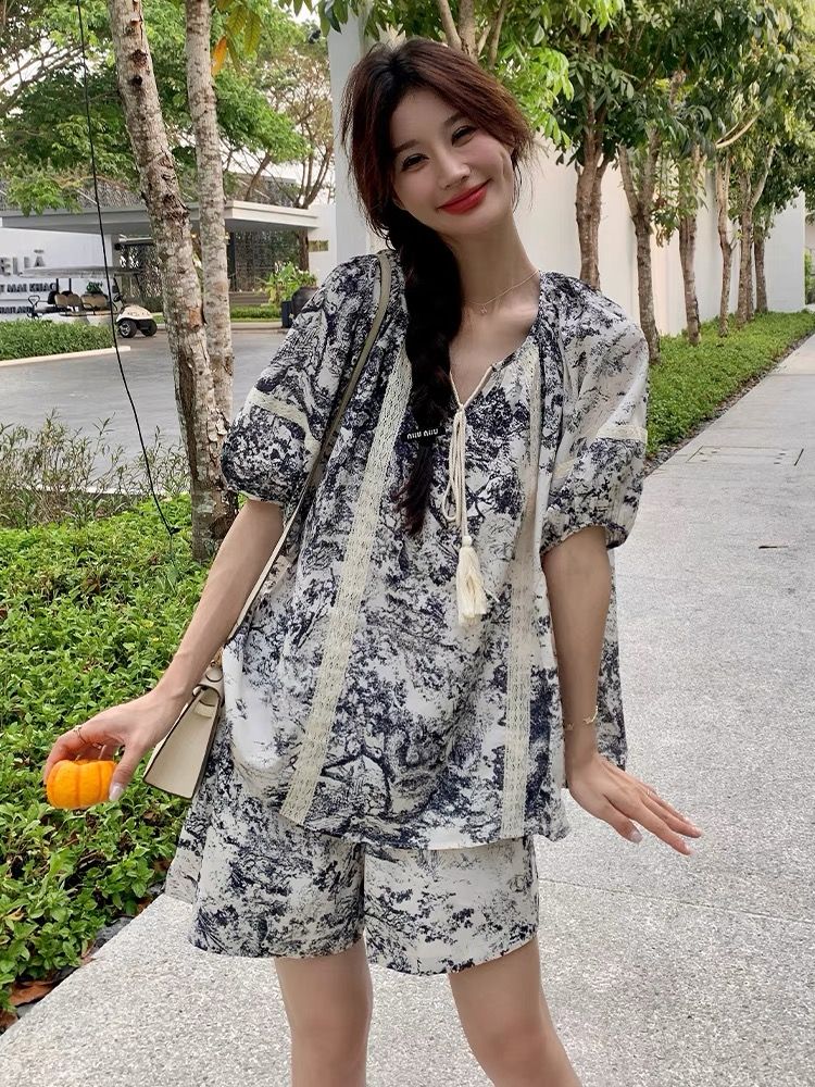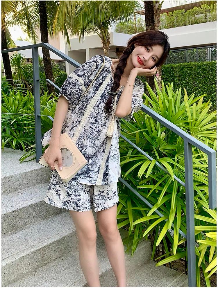 국풍 세트 여성 반바지 2026 여름 새로운 잉크 페인팅 여행 휴가 루즈핏 반팔 맨위 투피스 세트