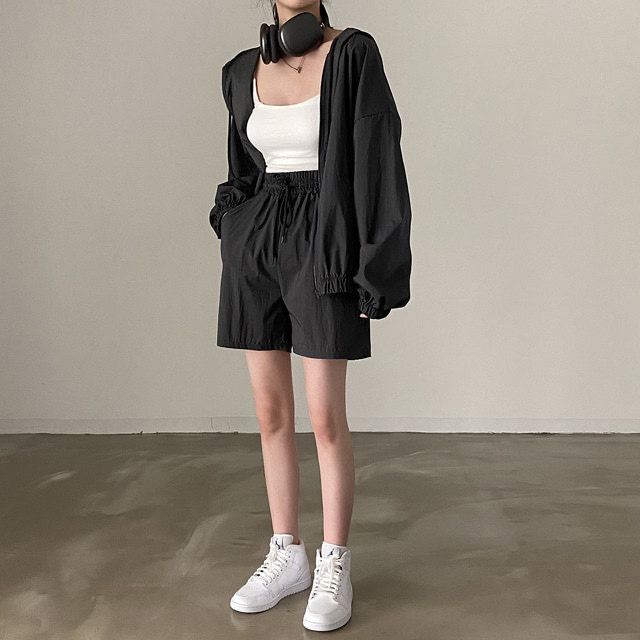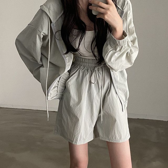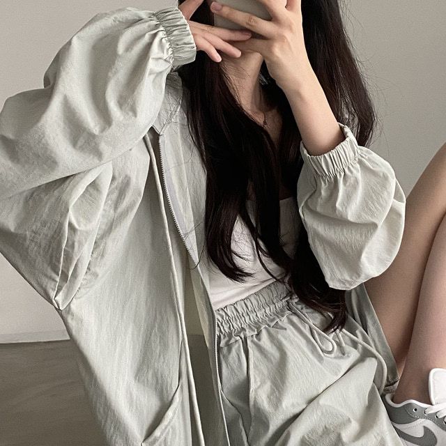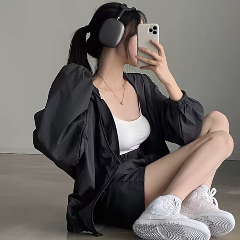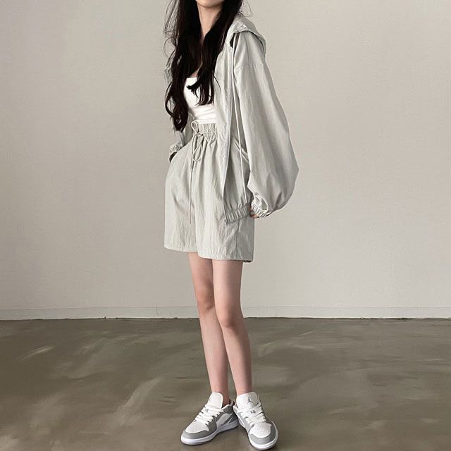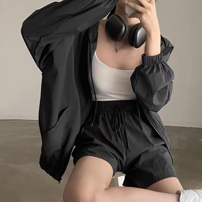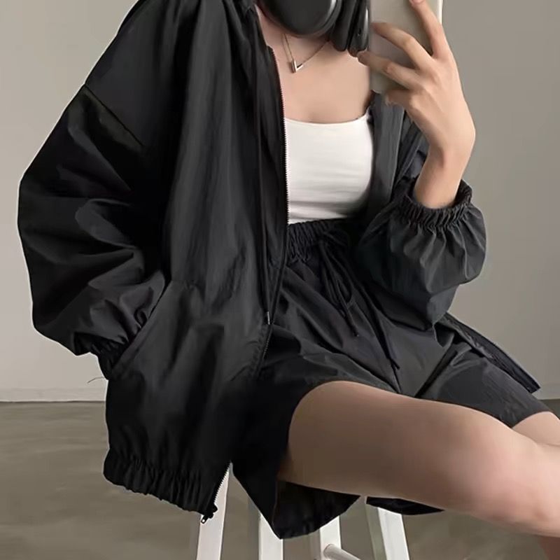 2026 봄 여름 새로운 캐주얼 자외선 차단 얇은 스타일 세트 루즈핏 작은 쇼트 스타일 긴팔 스탠드 칼라 재킷 펌프 로프 미니 스커트 여성