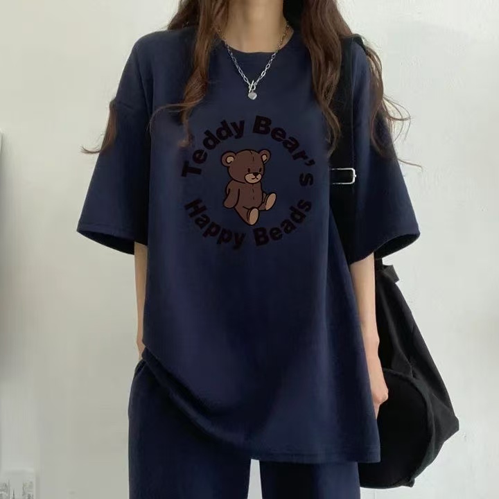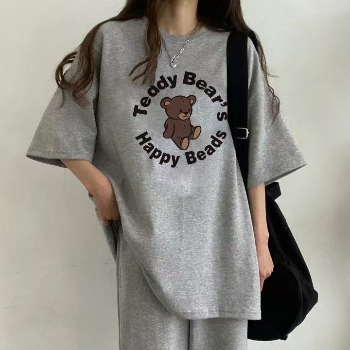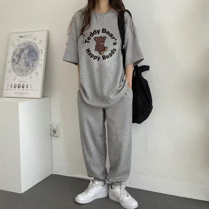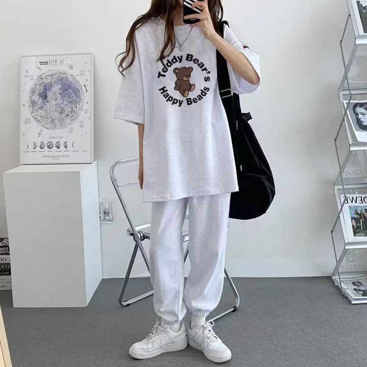 한국 스타일 알파벳 프린트 라운드 넥 반팔 긴 바지 투피스 세트 캐주얼 운동 여름