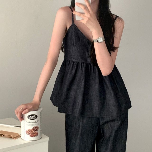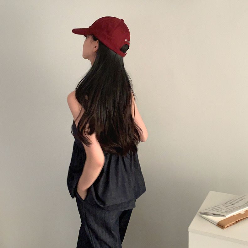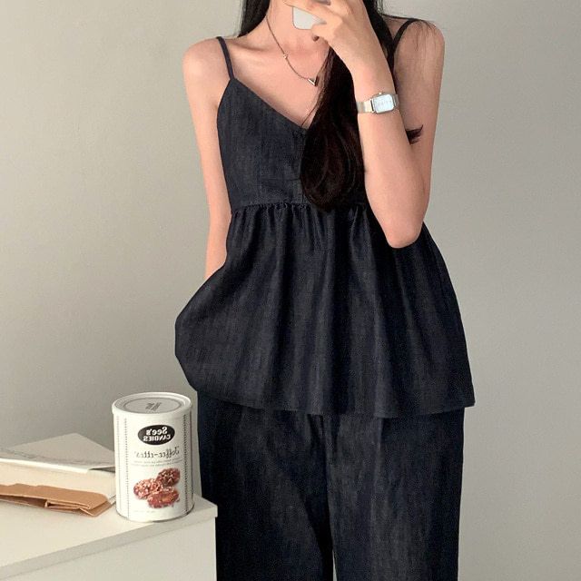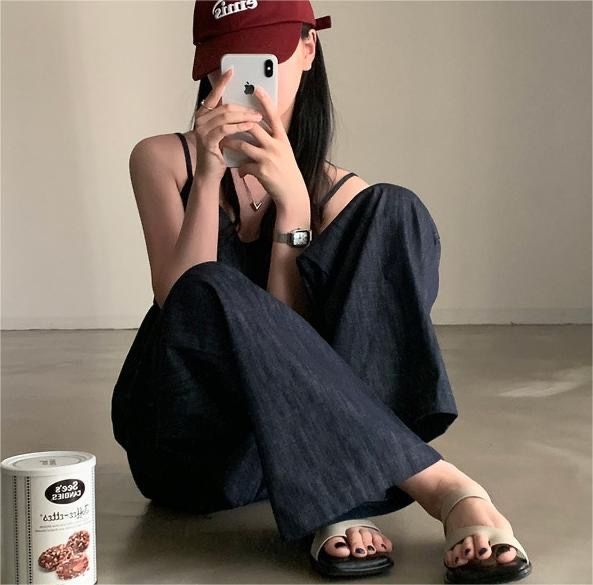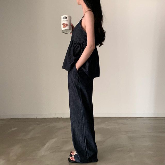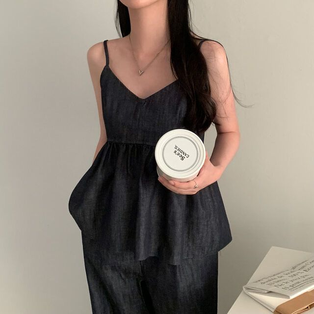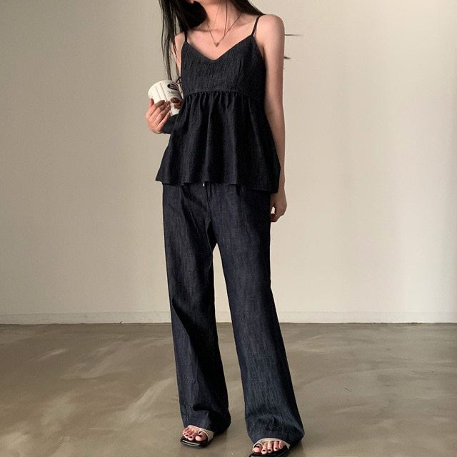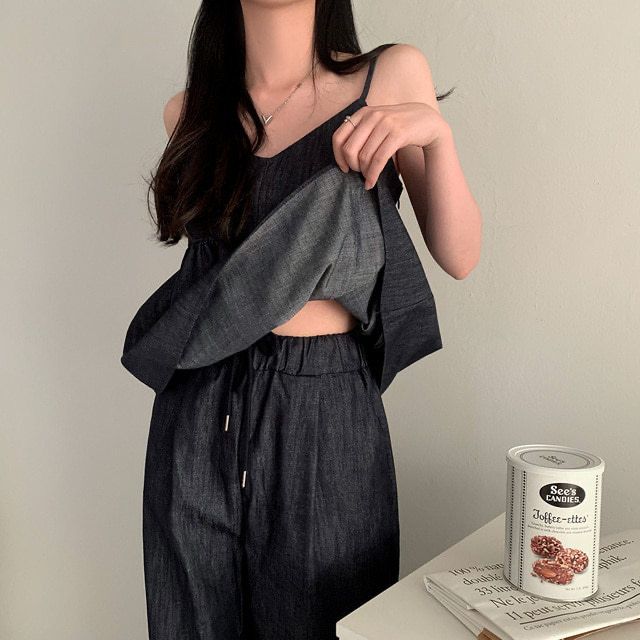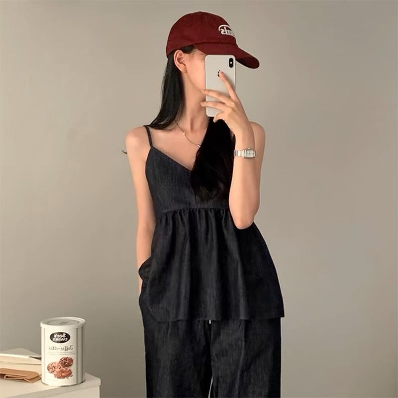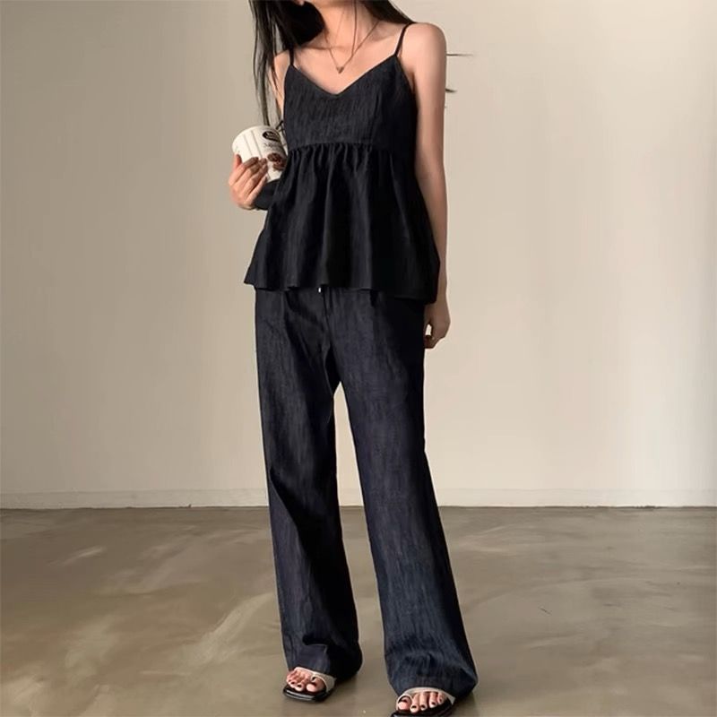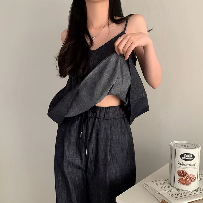 한국 chic 여름 새로운 연령 감소 모방 데님 캐미솔 캐주얼 다용도 허리밴드 스트레이트 팬츠 세트