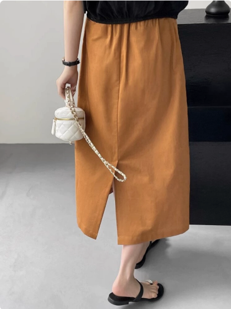 한 부서 허리밴드 루즈핏 면 린넨 스트레이트 치마 여성 2026 여름 새로운 이후 트임 슬림해 보이는 한 마디 중간 길이 스커트