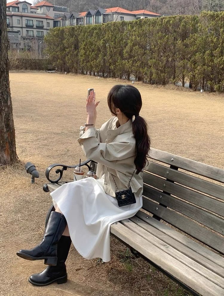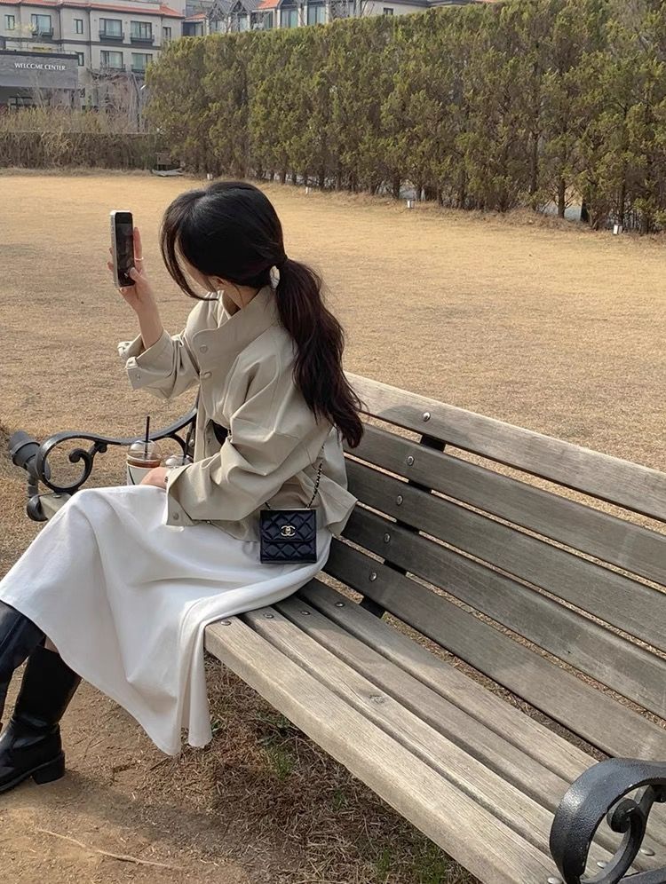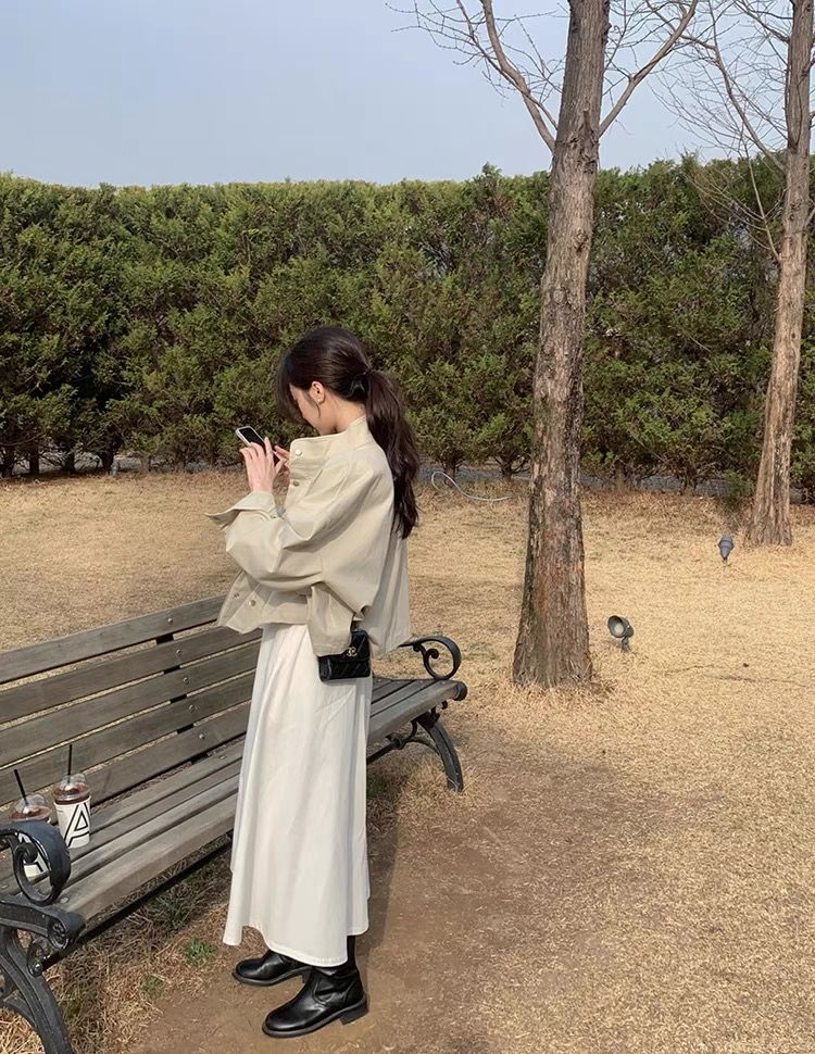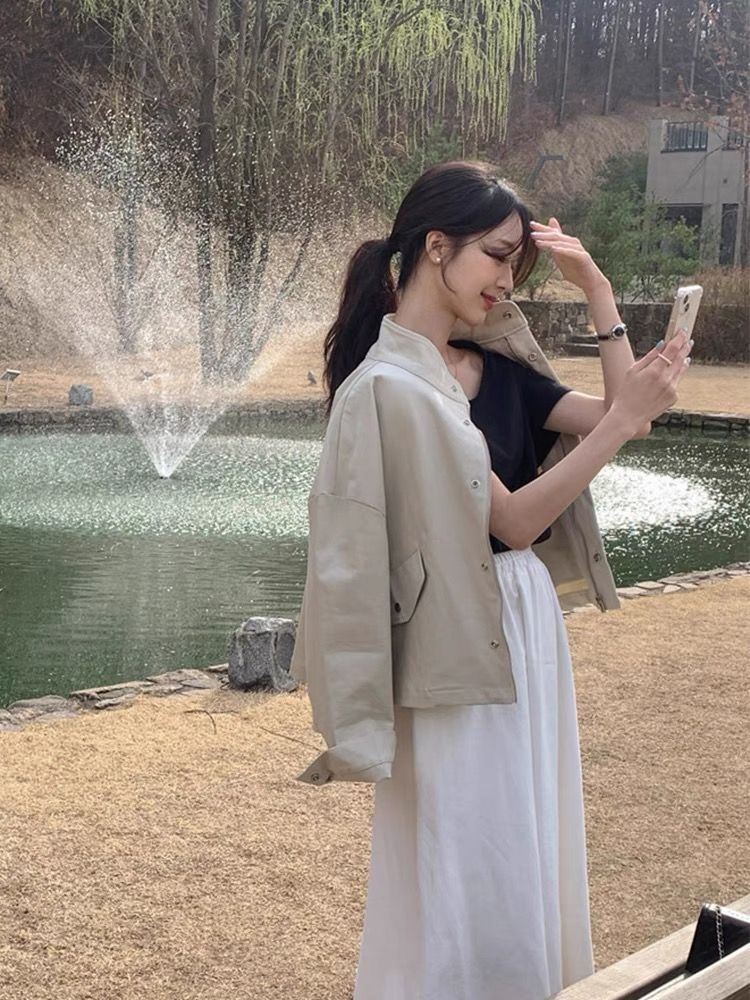 한국 chic 봄 가을 레트로 느긋한 바람 스탠드 칼라 싱글 줄 버튼 루즈핏 캐주얼 긴팔 중간 길이 바람막이 여성 코트