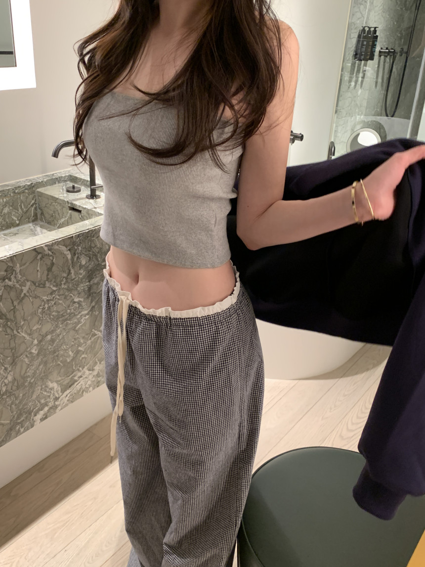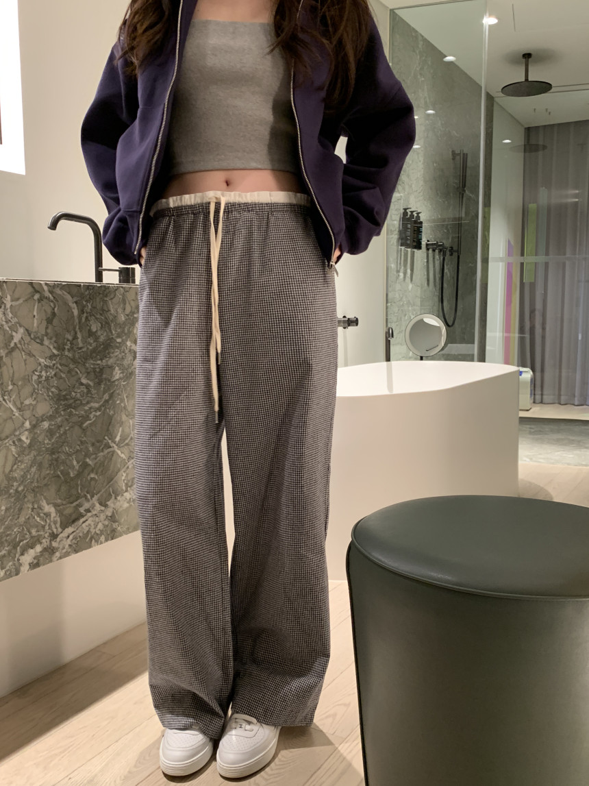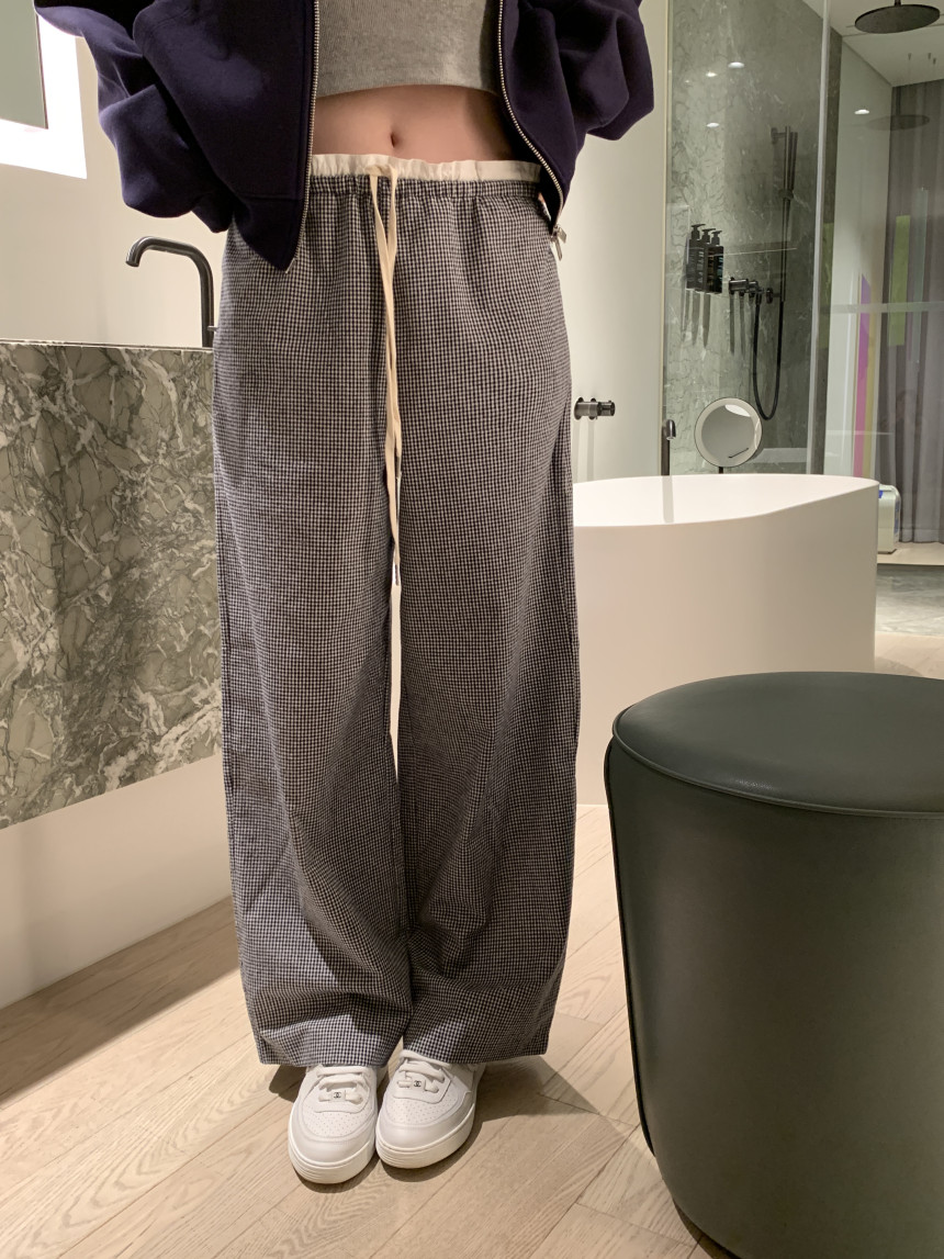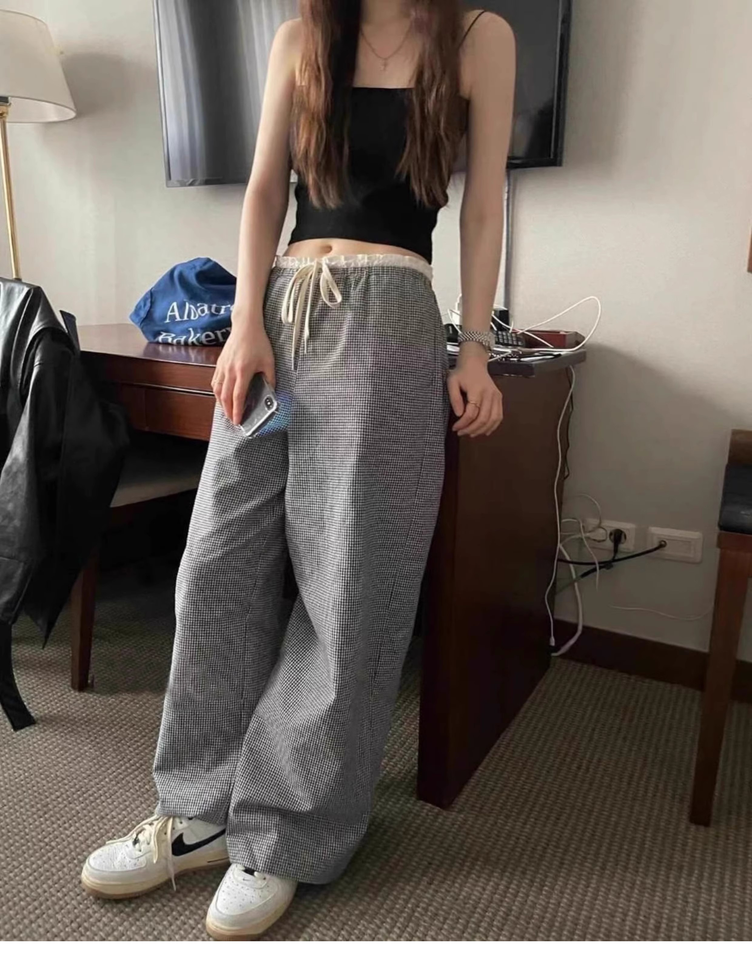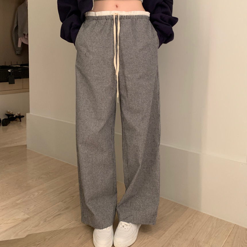 한국 ins 봄 여름 레트로 레이스 패치워크 작은 체크무늬 루즈핏 느긋한 바람 스트레이트 캐주얼 바지