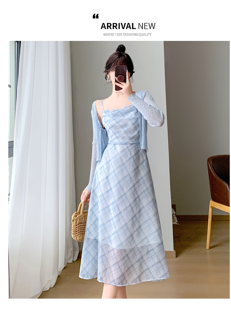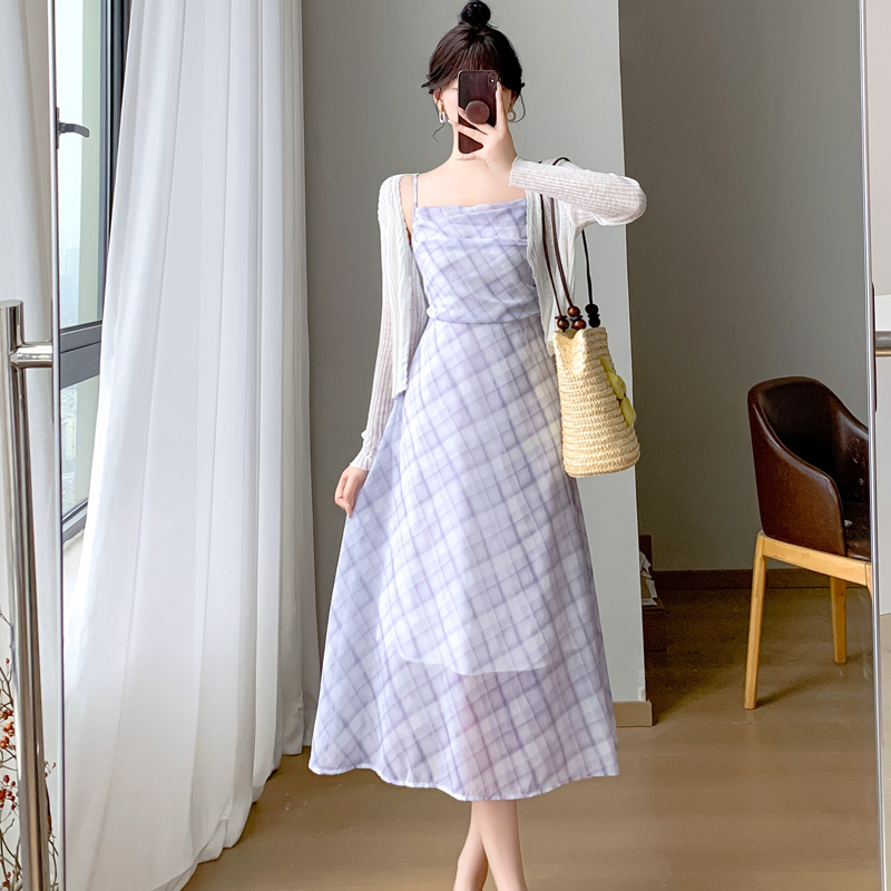 실사 새로운 프랑스식 고급 센스 작은 키 쉬폰 롱 스커트 체크무늬 녹색 슬립 드레스 투피스 슈트 여성