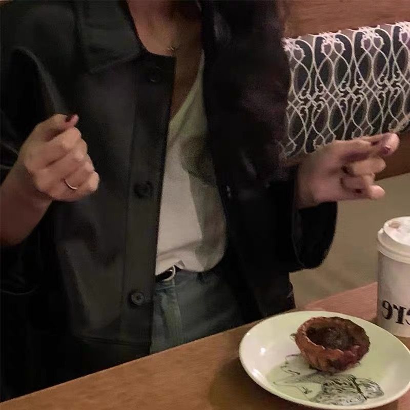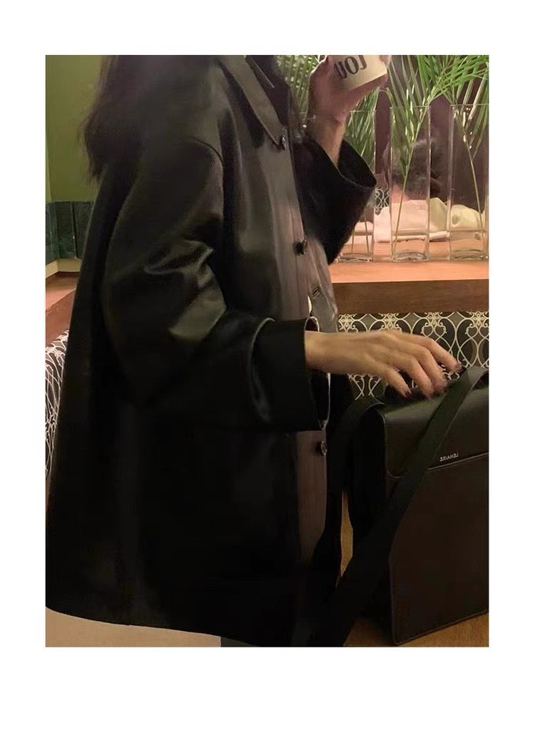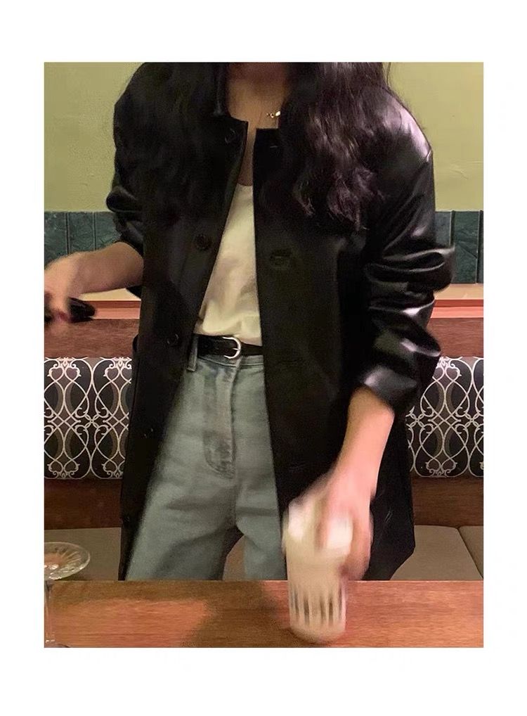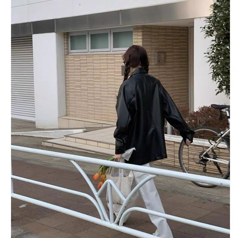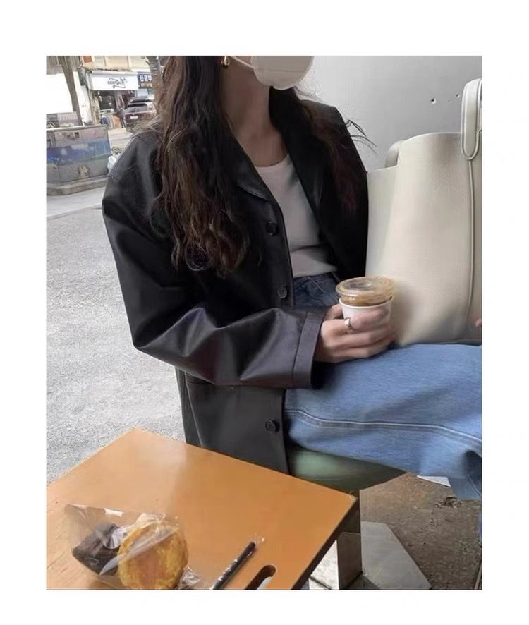 26 한국 잘 생긴 폴로 칼라 싱글 줄 버튼 가죽 재킷 여성 코트 가을 새로운 루즈핏 다용도 모조 가죽 재킷 맨위