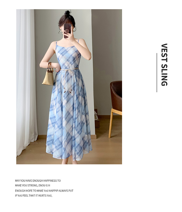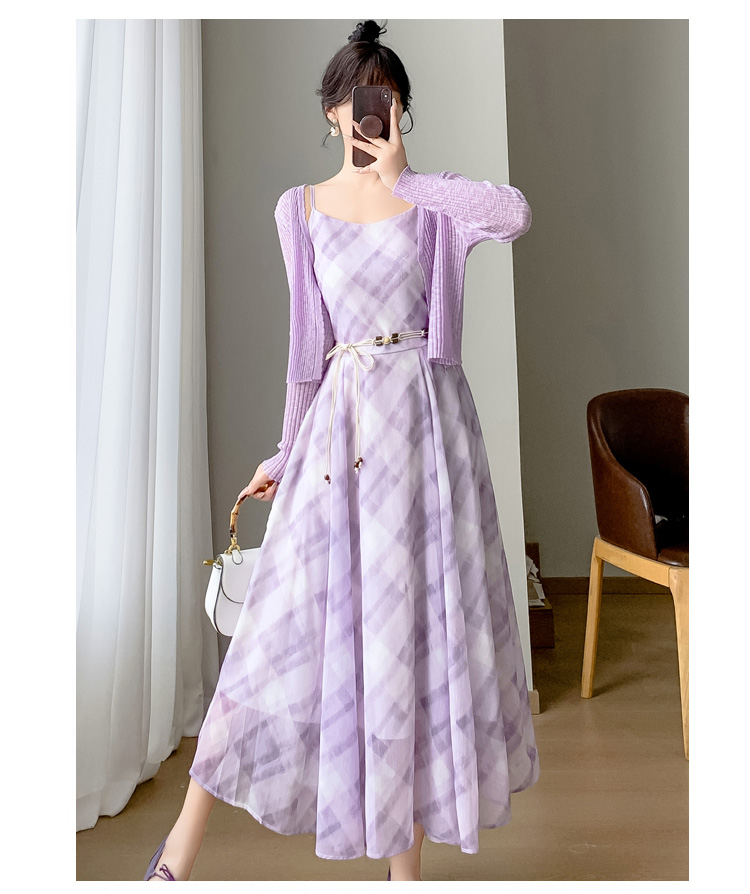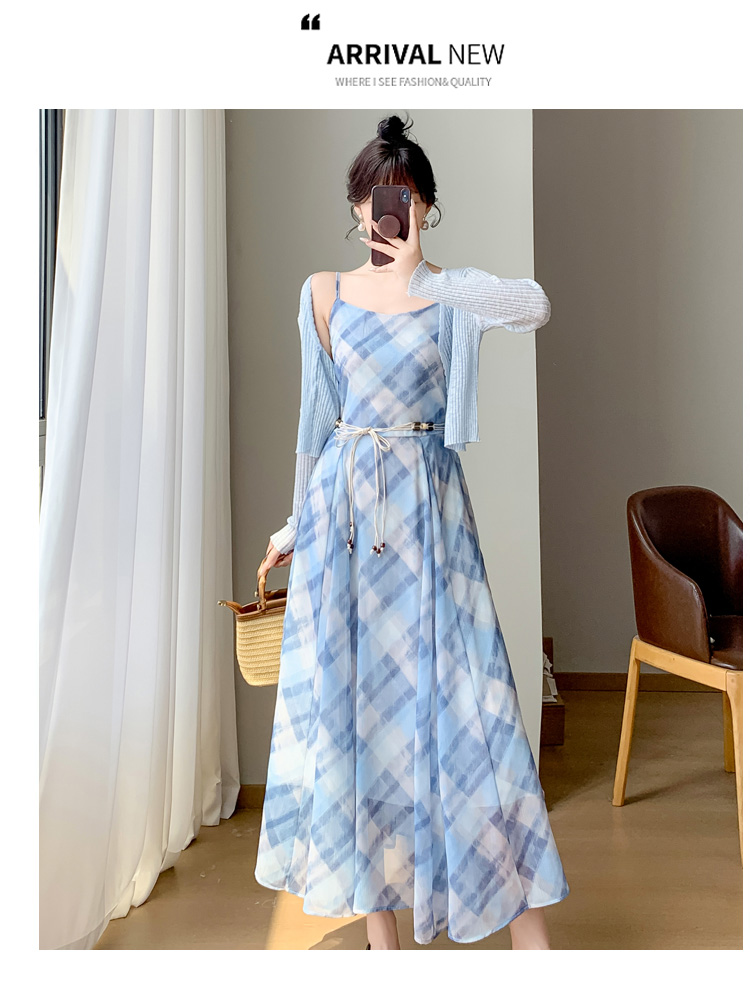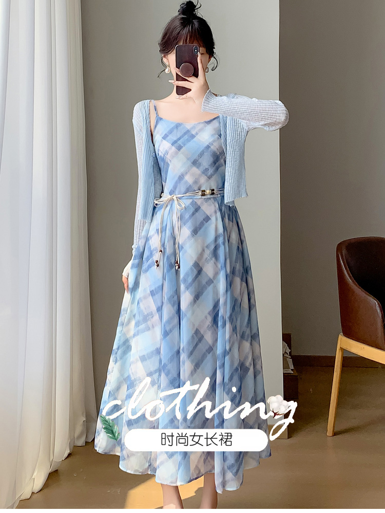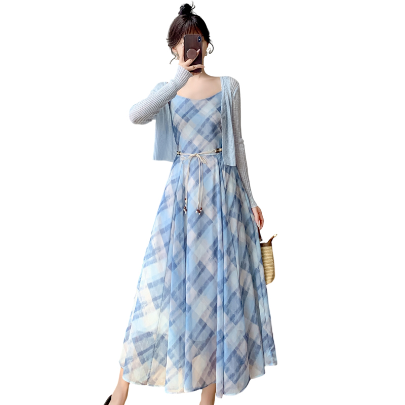 실사 새로운 프랑스식 고급 센스 작은 키 쉬폰 롱 스커트 체크무늬 녹색 슬립 드레스 투피스 슈트 여성