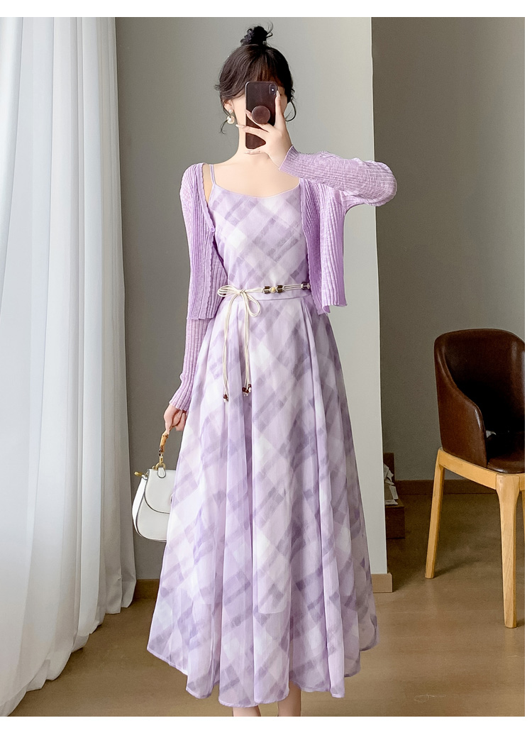 2026 섹션 고급 센스 작은 키 아름다운 꼬집기 허리 롱 스커트 보라색 꽃무늬 슬립 드레스 투피스 슈트 여성 여름