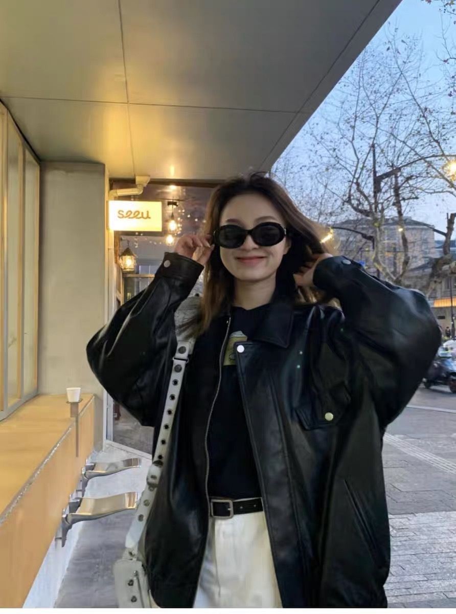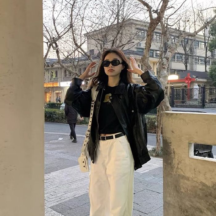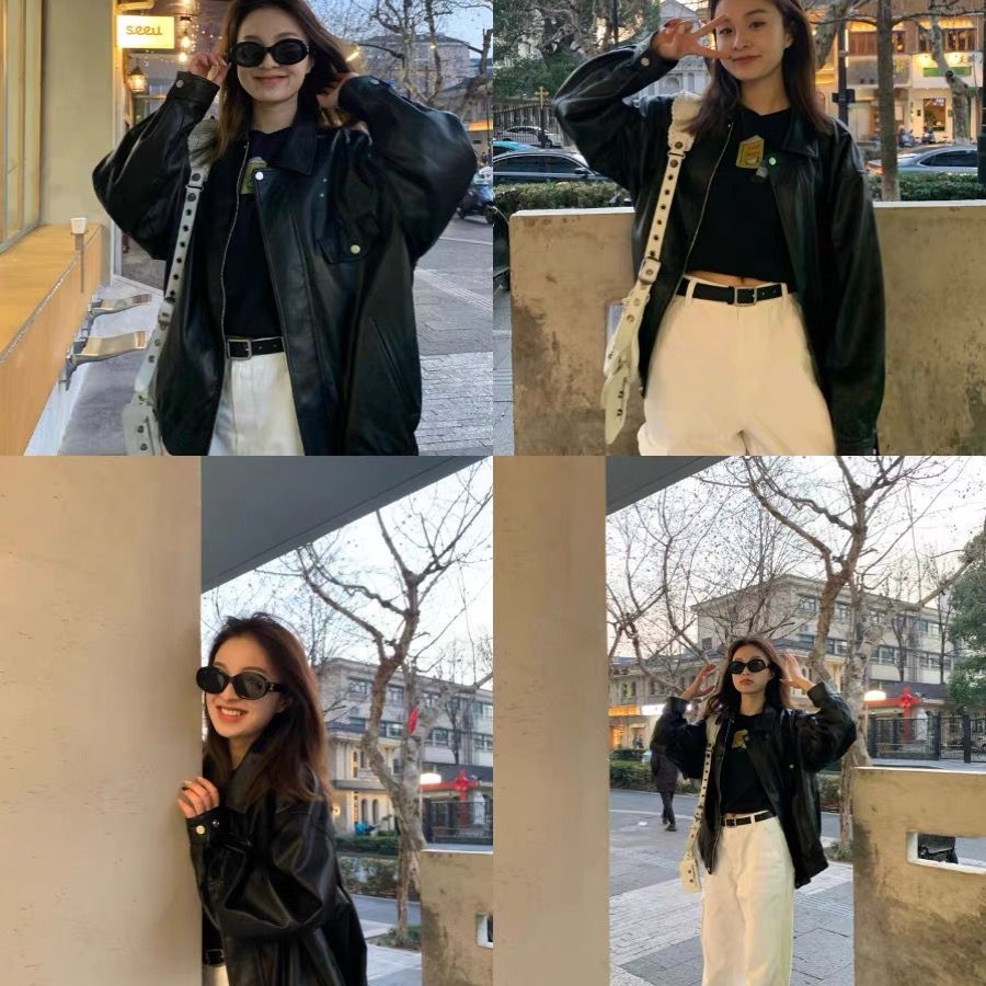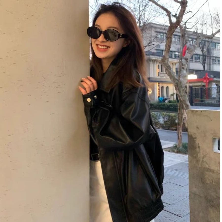 26 한국 잘 생긴 폴로 칼라 싱글 줄 버튼 가죽 재킷 여성 코트 가을 새로운 루즈핏 다용도 모조 가죽 재킷 맨위