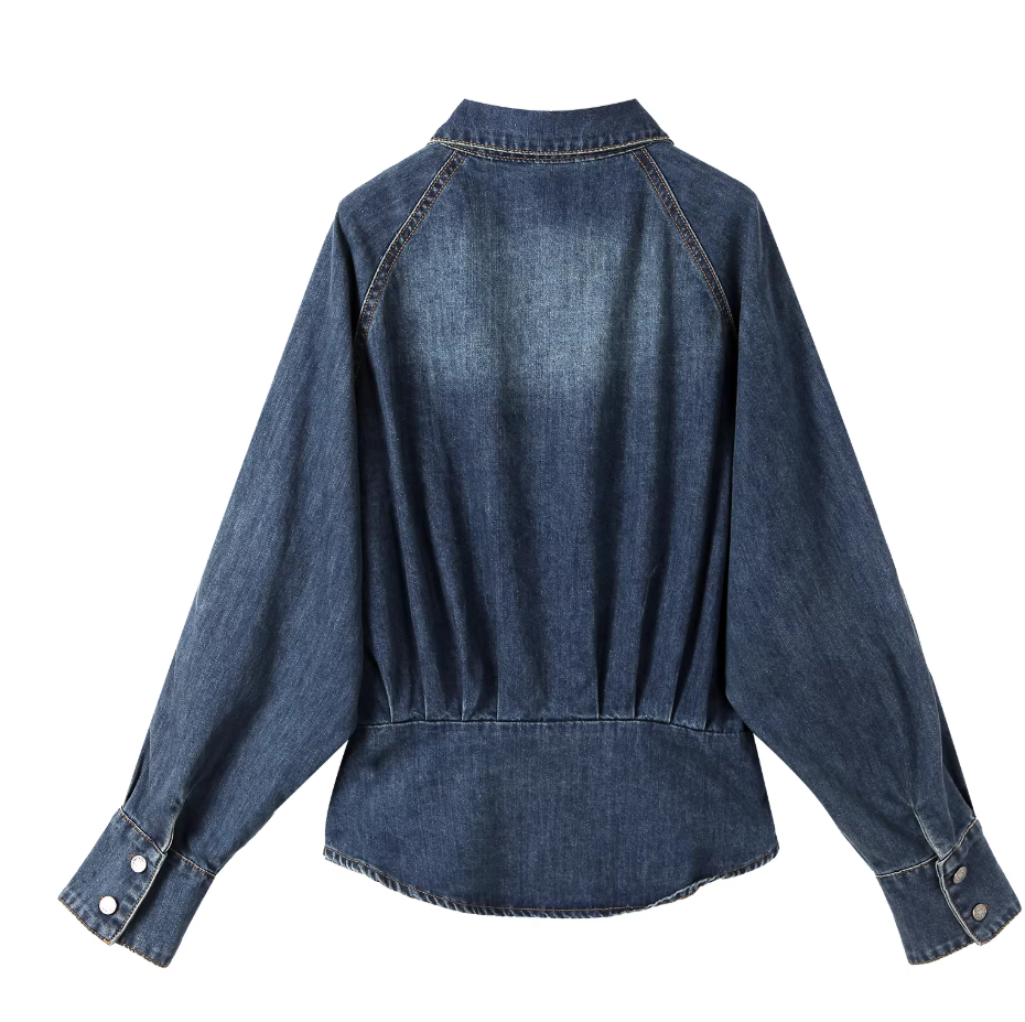 고급 센스 항구 바람 레트로 마 오래된 데님 셔츠 POLO 칼라 허리 수축 슬림해 보이는 조기 봄 한국 스타일 슬림해 보이는 여성 셔츠