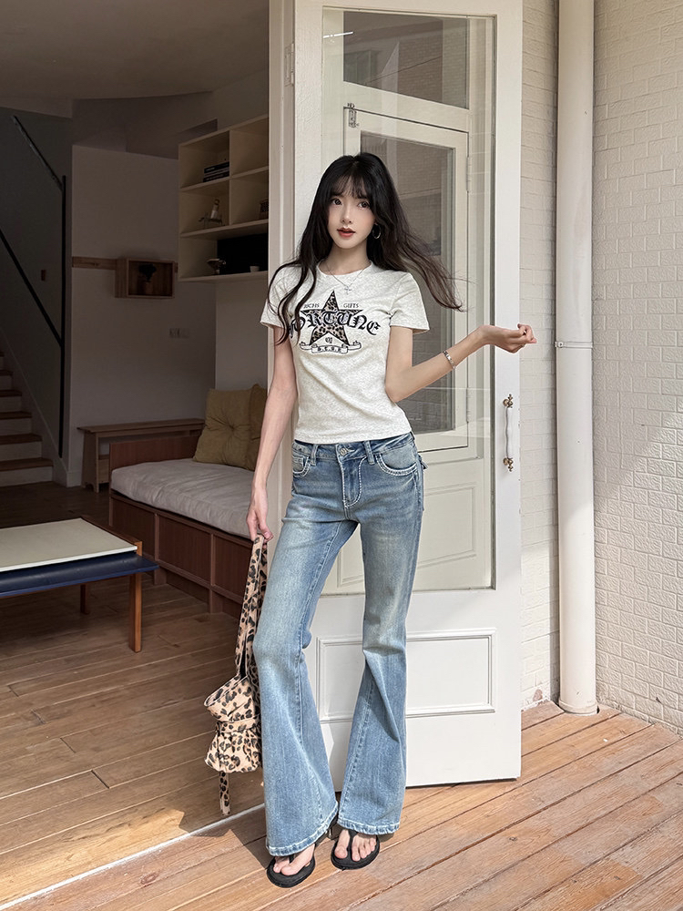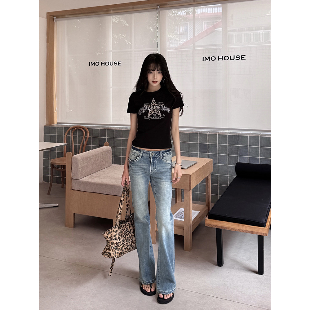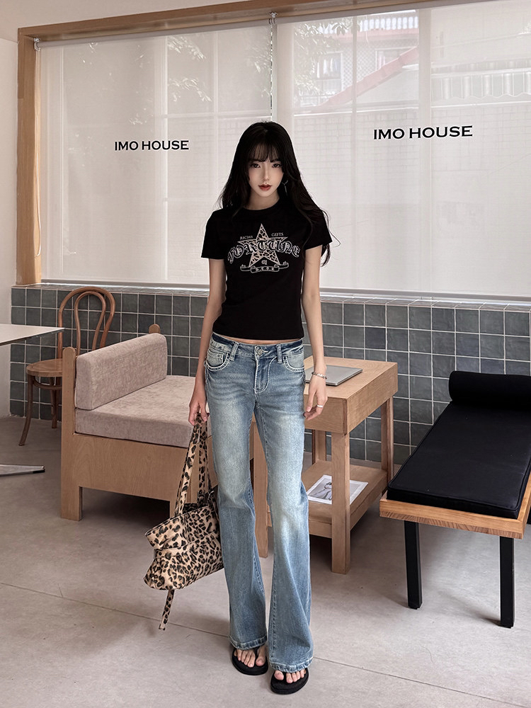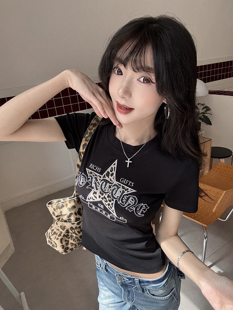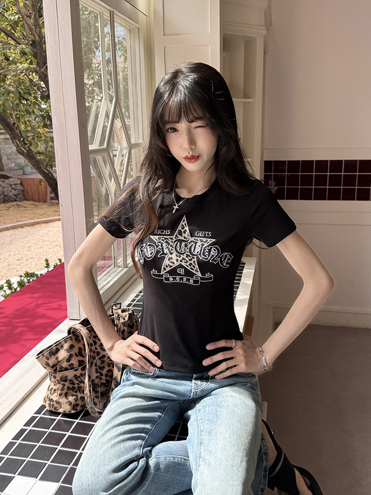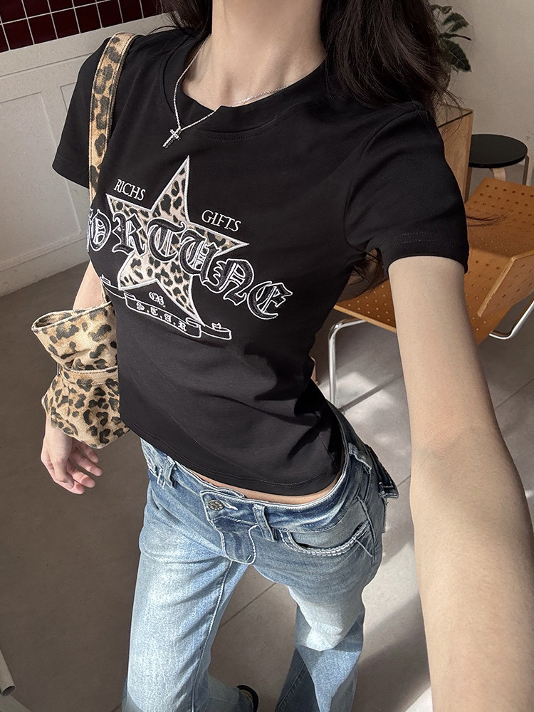 40 오스트리아 세대 서울 210 그램 순면 티셔츠 별 패치 레트로 자수 여름 핫걸 긍정적 인 어깨 짧은 레오파드 무늬 맨위