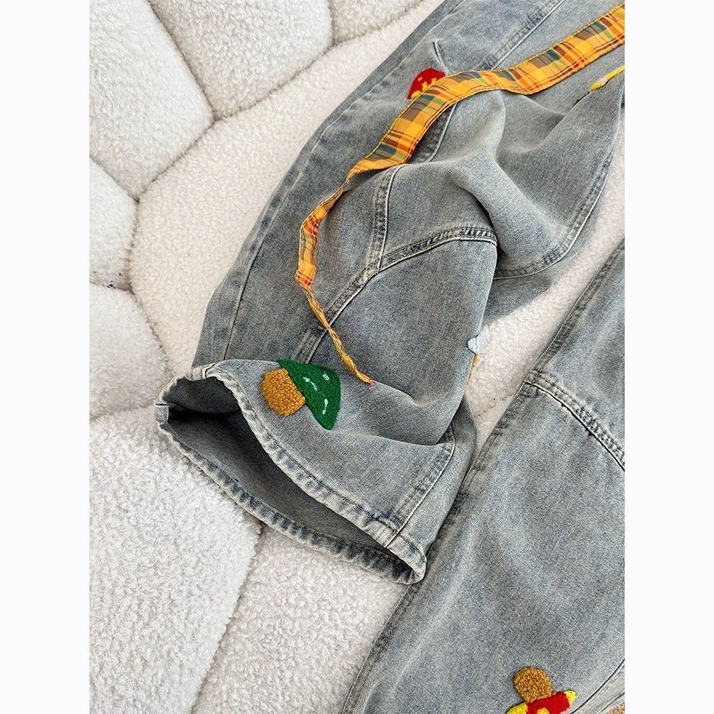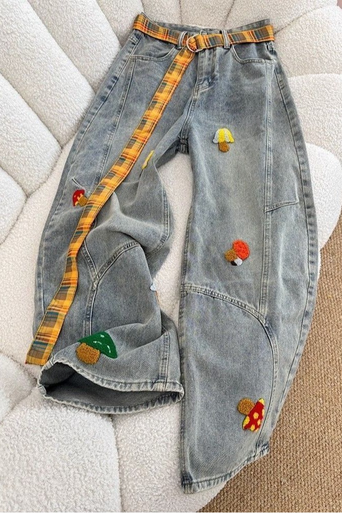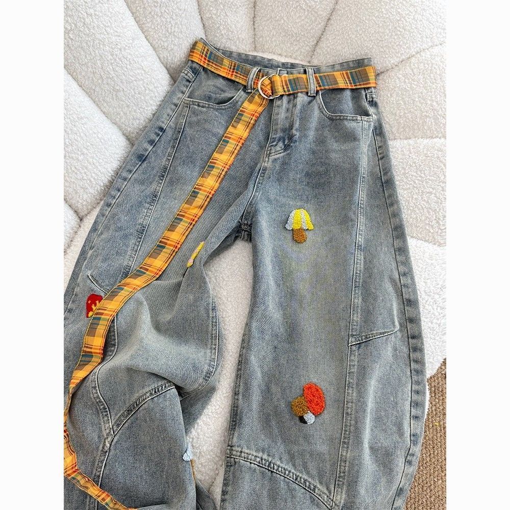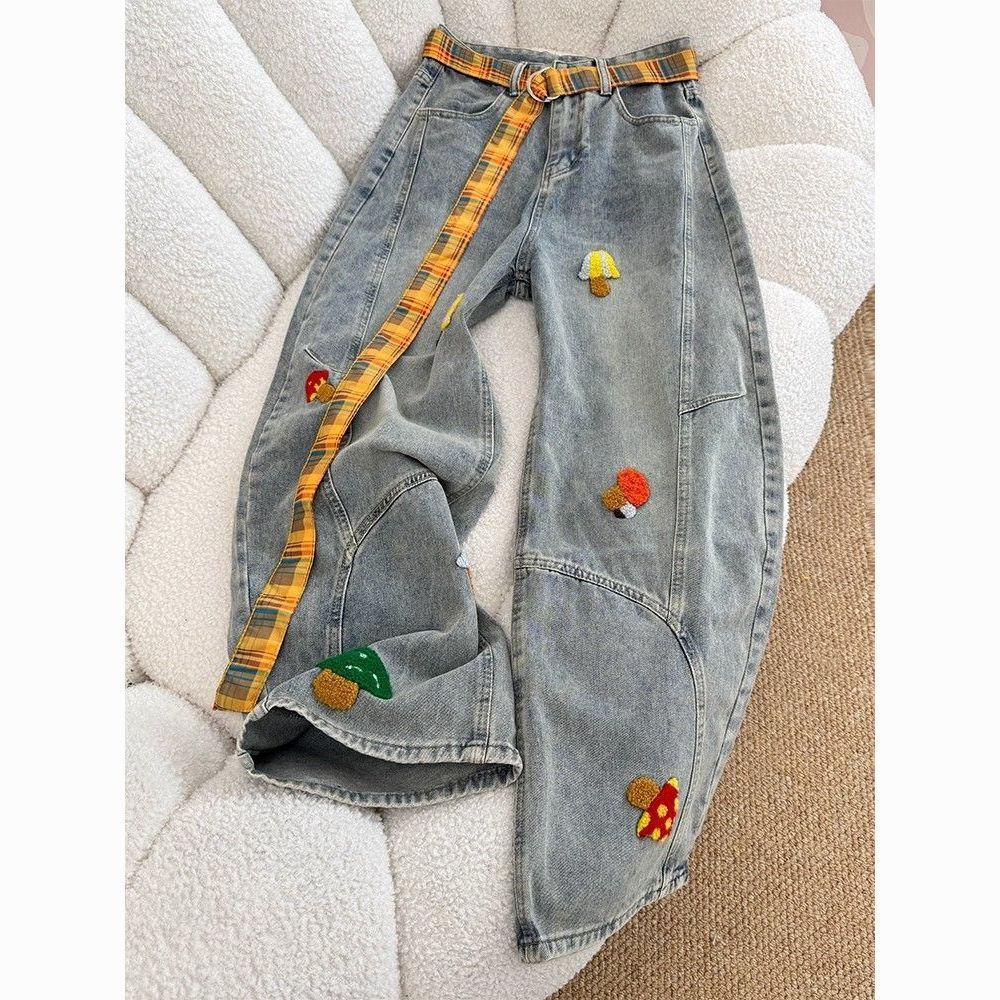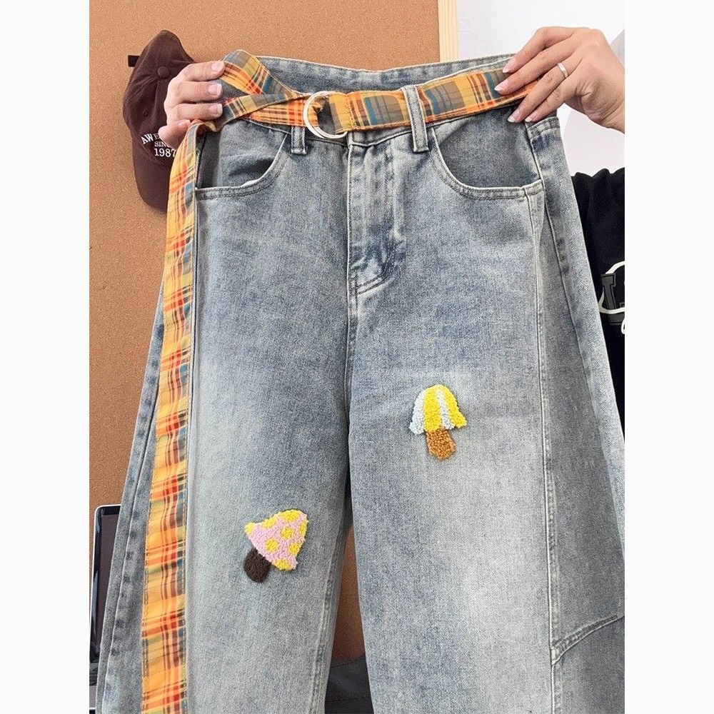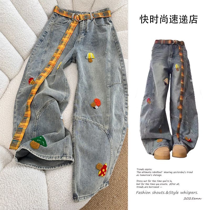 도파민 만화 자수 패턴 넓은 다리 청바지 여성 봄 가을 새로운 슬림해 보이는 도루 센스 루즈핏 청바지 트렌디