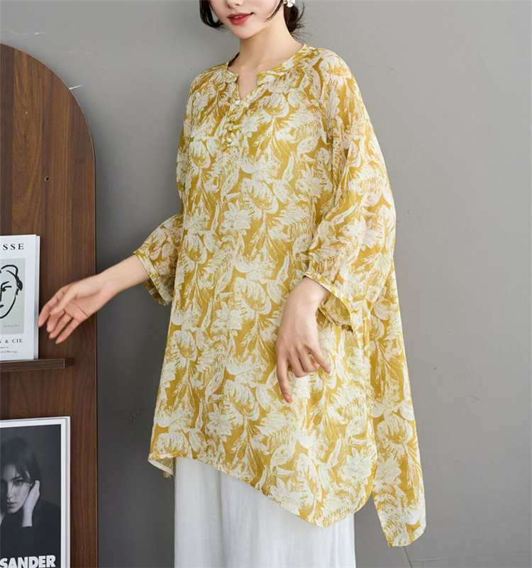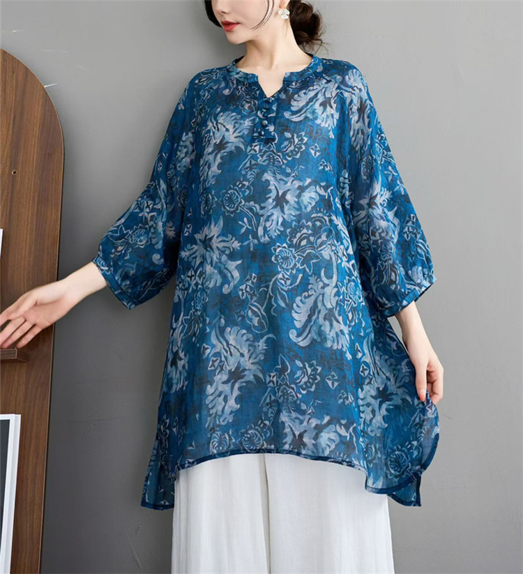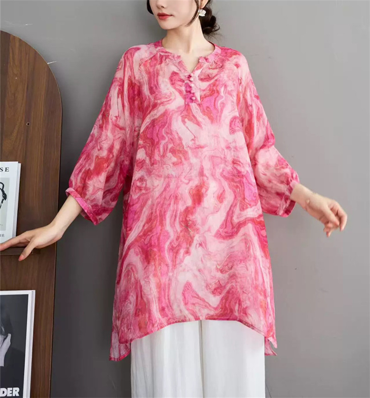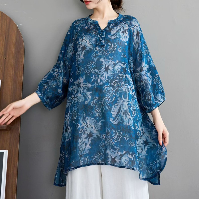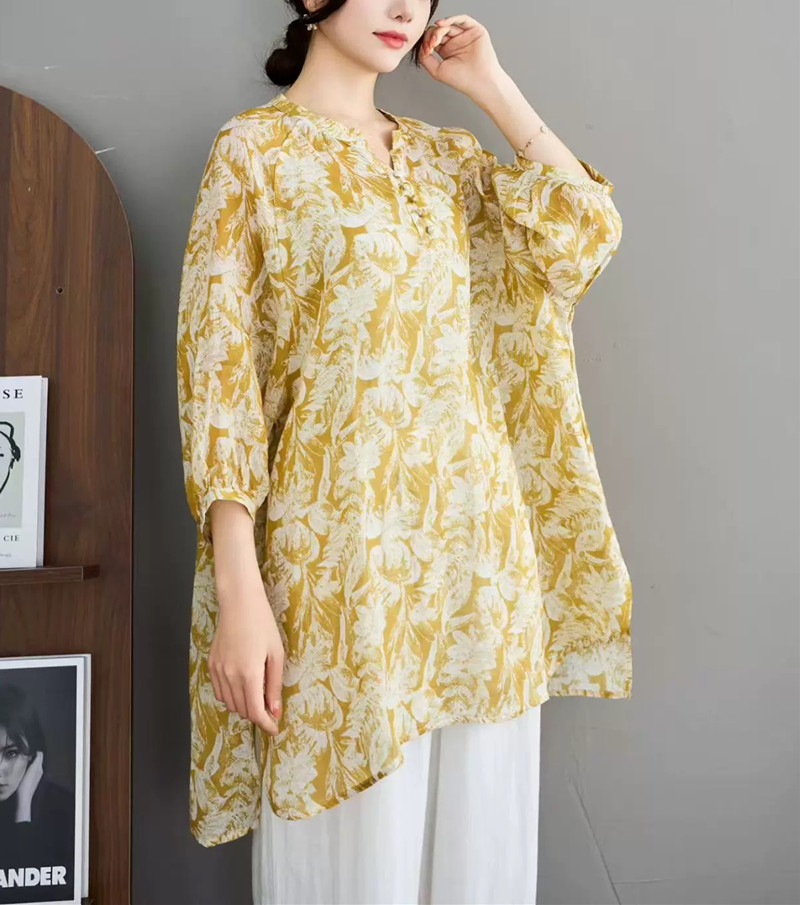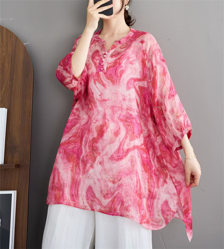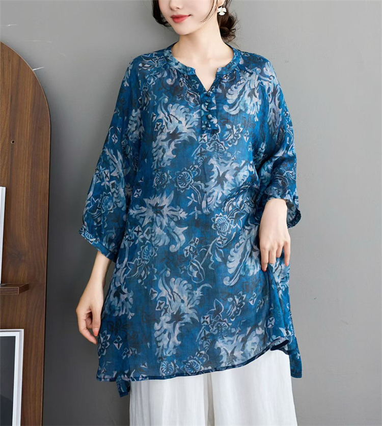 봄 여름 통기성 슬림해 보이는 중간 길이 드레스 프린트 루즈핏 레트로 7부 소매 풀오버 빅 사이즈 여성 의류