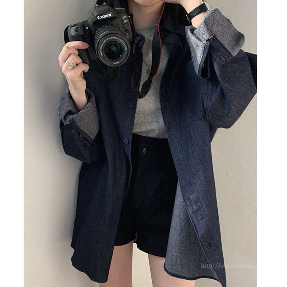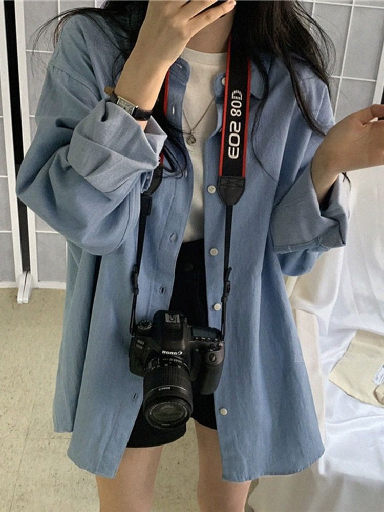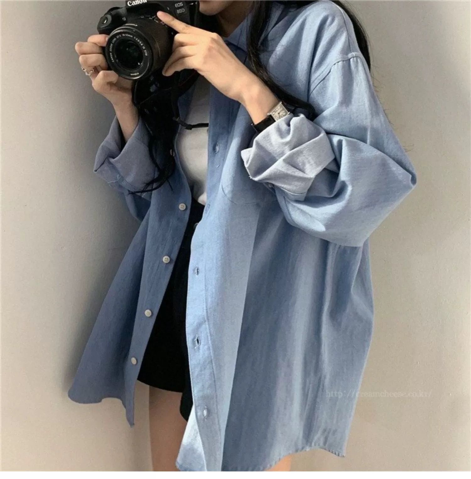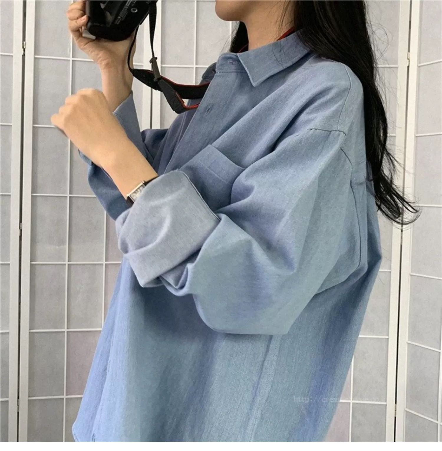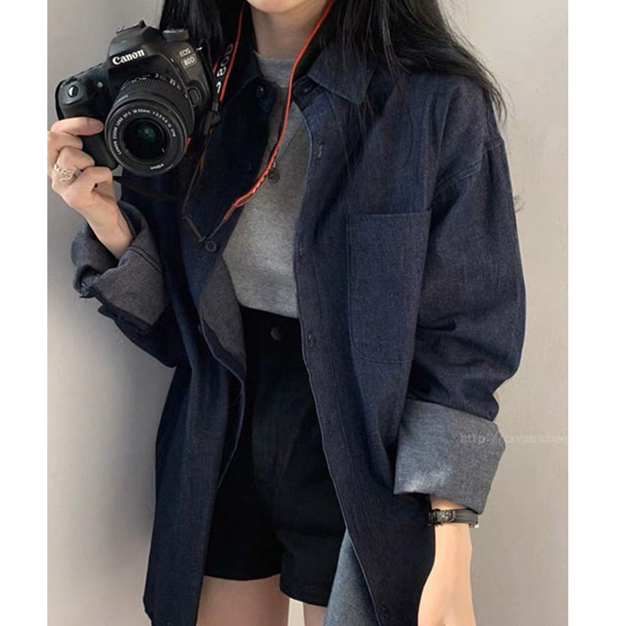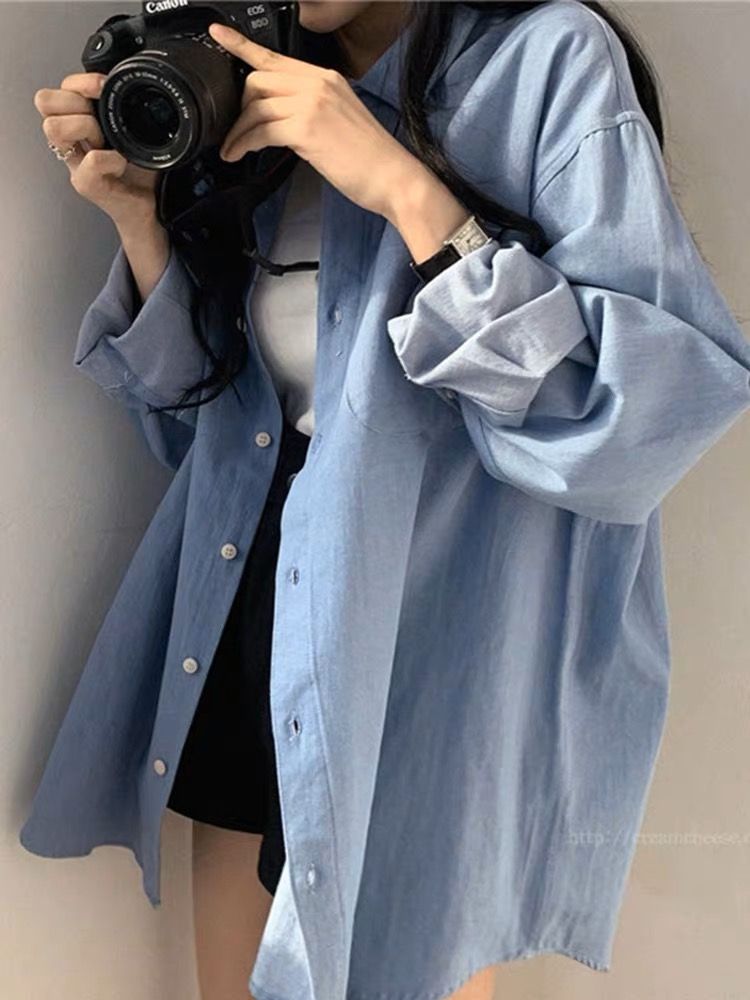 한국 chic 가을 프랑스식 미니멀리즘 폴로 칼라 oversize 루즈핏 캐주얼 단색 다용도 긴팔 셔츠 맨위