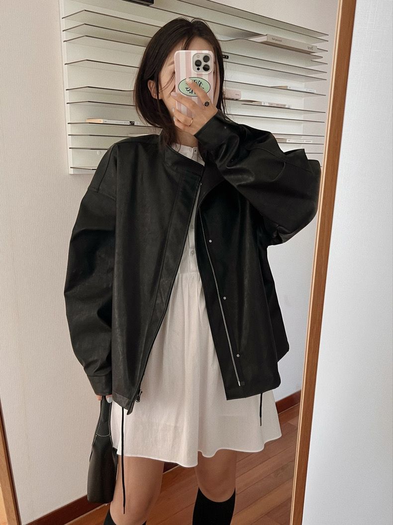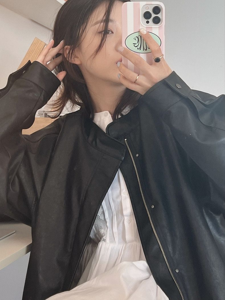 26 한국 잘 생긴 폴로 칼라 싱글 줄 버튼 가죽 재킷 여성 코트 가을 새로운 루즈핏 다용도 모조 가죽 재킷 맨위