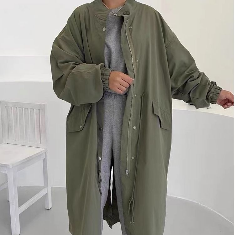 한국 chic 봄 가을 레트로 느긋한 바람 스탠드 칼라 싱글 줄 버튼 루즈핏 캐주얼 긴팔 중간 길이 바람막이 여성 코트