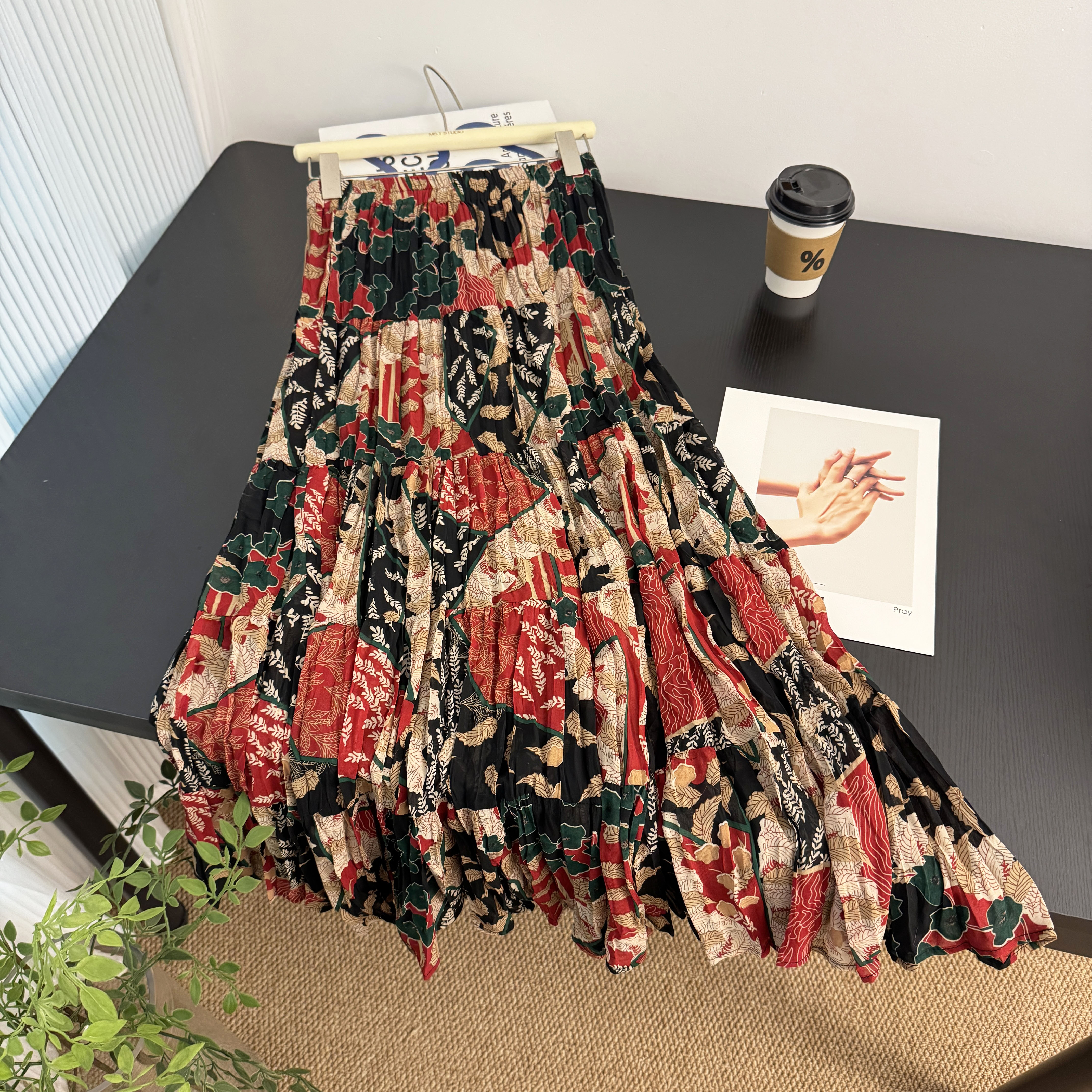 휴가 바람 프린트 쉬폰 주름 반신 스커트 여성 허리밴드 불규칙 빅 플레어 스커트 슬림해 보이는 연령 감소 꽃무늬 롱 스커트