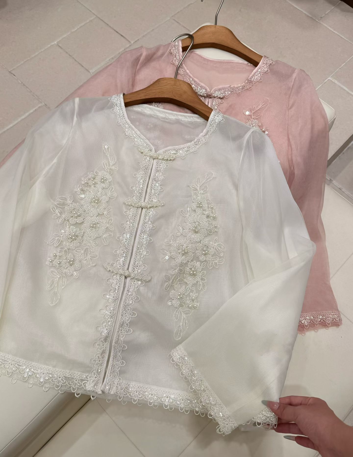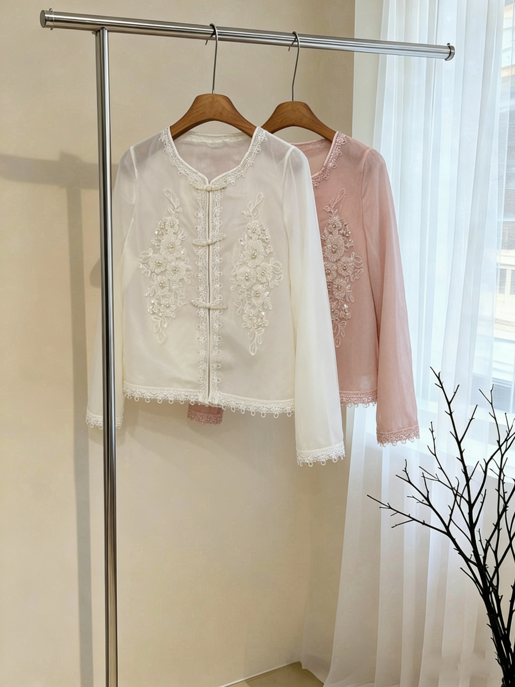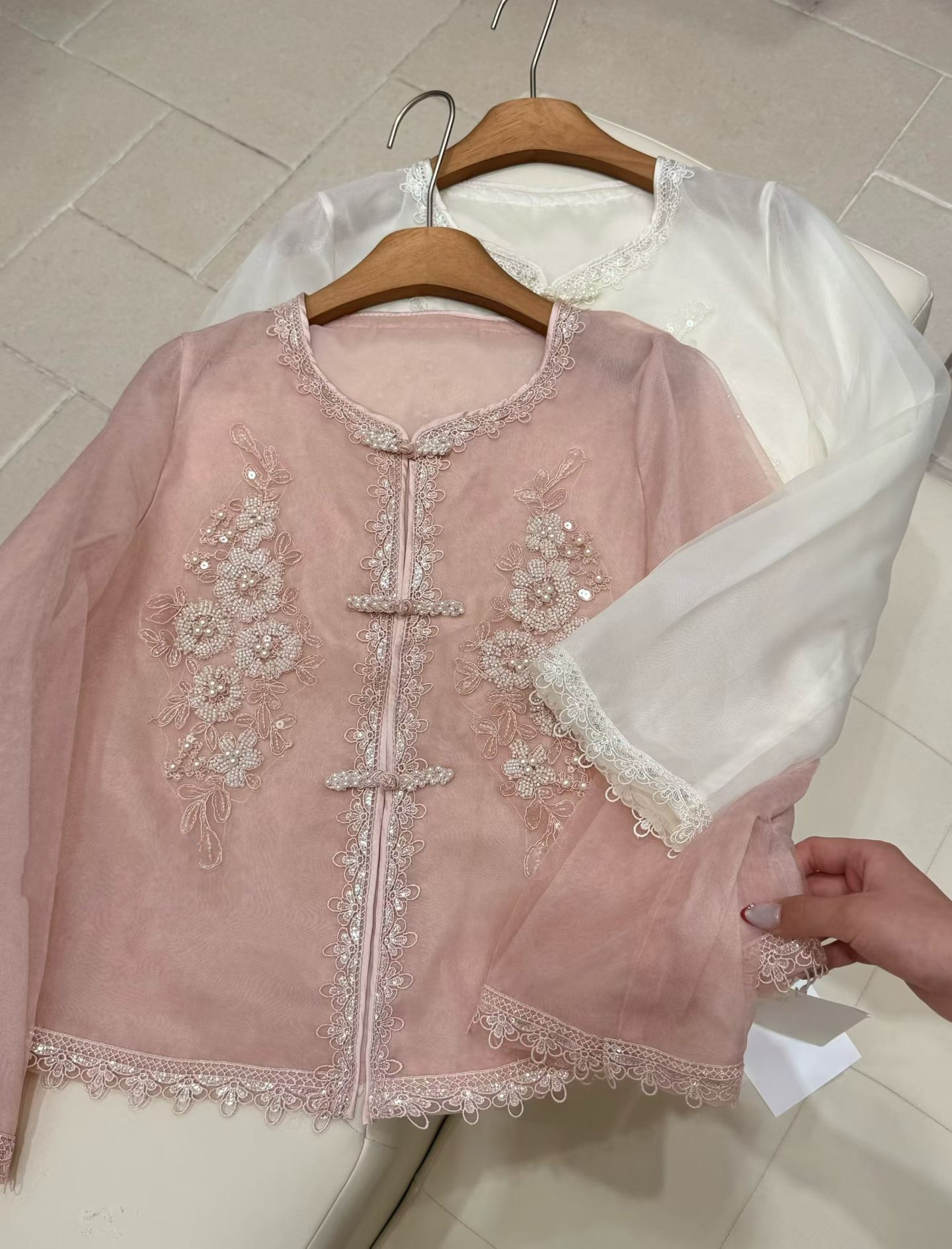 실사 새로운 중식 무거운 작업 비즈 박기 자수 유럽 오간자 얇은 스타일 여성 코트 2026 여름 품격 긴팔 자외선 차단 맨위